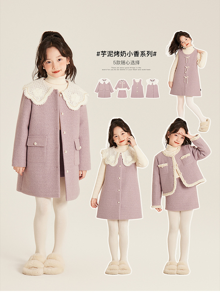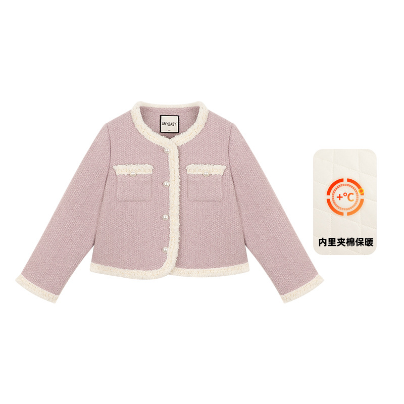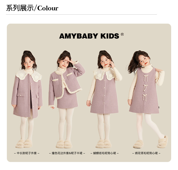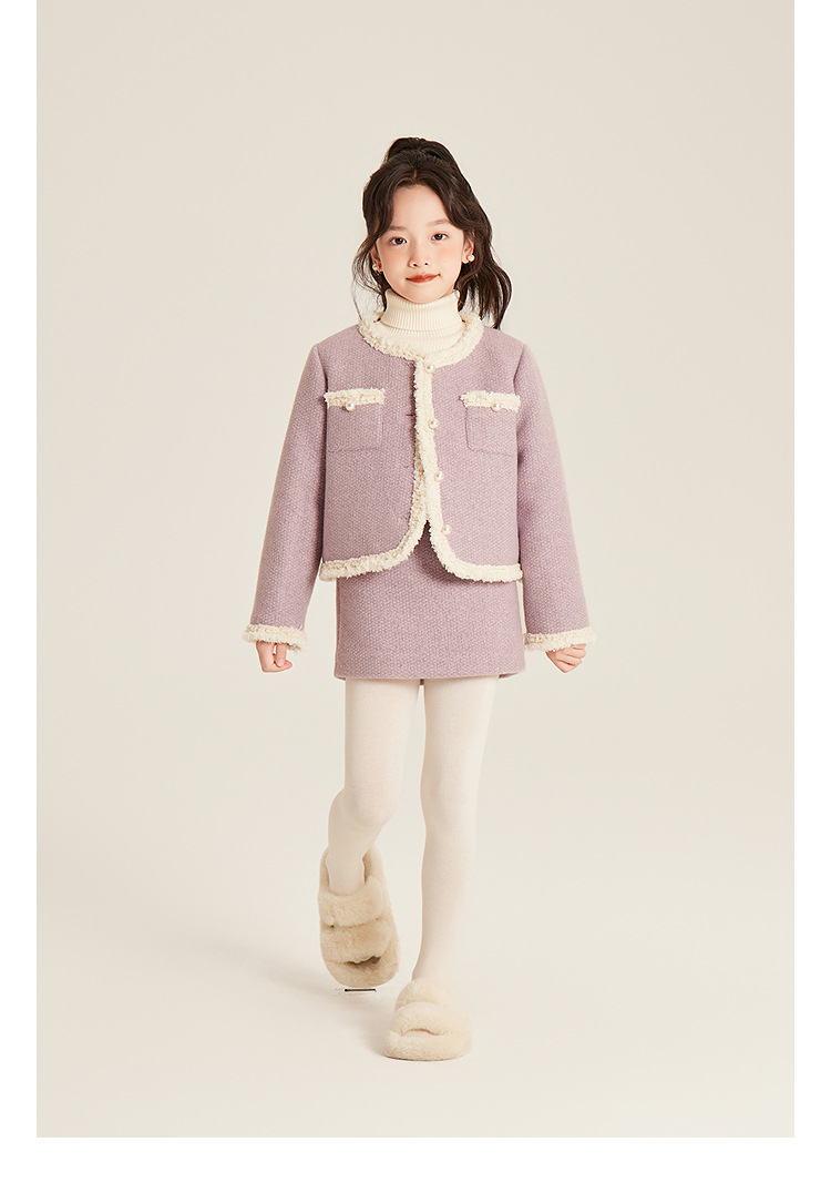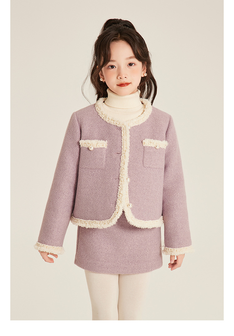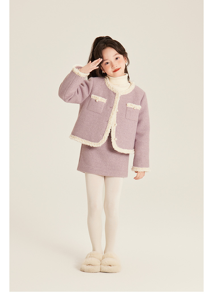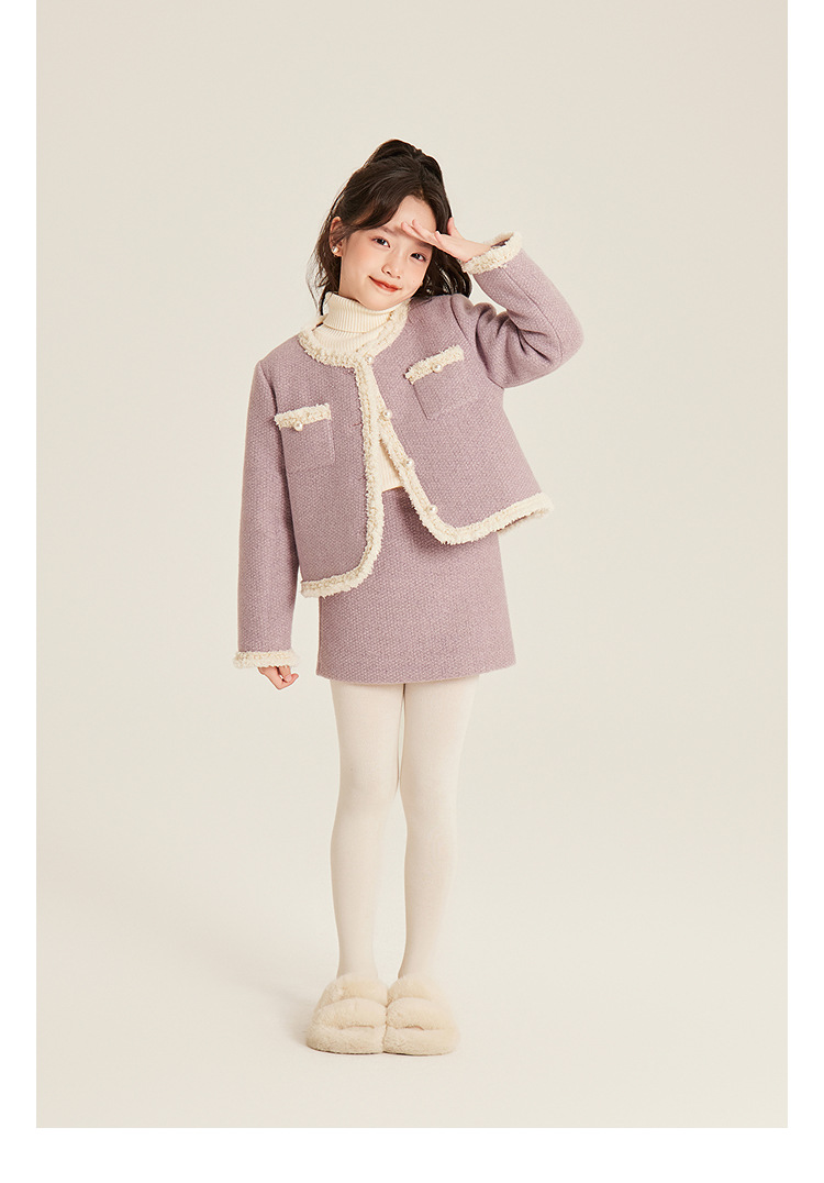 Amybaby Girl's 세트 겨울 2024 새로운 프랑스 스타일 샤넬 브레스트 대조 레이스 자켓 빅 스커트스토어 가기
