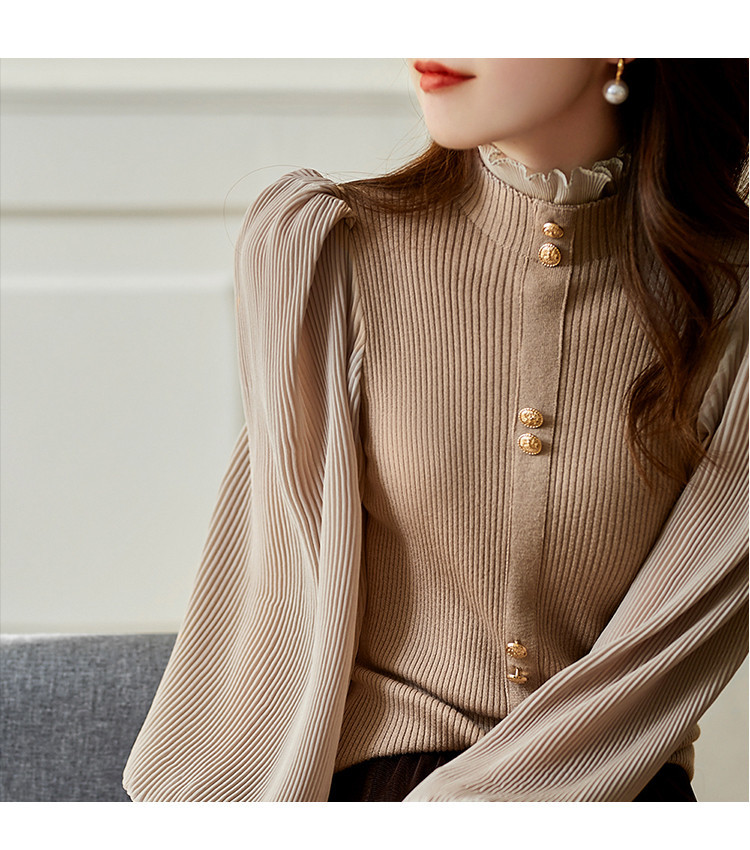 러플 쉬폰 패치 워크 스웨터 여성 2025 봄 새로운 스타일 서양식 탑 퍼프 슬리브 스웨터