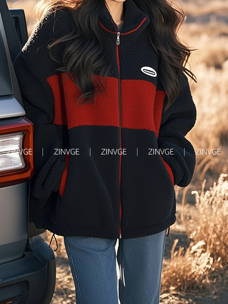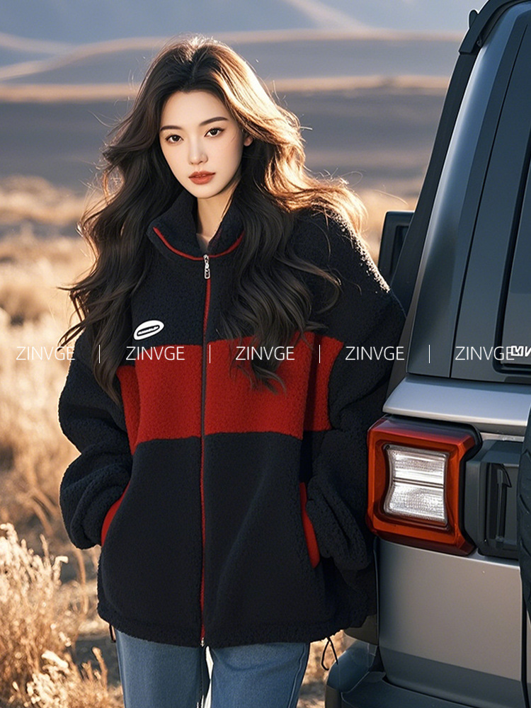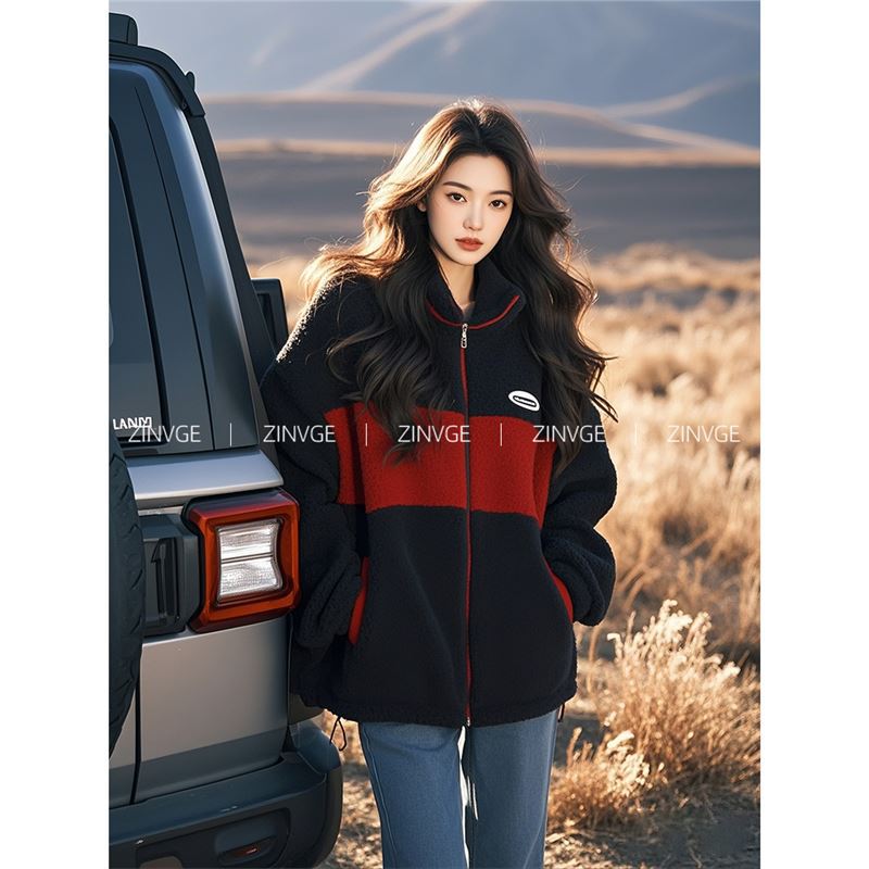 YT395729 깊은 겨울 샤넬 블랙과 레드 콘트라스트 컬러 양모 양털 수직 칼라 두꺼운 코트 2024 새로운 여성스토어 가기