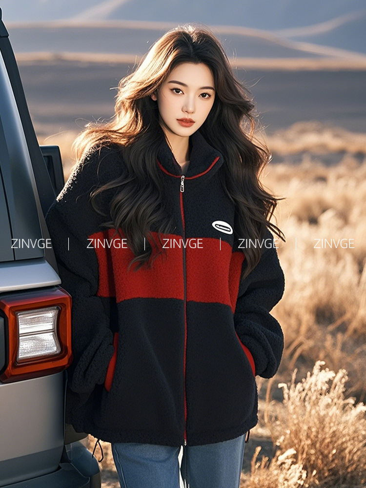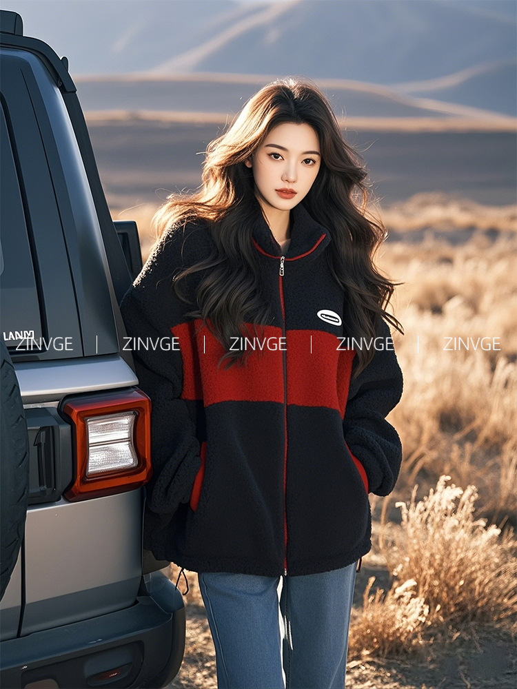 YT395729 깊은 겨울 샤넬 블랙과 레드 콘트라스트 컬러 양모 양털 수직 칼라 두꺼운 코트 2024 새로운 여성