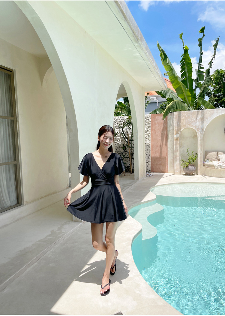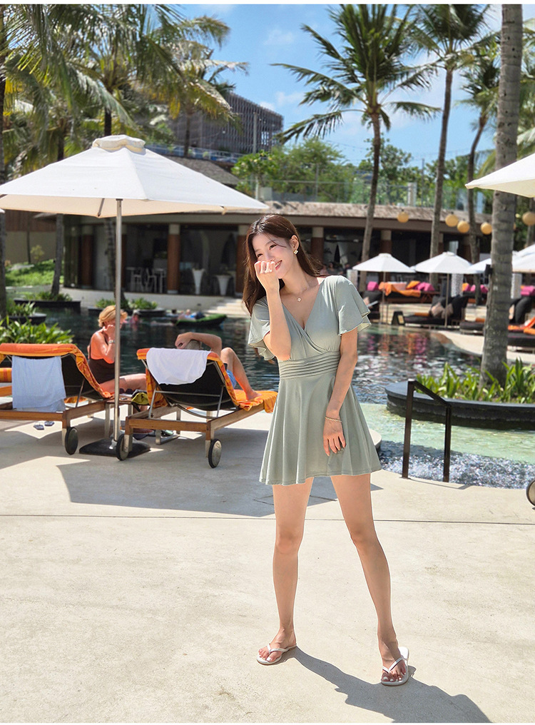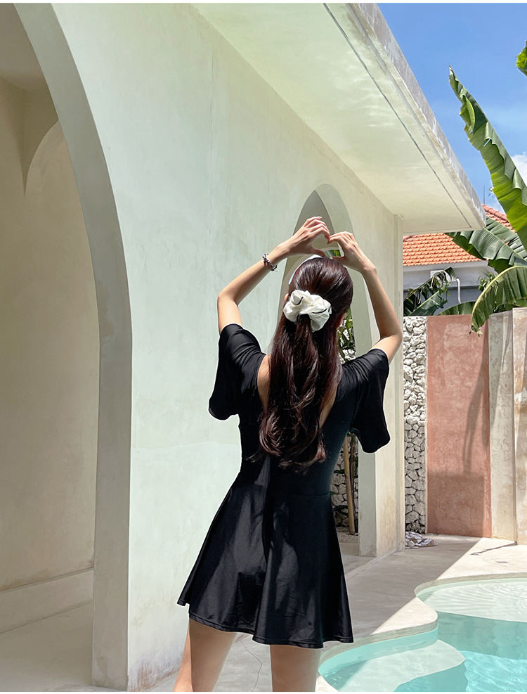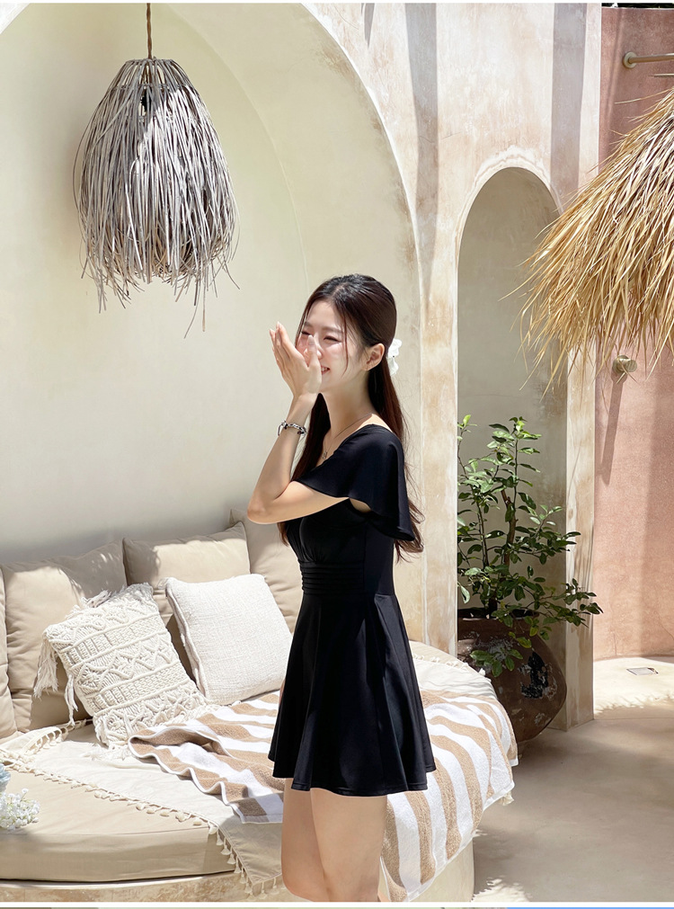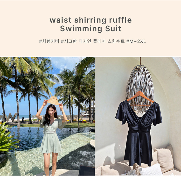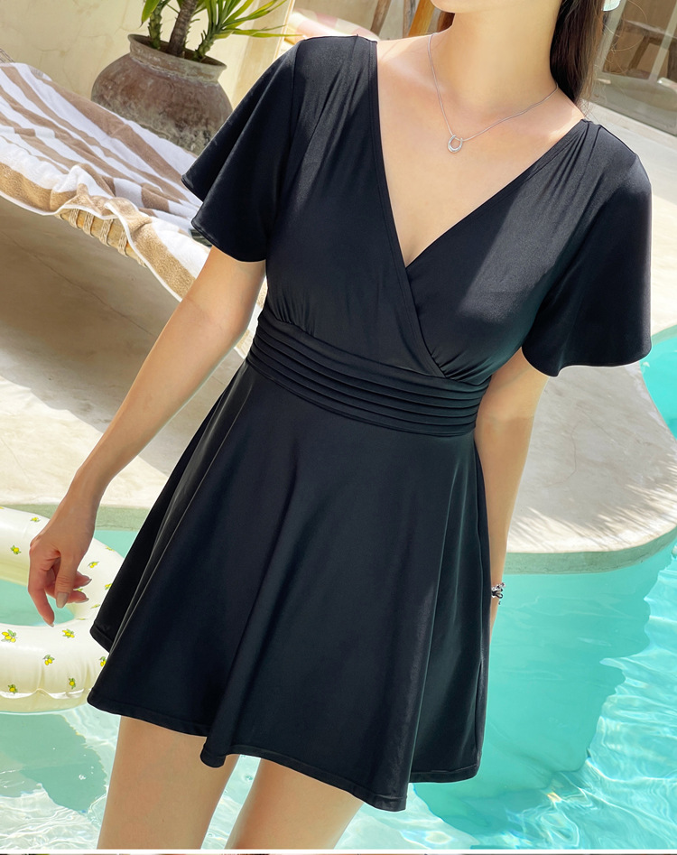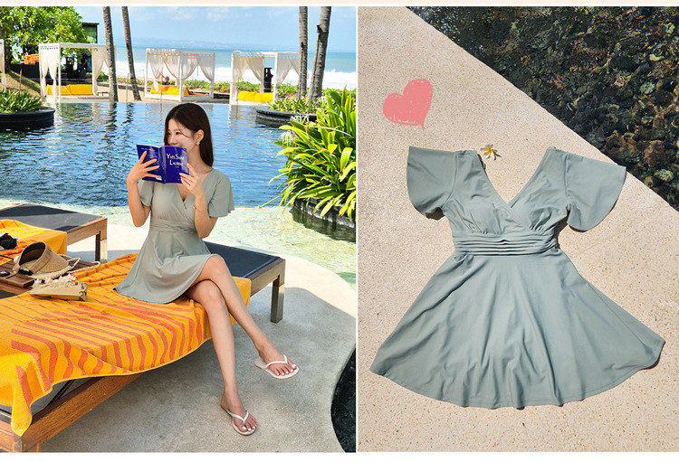 프랑스 패션 플러스 사이즈 원피스 수영복 여성용 V 넥 슬림 벨리 커버 플랫 앵글 온천 통통녀 어머니 솔리드 컬러 수영복스토어 가기