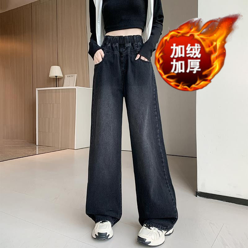 검은 멍청한 허리 유행 직선 기모 청바지 여성의 새로운 가을과 겨울 학생 슬리밍 모든 경기 넓은 다리 바지