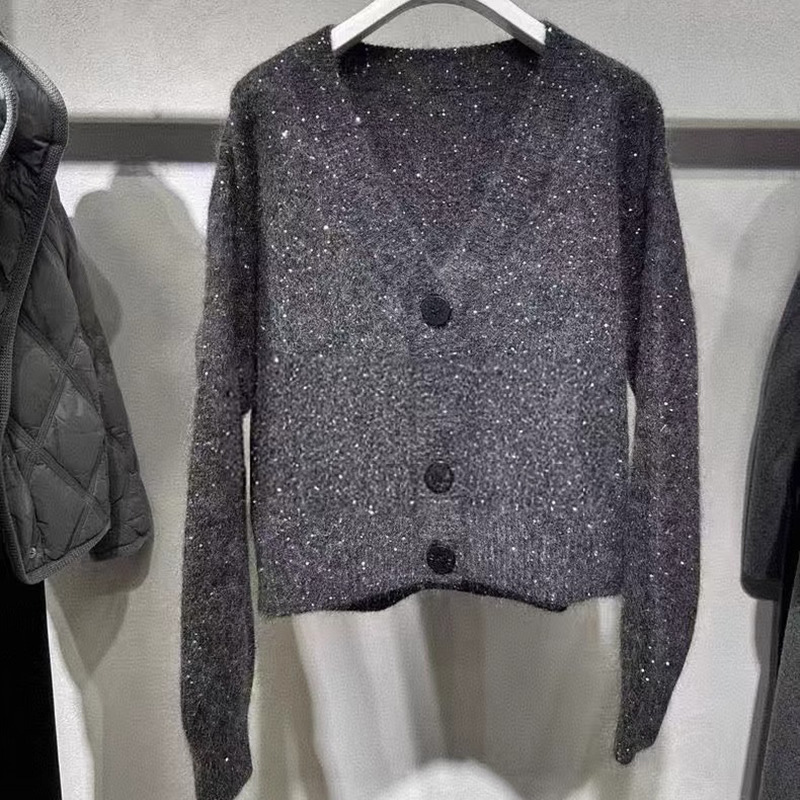 2024 겨울 새로운 회색 V 넥 올 매치 스팽글 긴 소매 니트 카디건 여자 1FC132081G스토어 가기