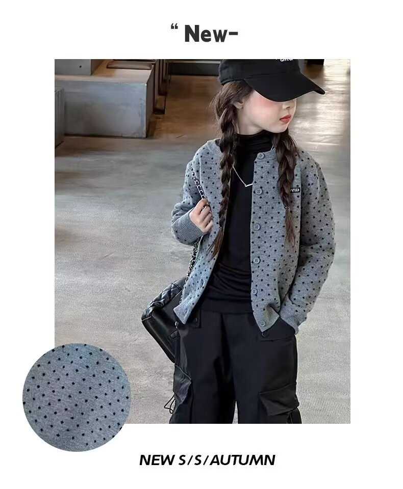 소녀 니트 코트 2024 새 스타일 소녀 서양식 카디건 어린이 가을 한국 스타일 올 매치 폴카 도트 탑