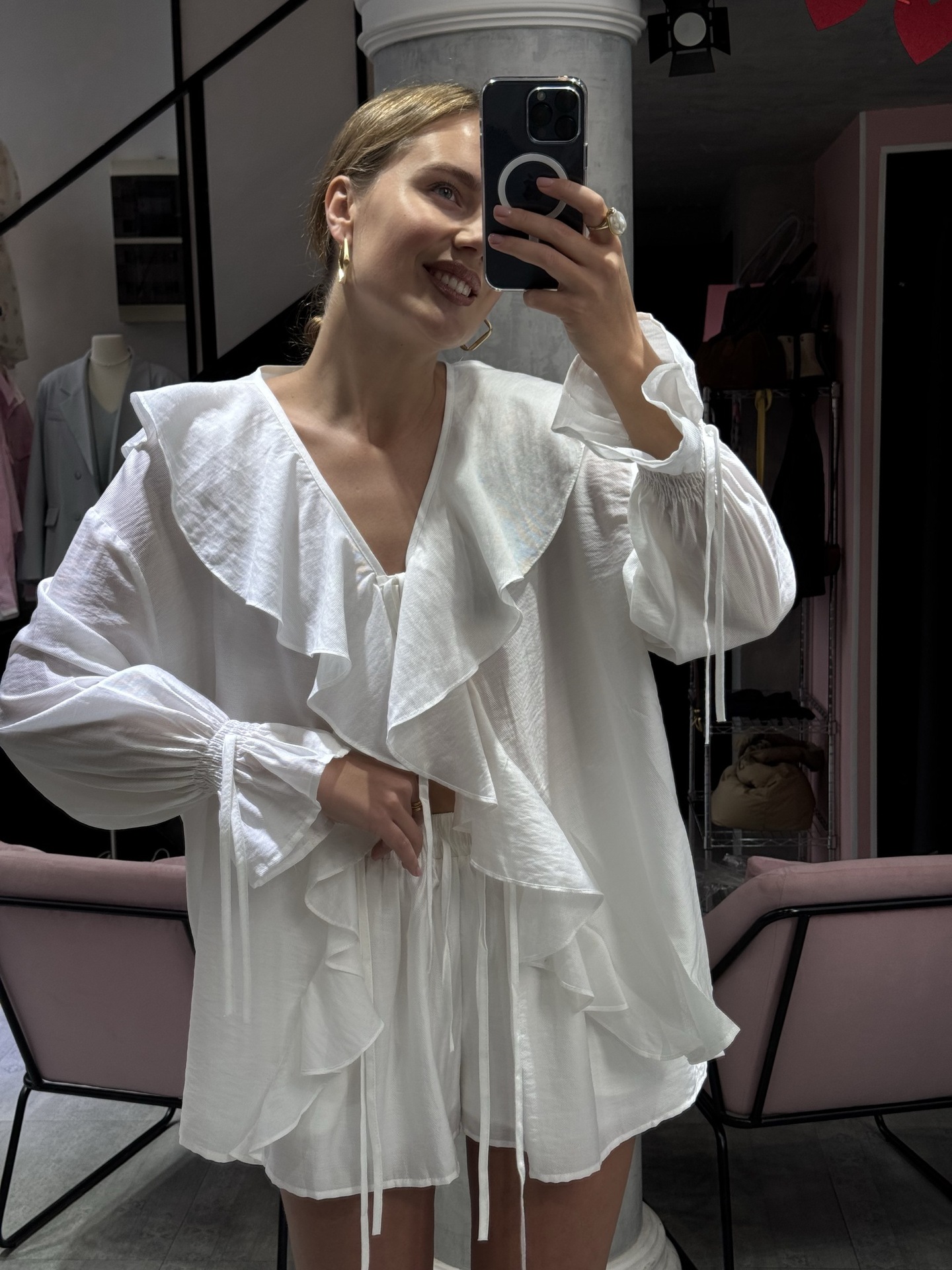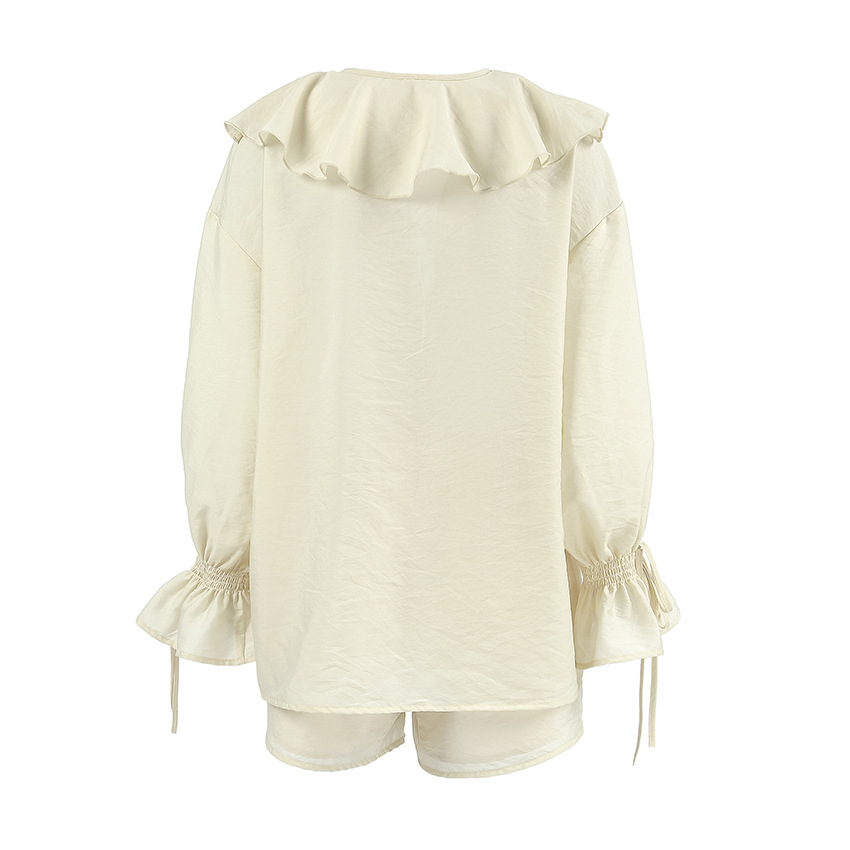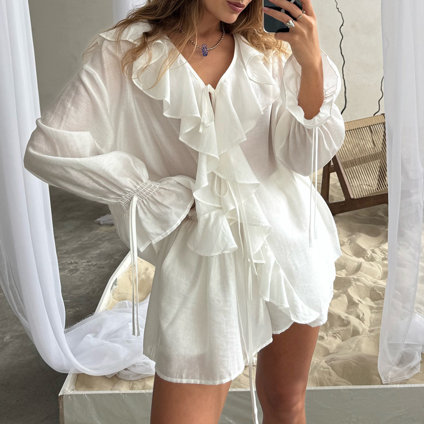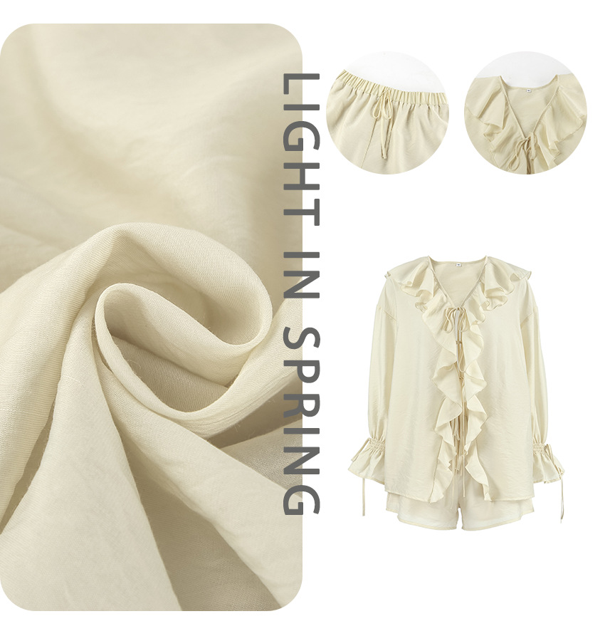 유럽과 미국의 디자인 감각 주름진 패션 캐주얼 세트 2025 년 봄과 여름 새로운 레이스 업 카디건 탑 반바지 여성 의류스토어 가기