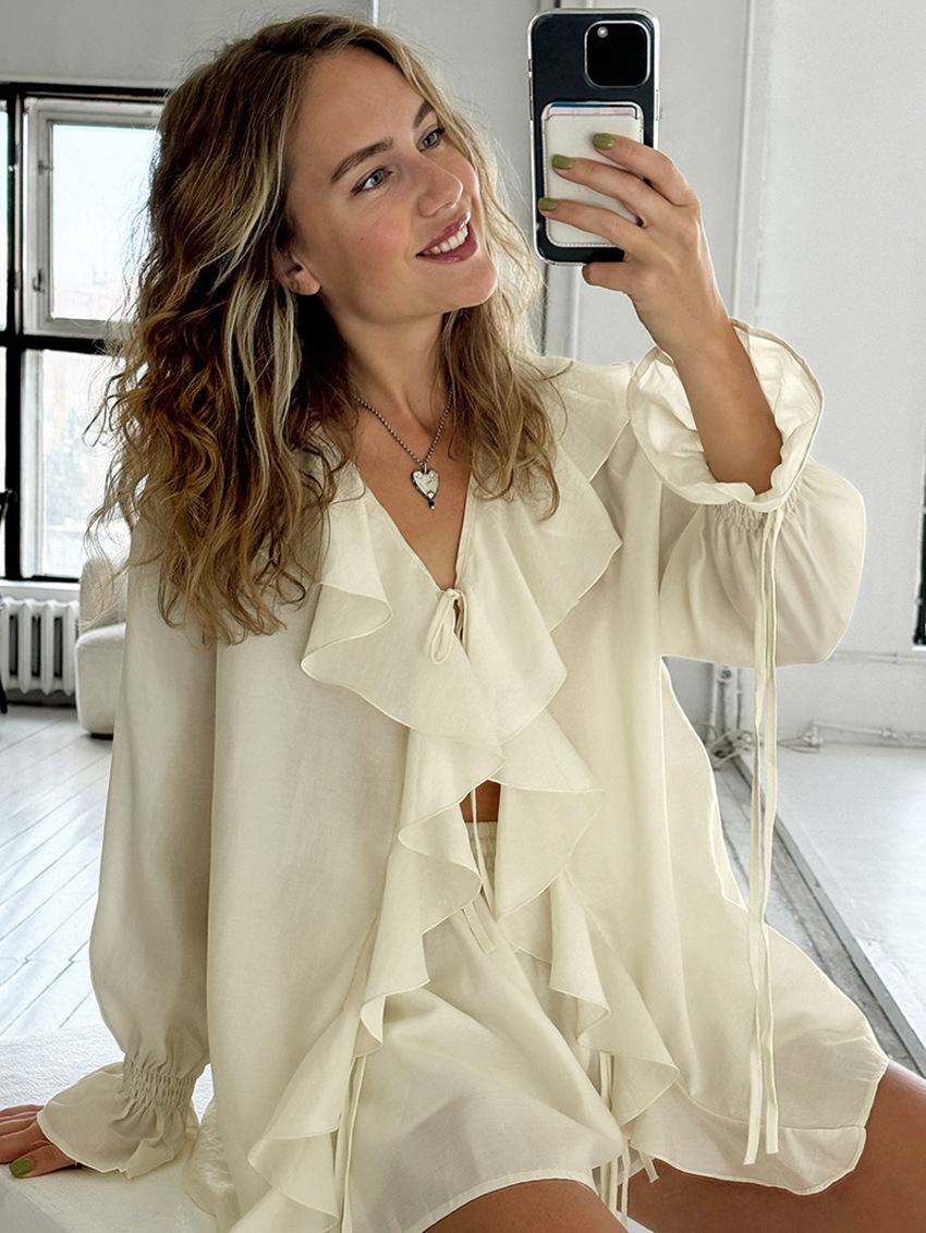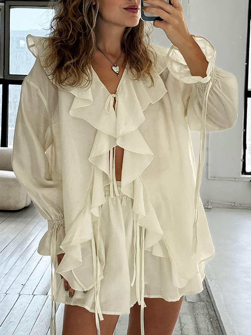 유럽과 미국의 디자인 감각 주름진 패션 캐주얼 세트 2025 년 봄과 여름 새로운 레이스 업 카디건 탑 반바지 여성 의류