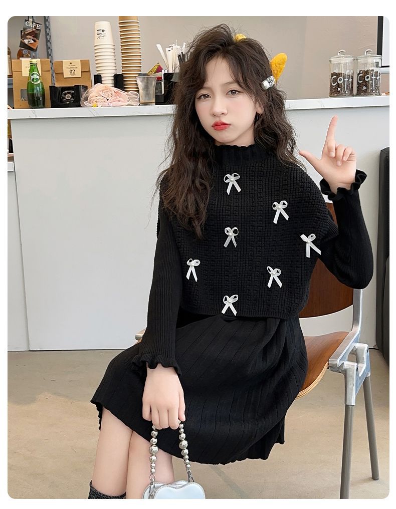 소녀 원피스 가을 겨울 새로운 한국 스타일 유행 중 큰 어린이 니트 조끼 투피스 세트 어린이 단색 스웨터 원피스