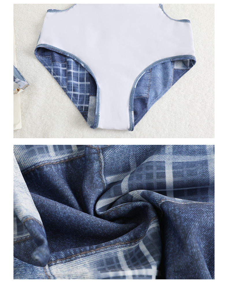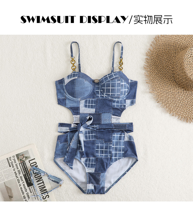 2025 새로운 아름다운 온천 수영복 허리에 노출 된 원피스 비치 데님 체크 무늬 마이크로 숄더 백리스 하이 엔드 백리스