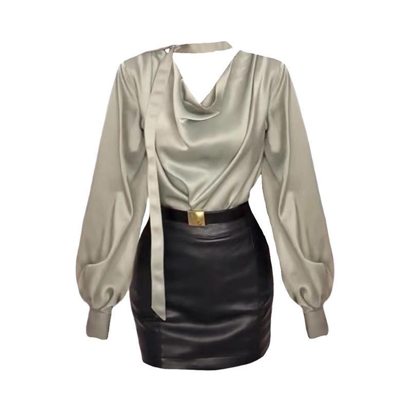 고급 프랑스 연두색 광택 셔츠 여성의 봄과 가을 2024 엉덩이 가죽 스커트 세트 패션