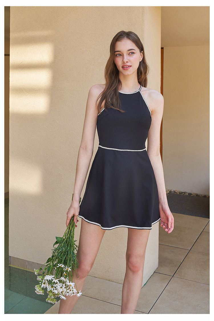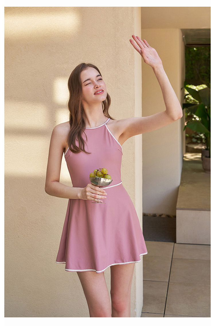 프랑스 스타일 수영복 우아한 솔리드 컬러 슬리밍 백리스 스커트 스타일 보수적 인 소녀 민소매 휴가 수영복 스타일스토어 가기
