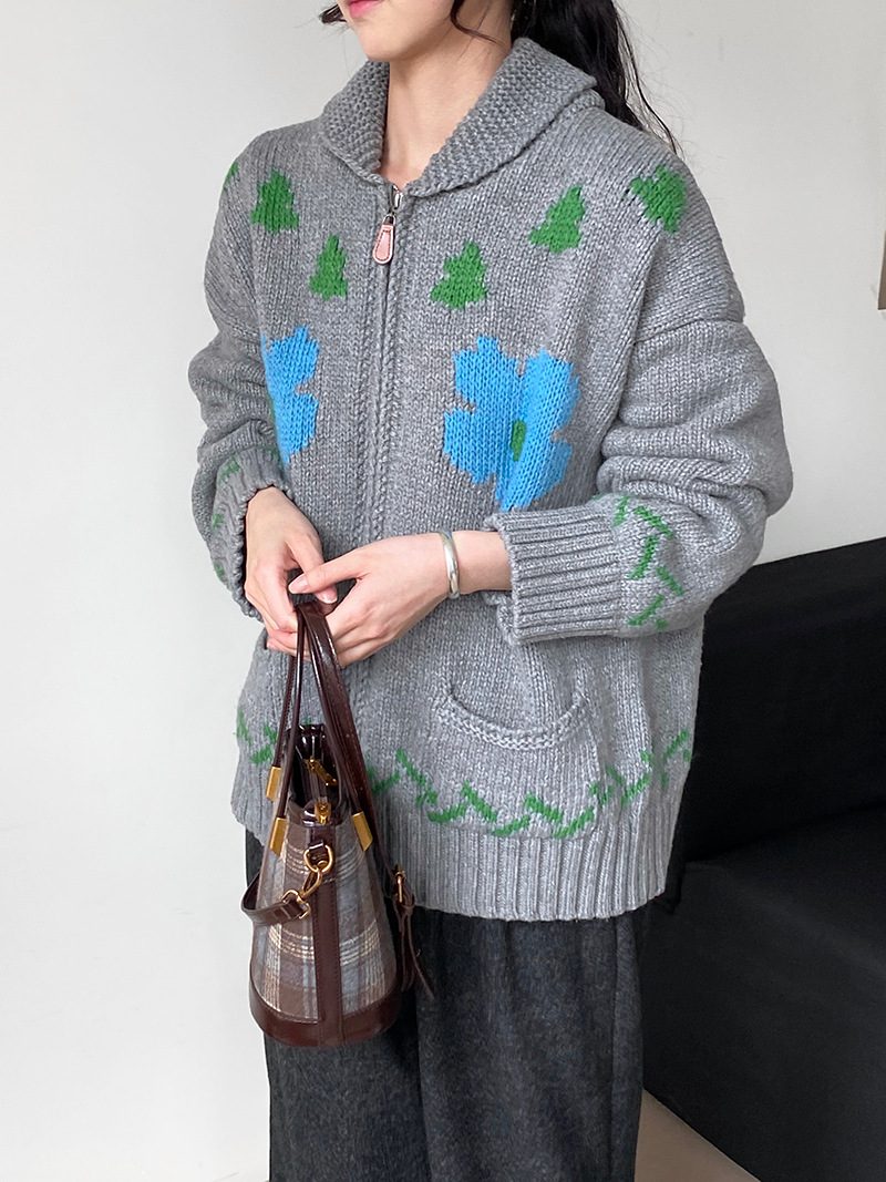여성의 붉은 새해 빈티지 프린트 니트 카디건 Y1184 의 코트로 사용할 수있는 두꺼운 스웨터