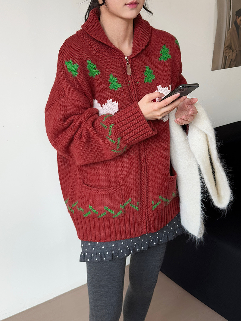여성의 붉은 새해 빈티지 프린트 니트 카디건 Y1184 의 코트로 사용할 수있는 두꺼운 스웨터스토어 가기