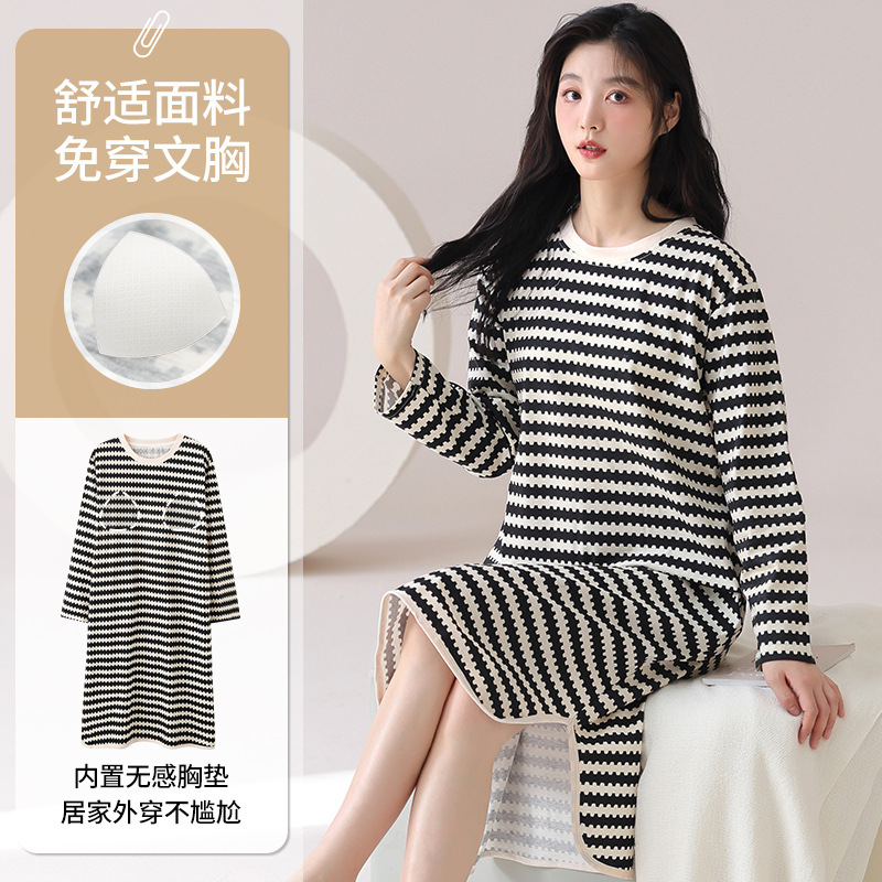모조 면 긴 원피스 가슴 패드 잠옷 여성용 봄 줄무늬 간단한 긴 소매 라운드 넥 아웃웨어 여자 잠옷 롱 원피스