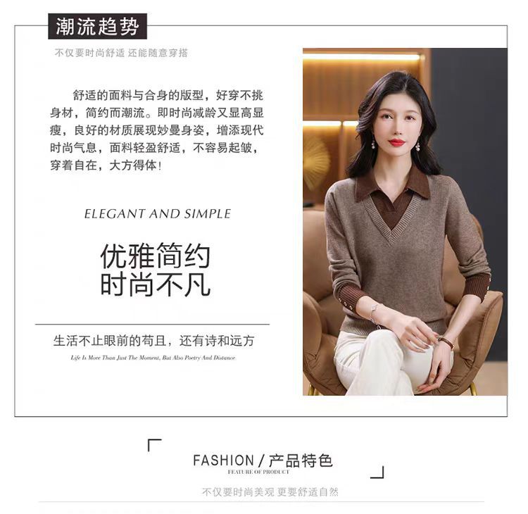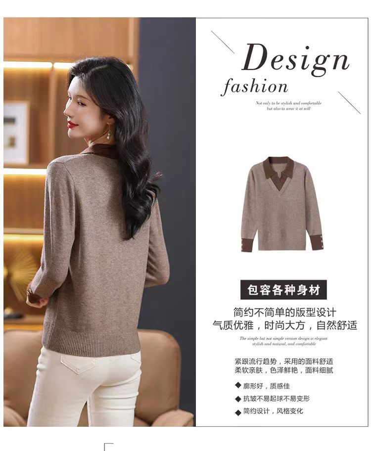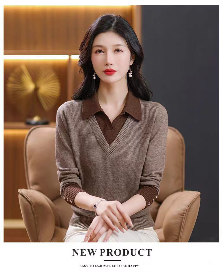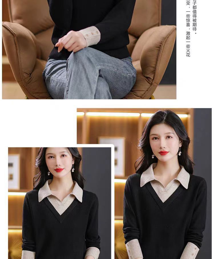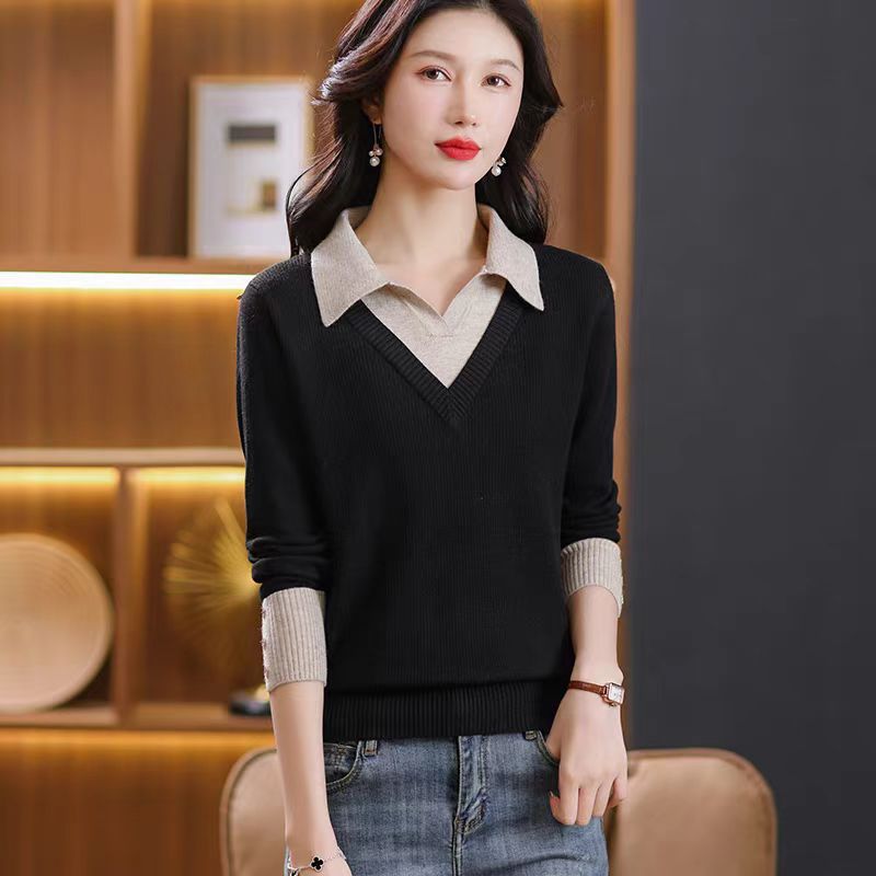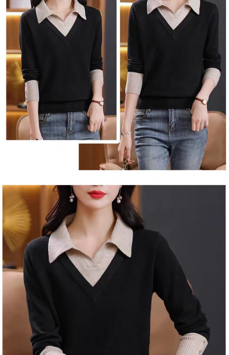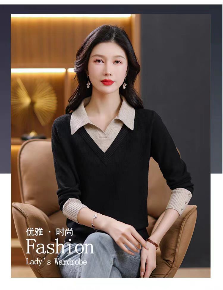 가짜 투피스 탑 여성의 2025 년 초가을 새 도착 스웨터 유행 세련된 짧은 옷깃 스웨터베이스 셔츠 봄 가을스토어 가기
