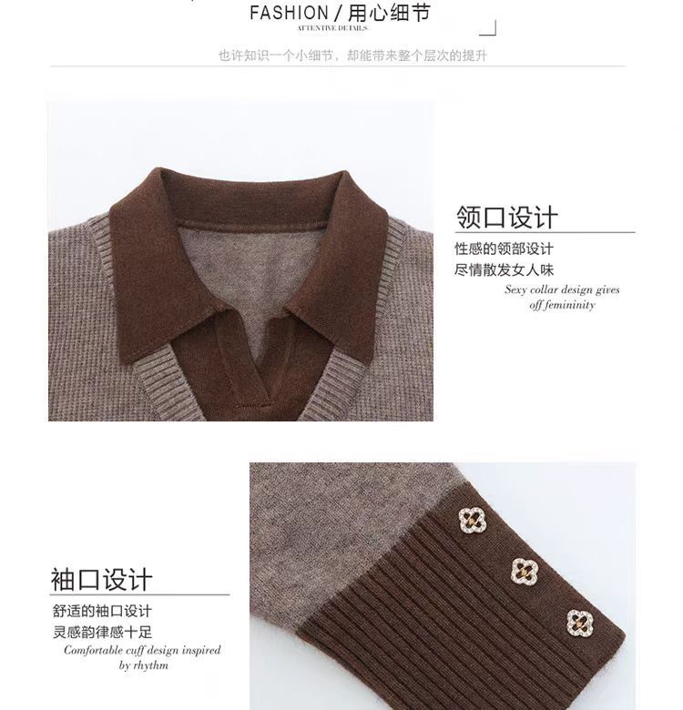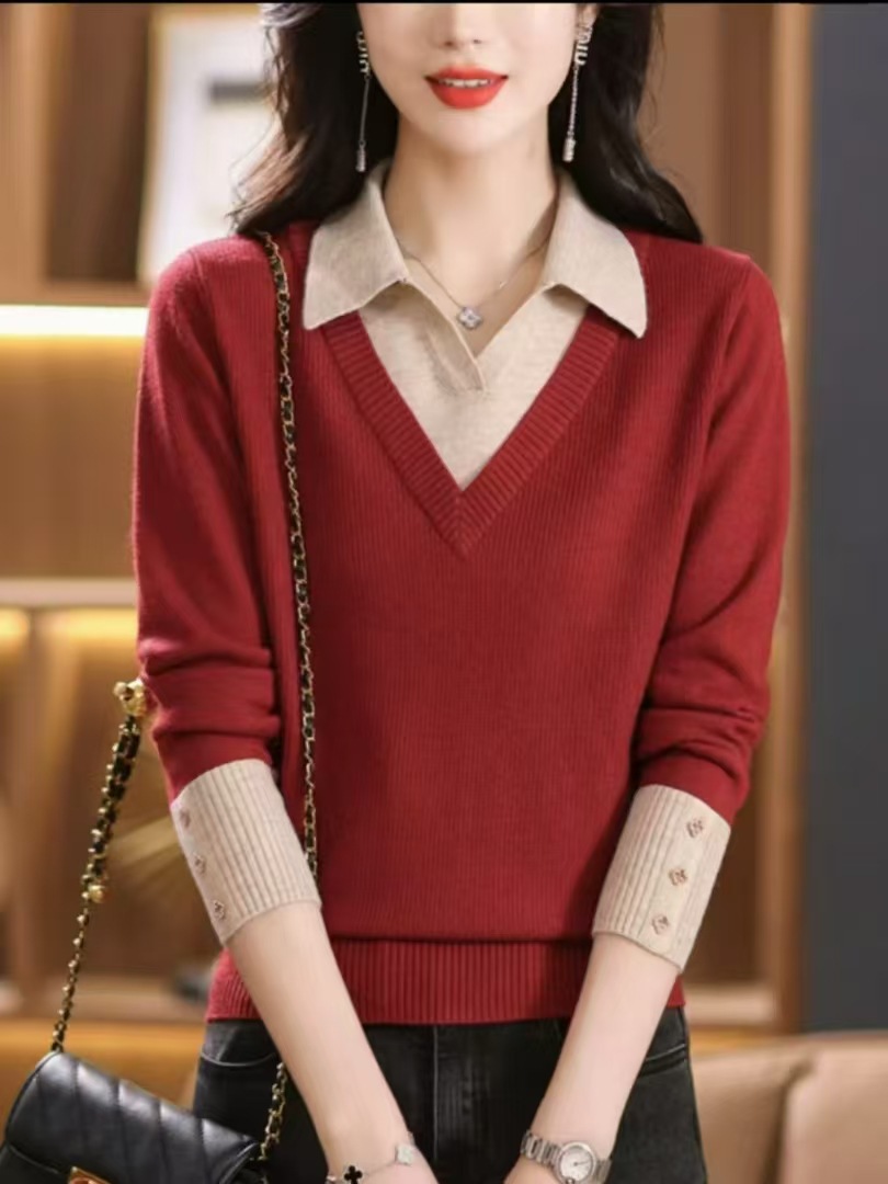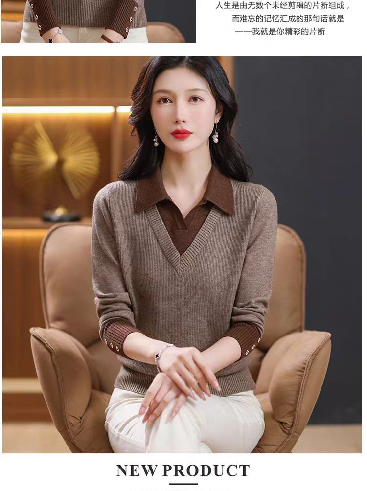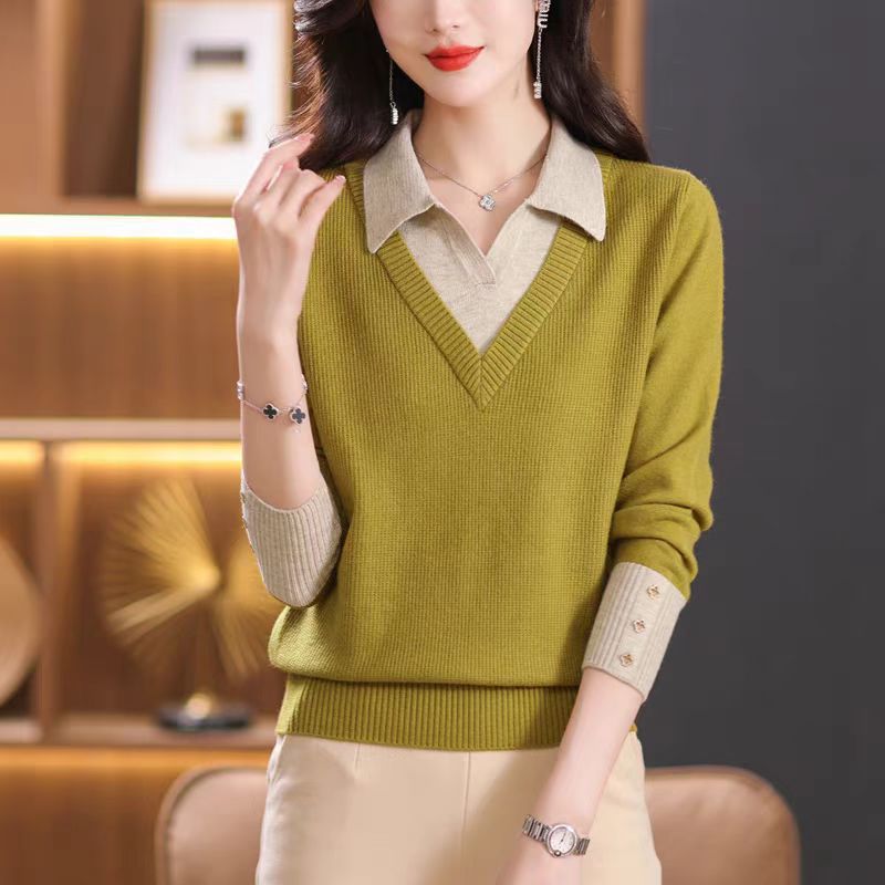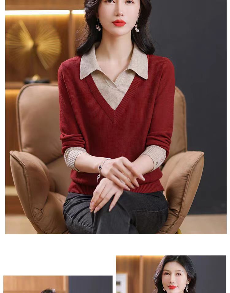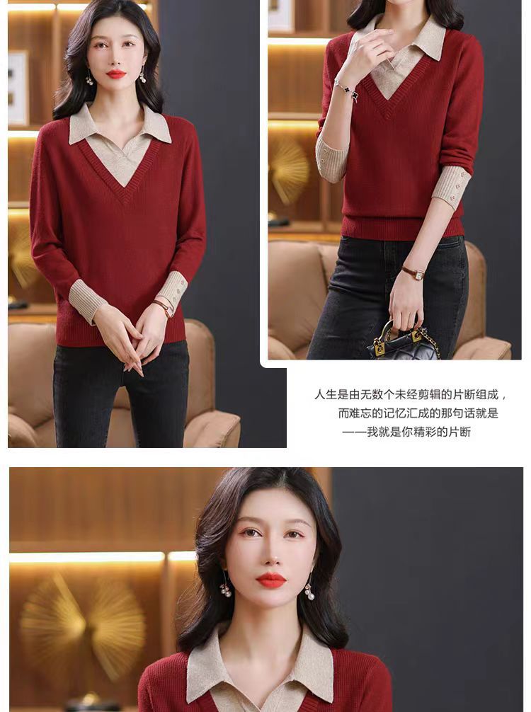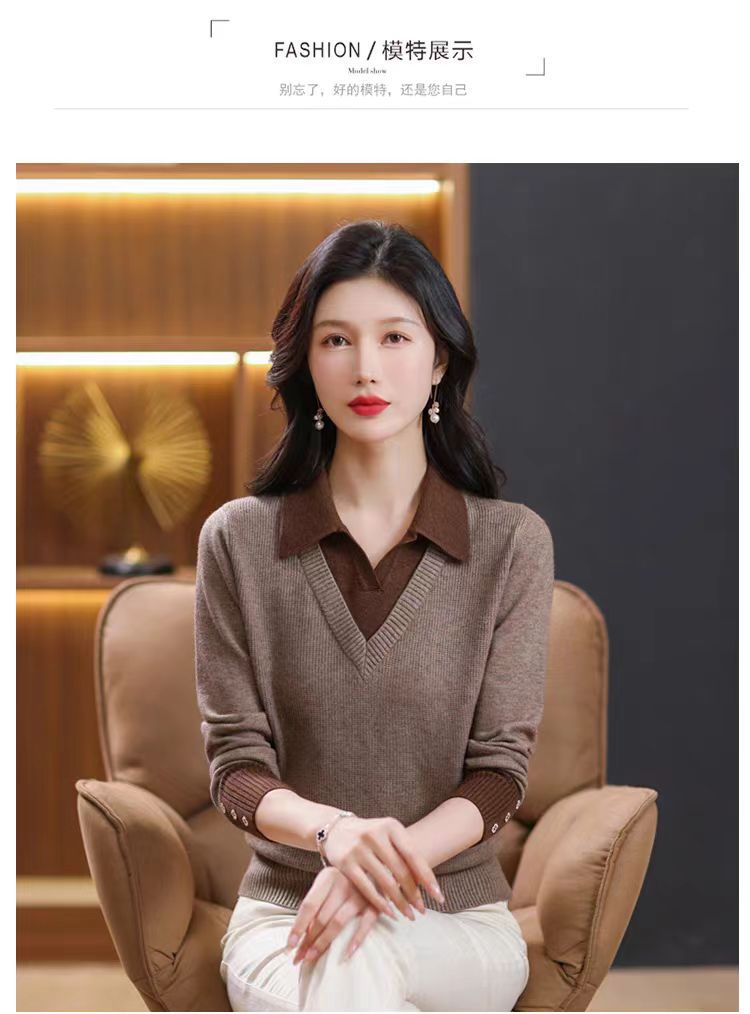 가짜 투피스 탑 여성의 2025 년 초가을 새 도착 스웨터 유행 세련된 짧은 옷깃 스웨터베이스 셔츠 봄 가을스토어 가기