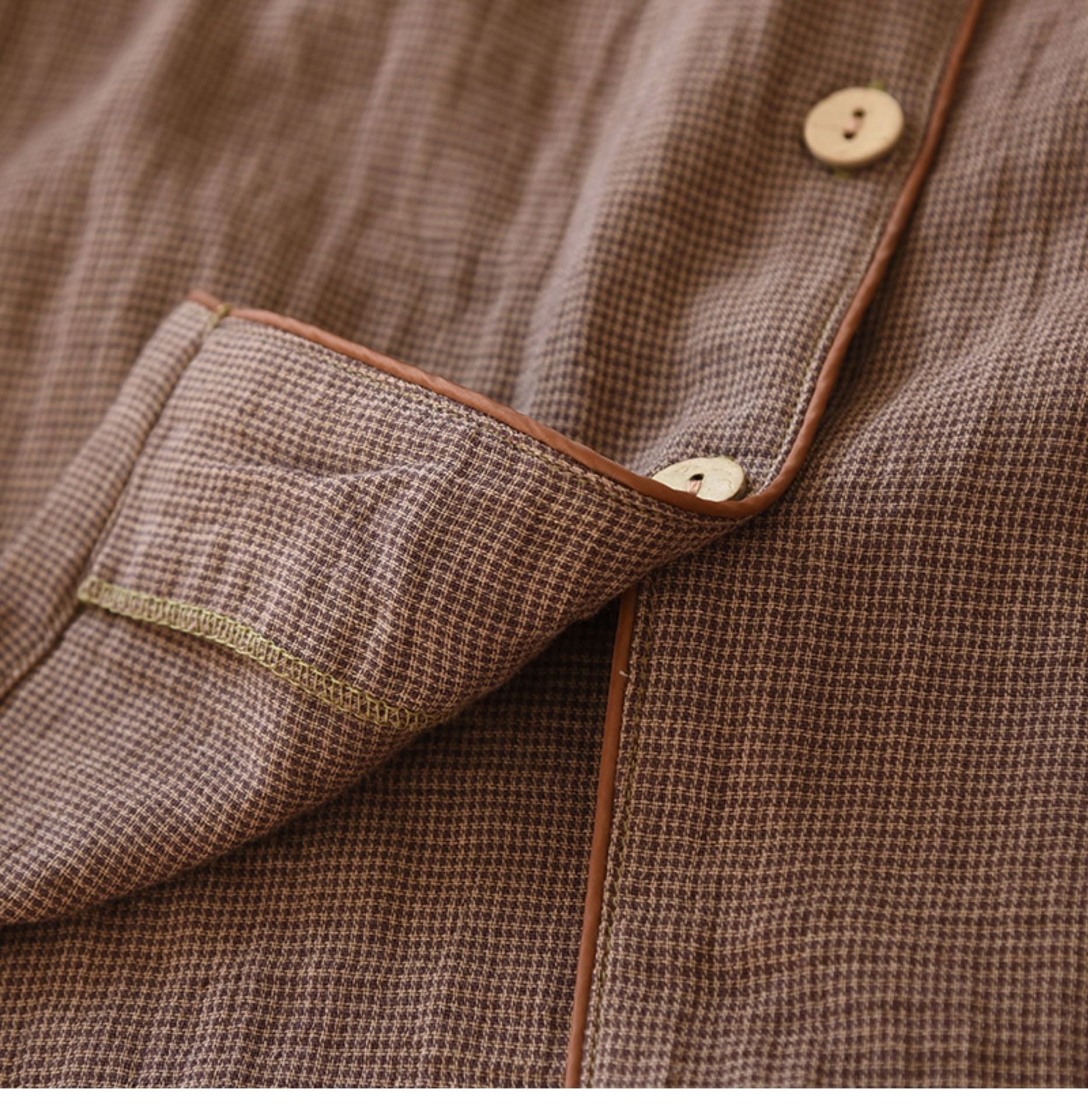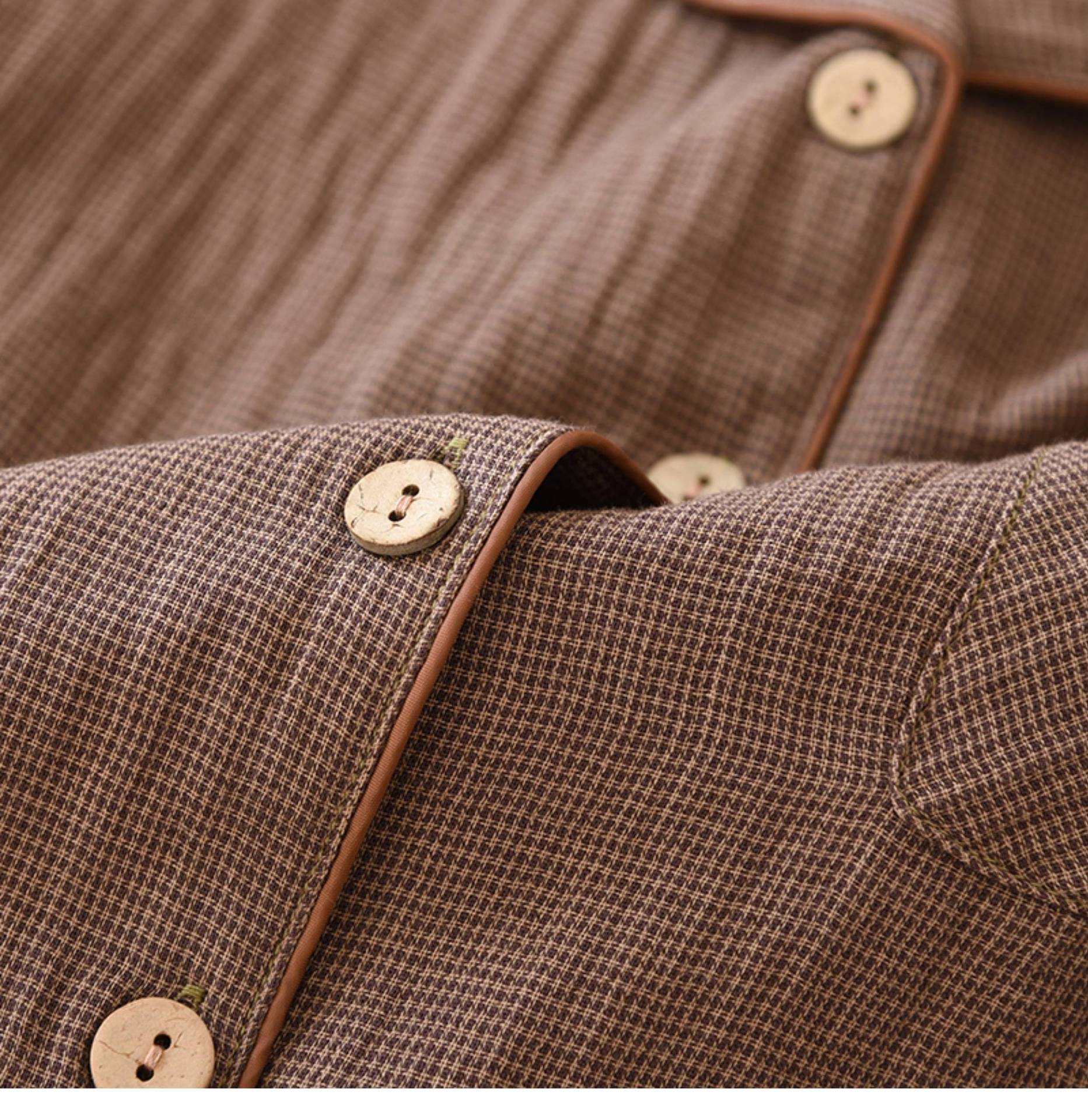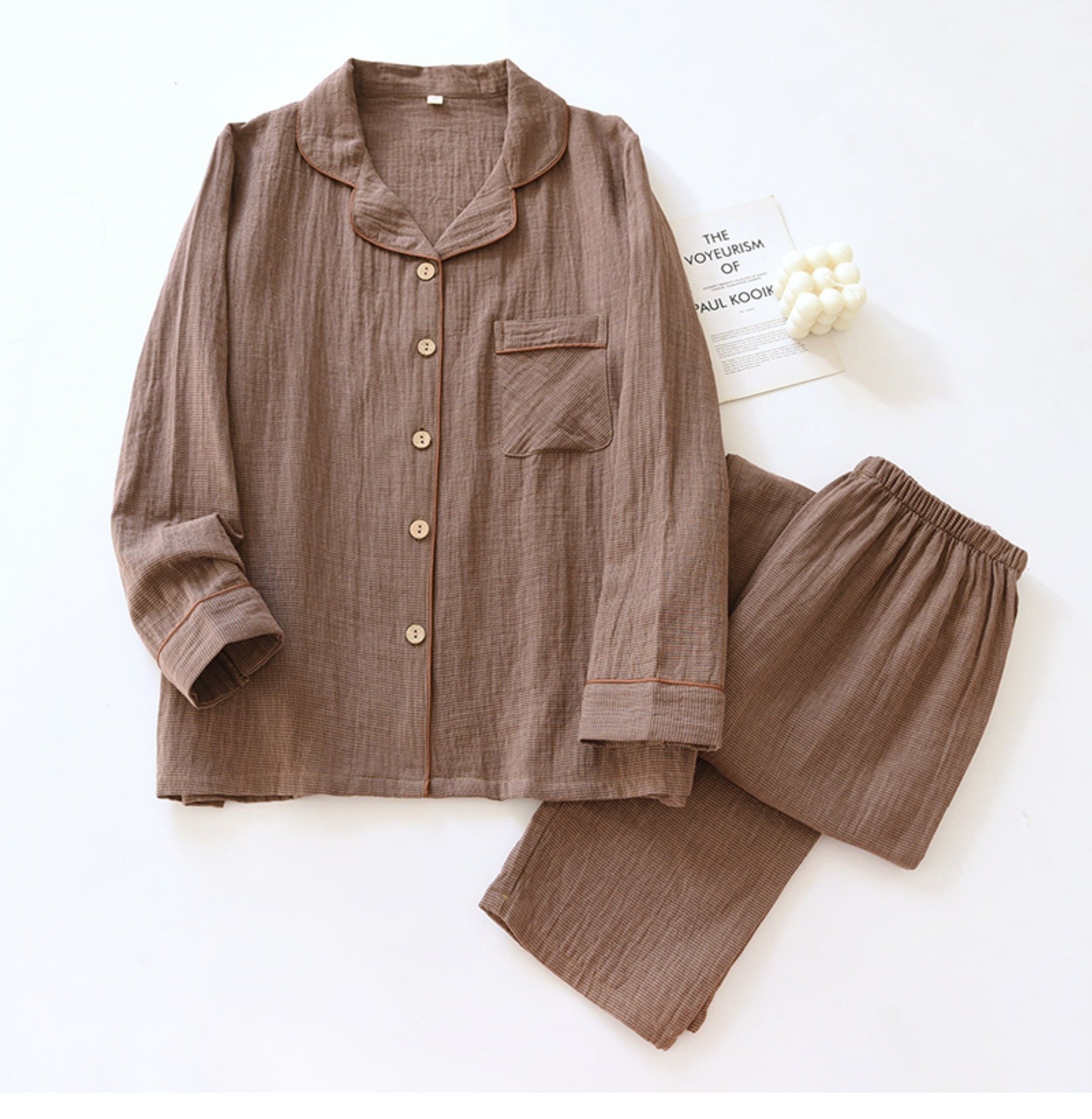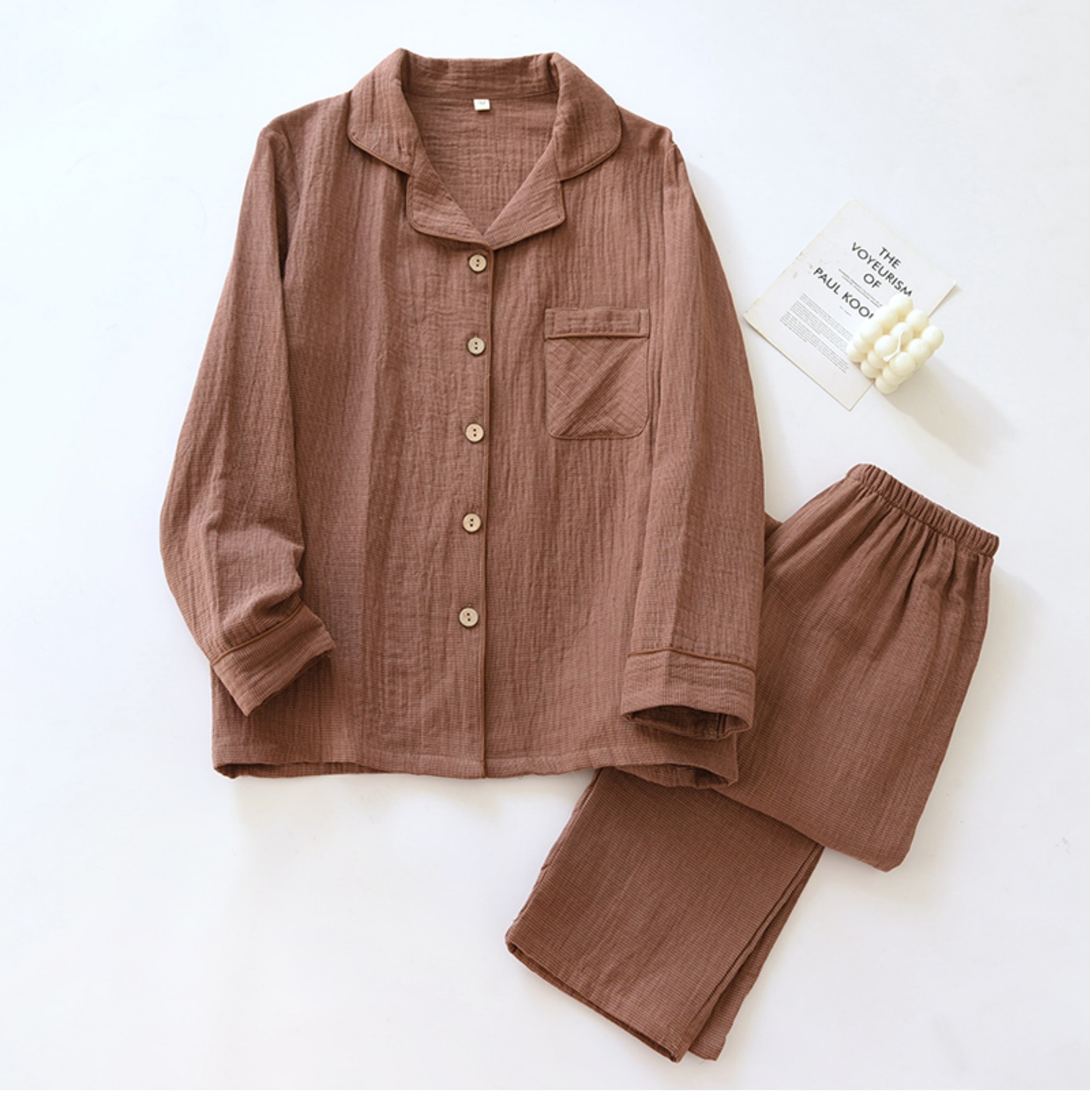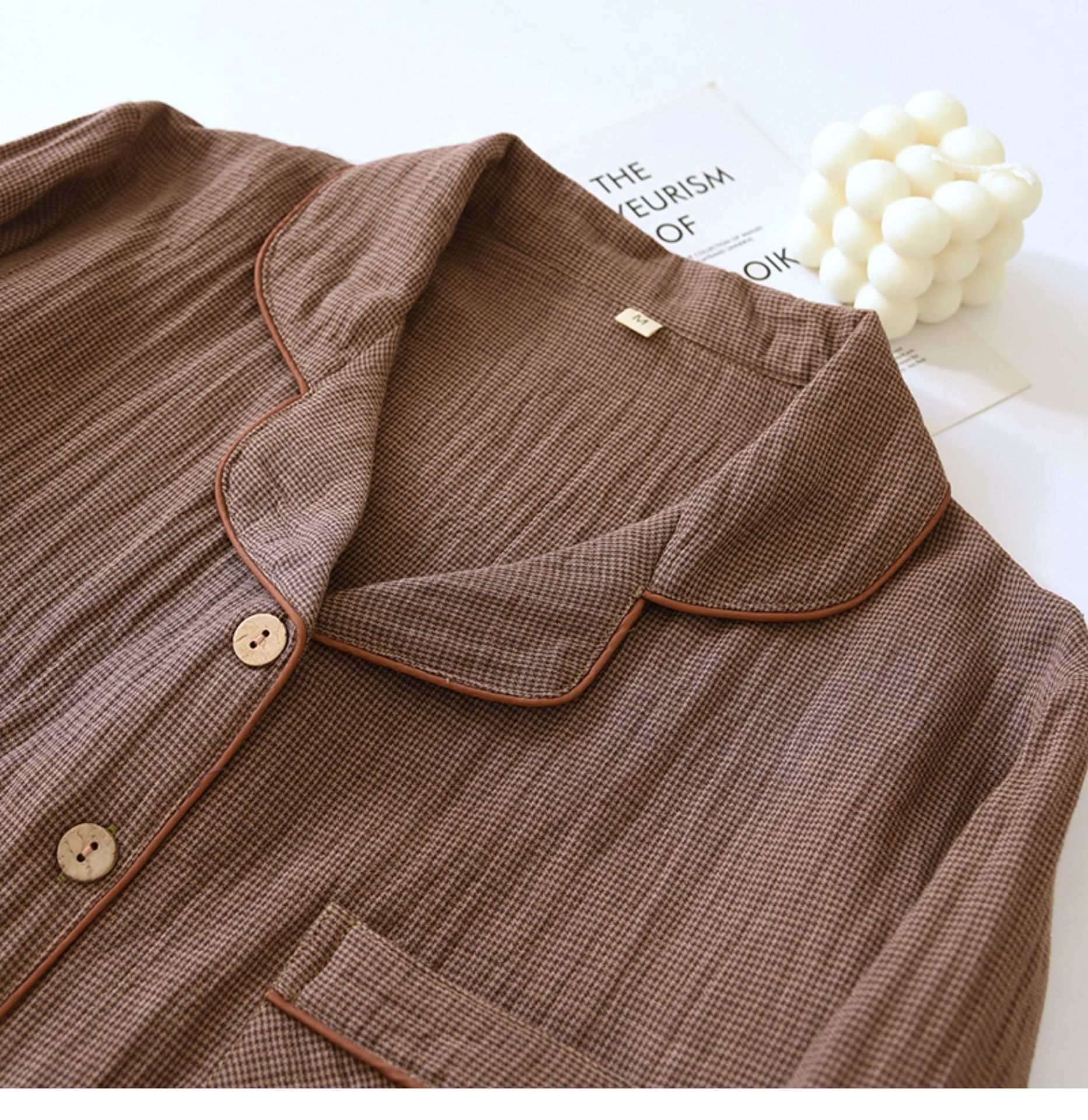 봄과 가을 커플 원사 염색 퓨어 코튼 파자마 간단한 긴팔 카디건 홈 의류 세트 더블 레이어 거즈 루즈 남성과 여성을위한스토어 가기