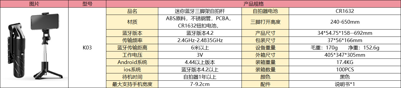 K03 휴대용 미니 셀카 스틱 안티 쉐이크 라이트 원격 제어 블루투스 라이브 데스크탑 삼각대 휴대 전화 홀더