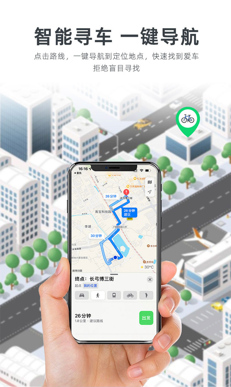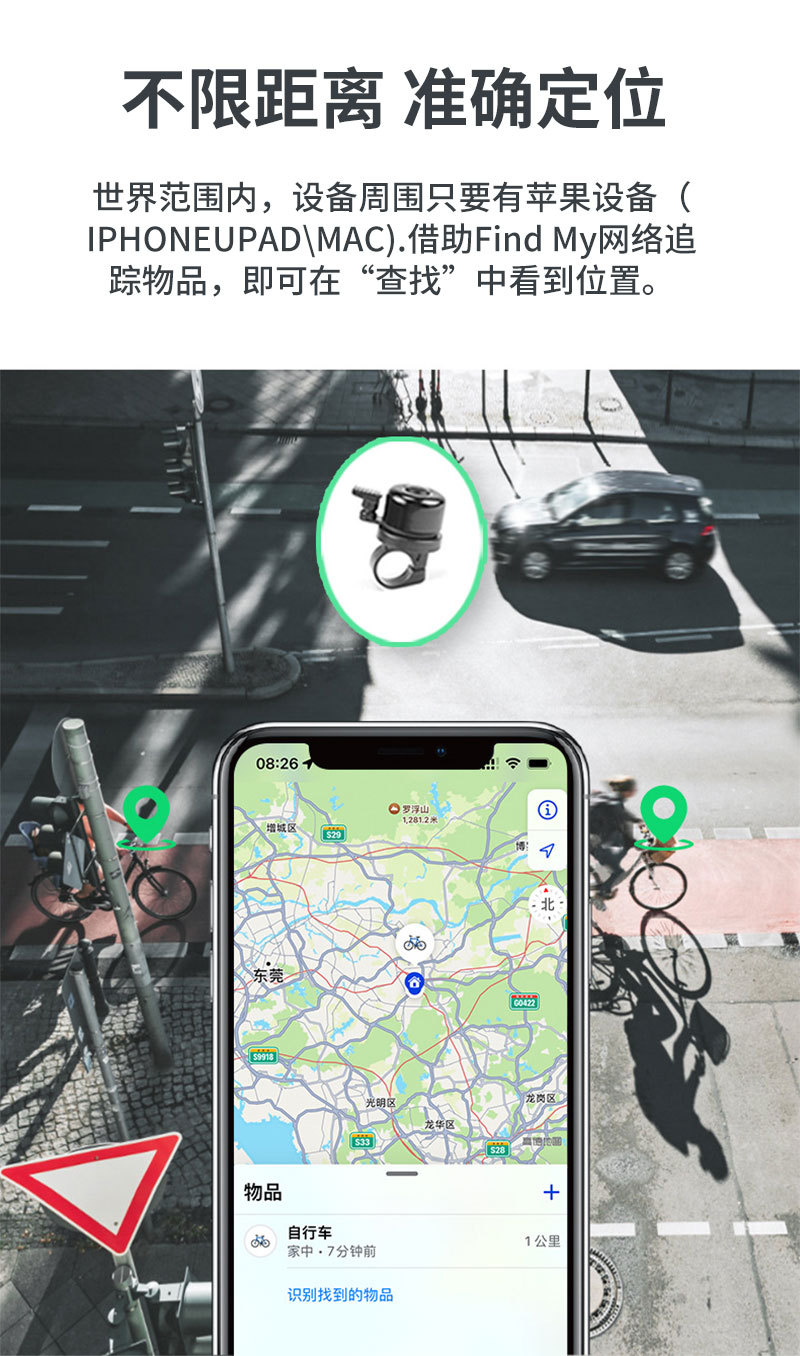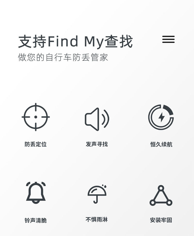 产品描述:本产品是经苹果官方授权,利用苹果Findmy技术,借用苹果IOS系统生态,深层打通,连接各种苹果设备,应用于各类自行车的一款精准位置查寻、防丢产品。