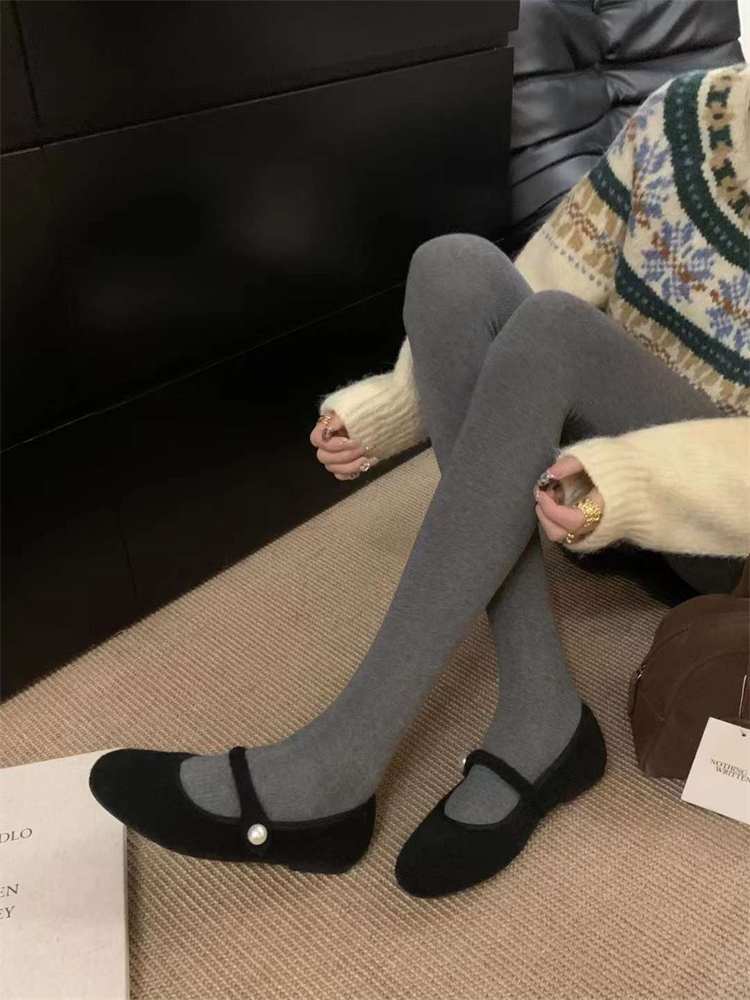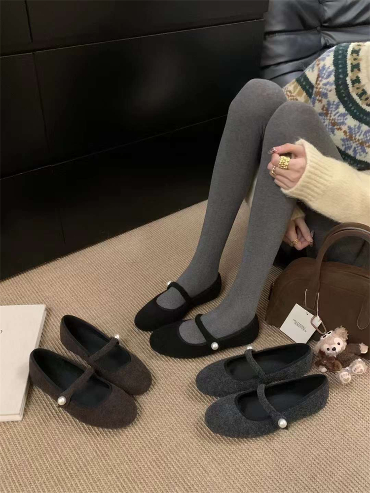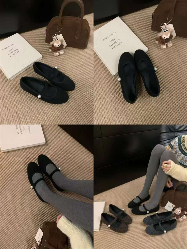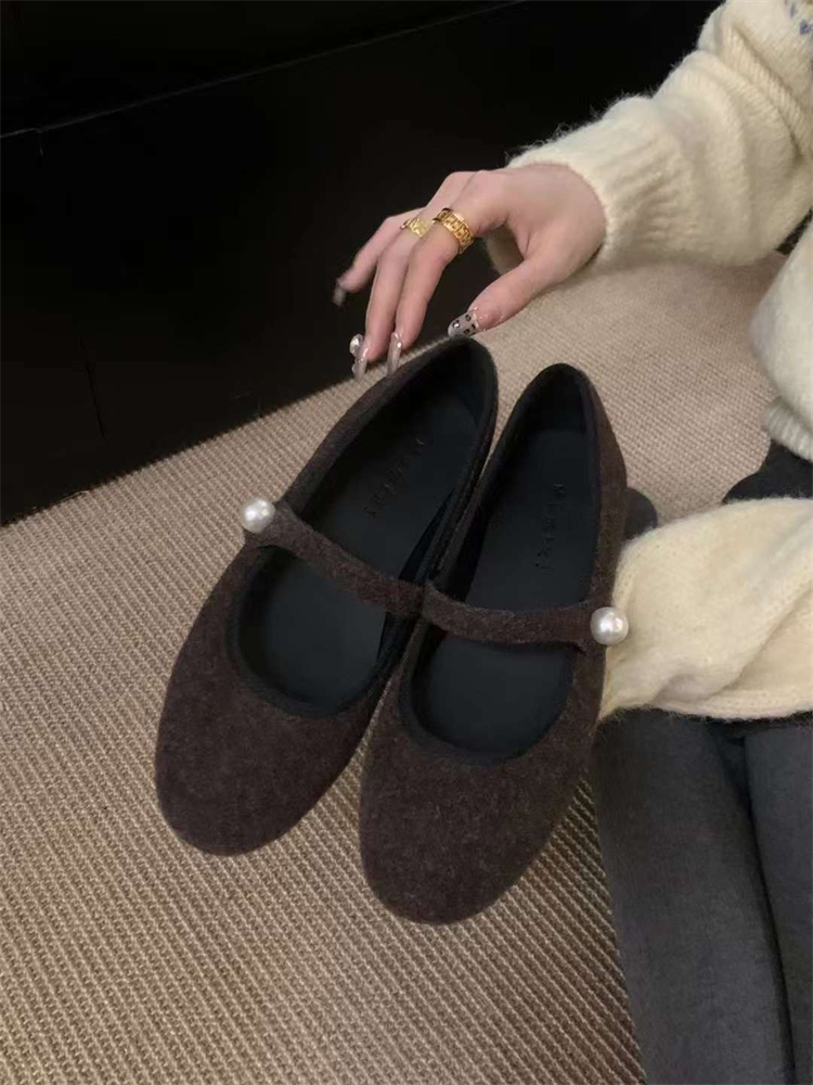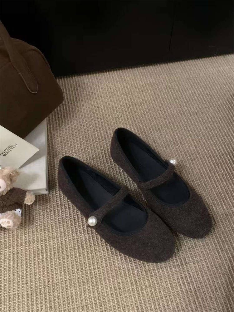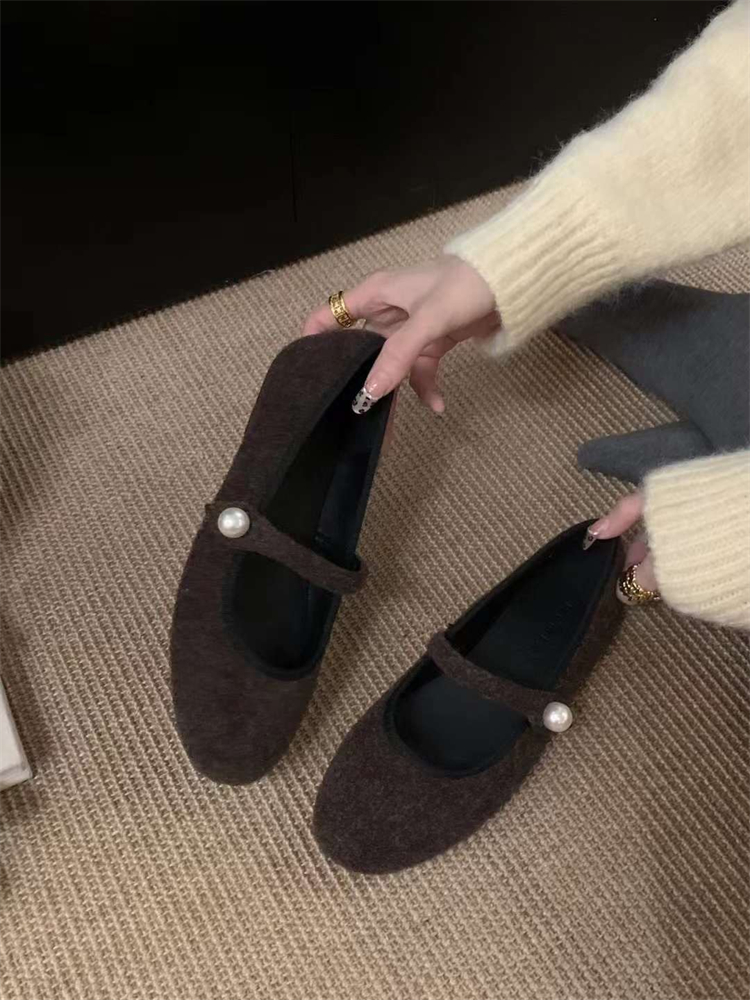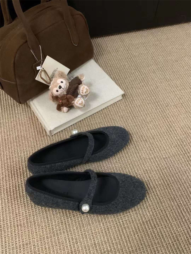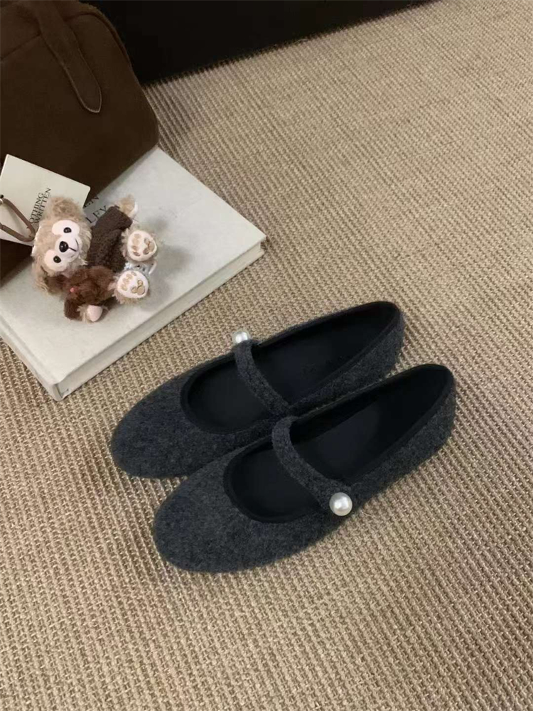 프랑스 플랫 구슬 구슬 한 단어 버튼 모직 메리 제인 신발 라운드 발가락 얕은 입 싱글 신발 새로운 스타일 발레 신발 2025 봄스토어 가기