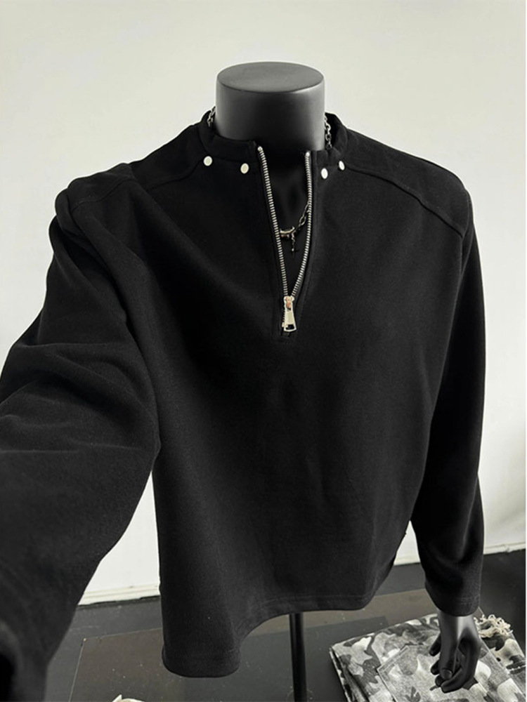 블랙 하프 지퍼 어깨 패드 스웨트 셔츠 남자 가을 겨울 아메리칸 스타일 숄더 스터드 긴팔 티셔츠 Pui Handsome 짧은 재킷