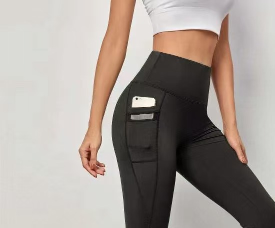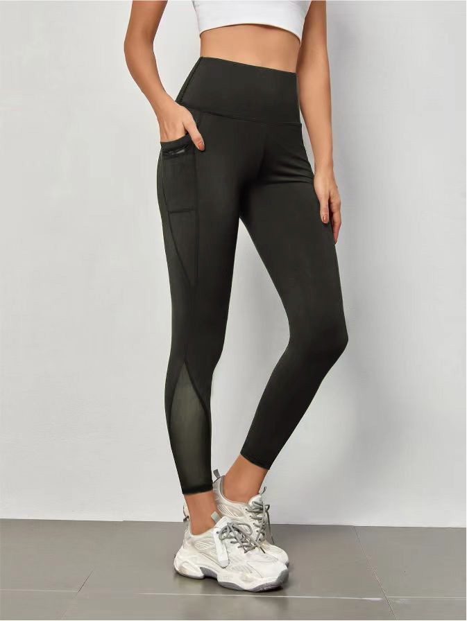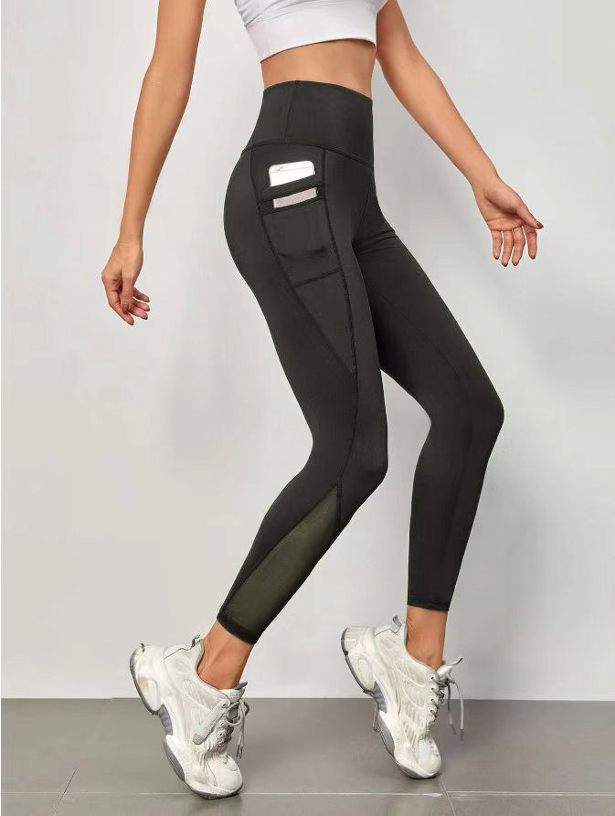 국경 간 유럽과 미국의 패션 높은 허리 메쉬 스티칭 요가 바지 포켓 빠른 건조 통기성 엉덩이 운동 피트니스 레이디