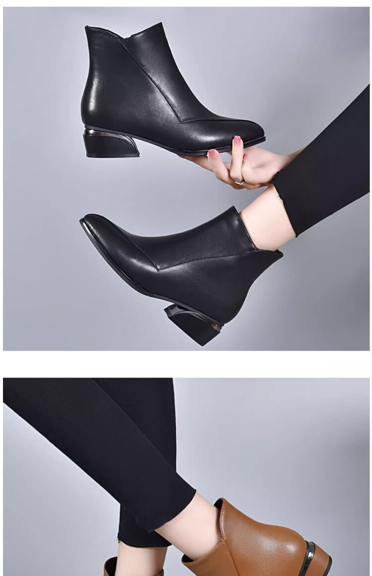 낮은 뒤꿈치 뾰족한 어머니 신발 2024 가을과 겨울 새로운 기모 가죽 부츠 대외 무역 도매 따뜻한 미끄럼 여성 면화 재고