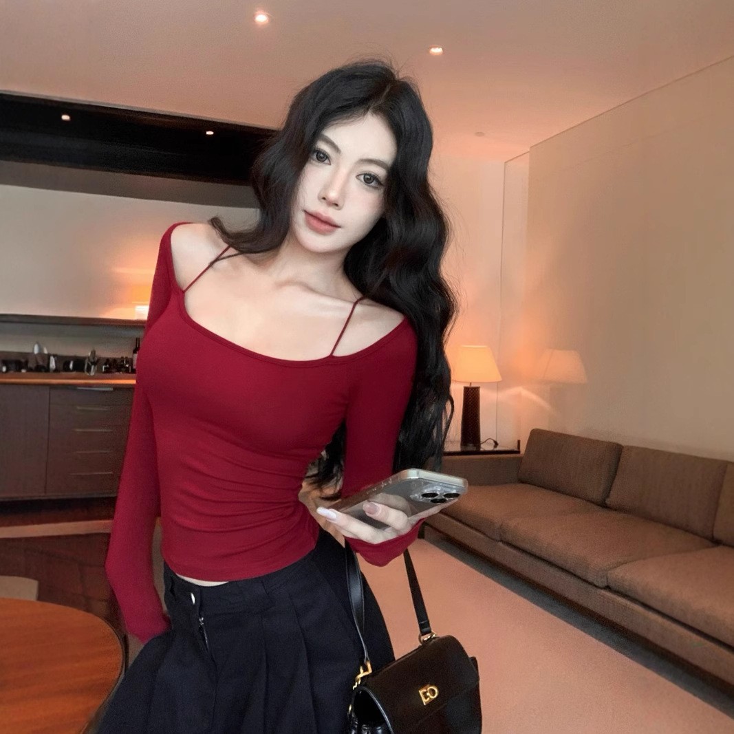 섹시한 스파이스 소녀 가슴 패드 레드 긴팔 티셔츠 여성용 봄 세련된 슬림베이스 셔츠