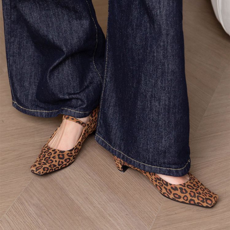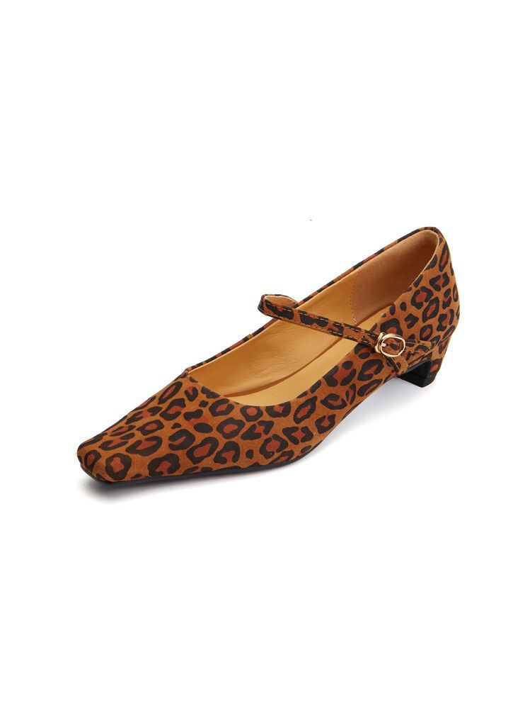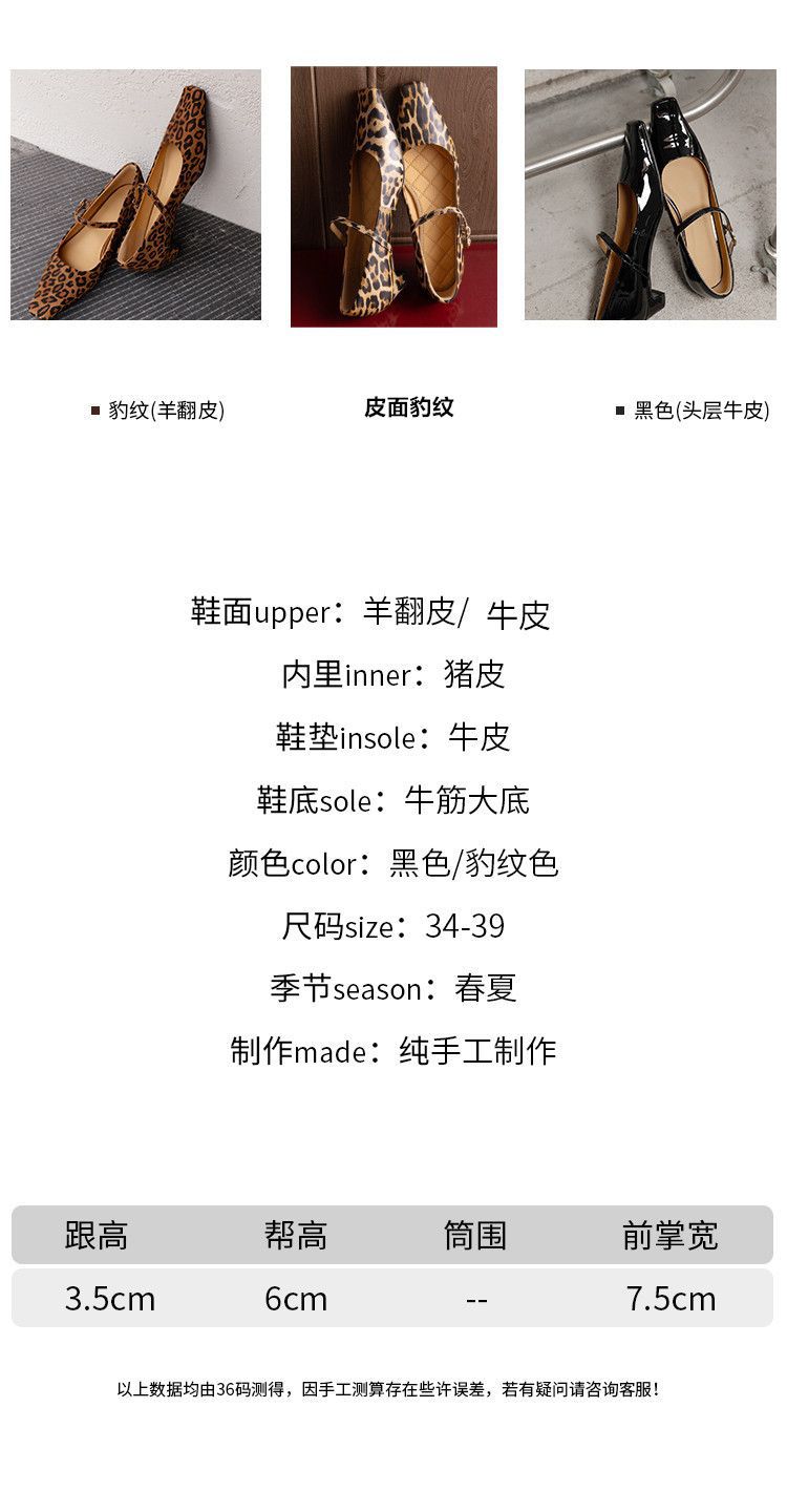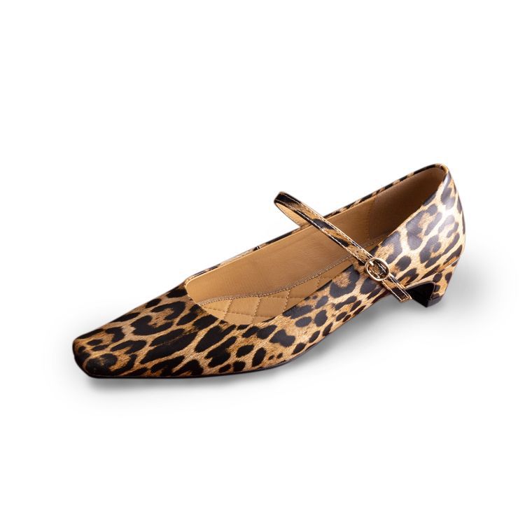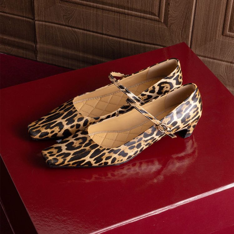 고양이 힐 스퀘어 발가락 레오파드 무늬 메리 제인 신발 여성 미드 힐 신발 2025 봄 새로운 정품 가죽 싱글 라인 얕은 입 신발스토어 가기