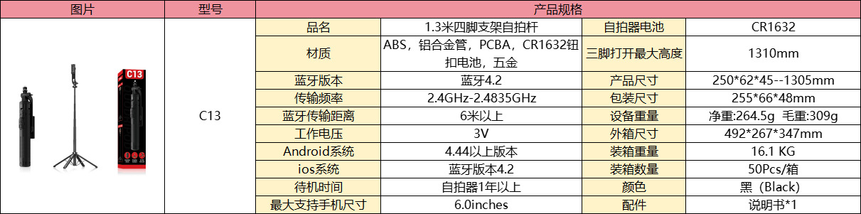 • C13 상위 버전(130cm+블루투스 리모컨+알루미늄 합금 튜브+4다리 용골 브래킷)