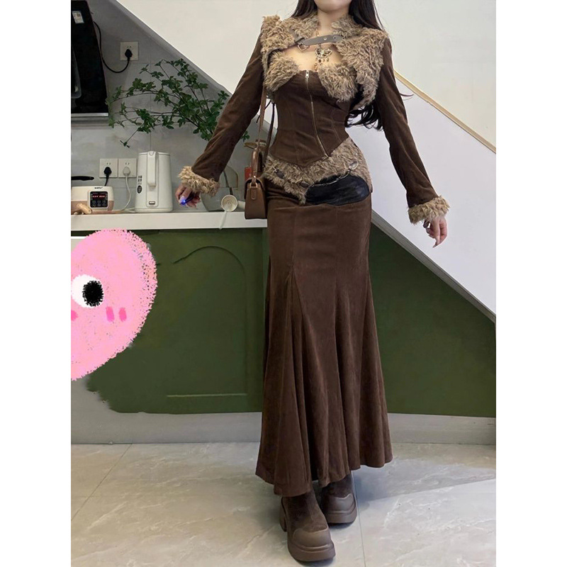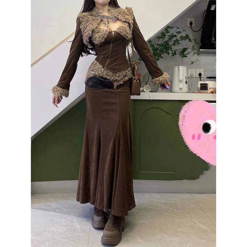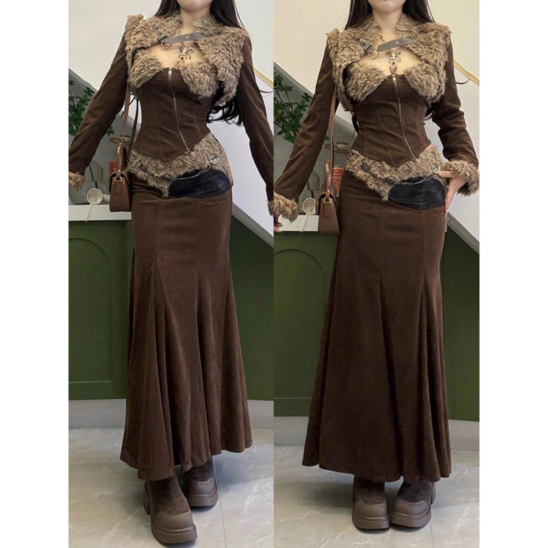 빈티지 Maillard 세트 여성의 봄과 가을 슬링 탑 Mao Mao Wipe 재킷 엉덩이 하프 길이 원피스 3 피스 세트