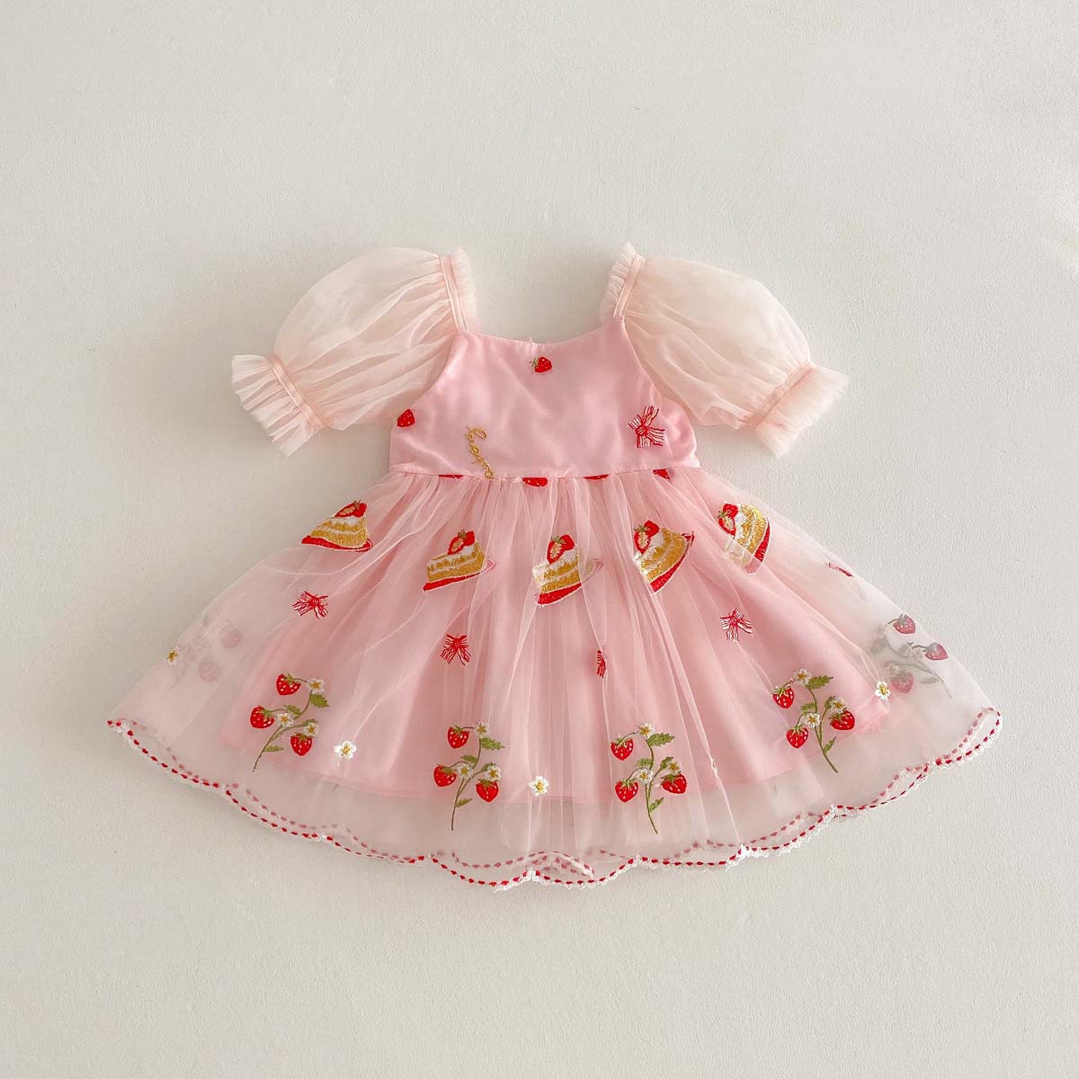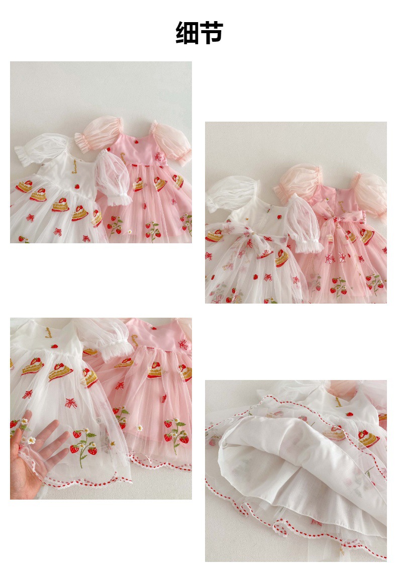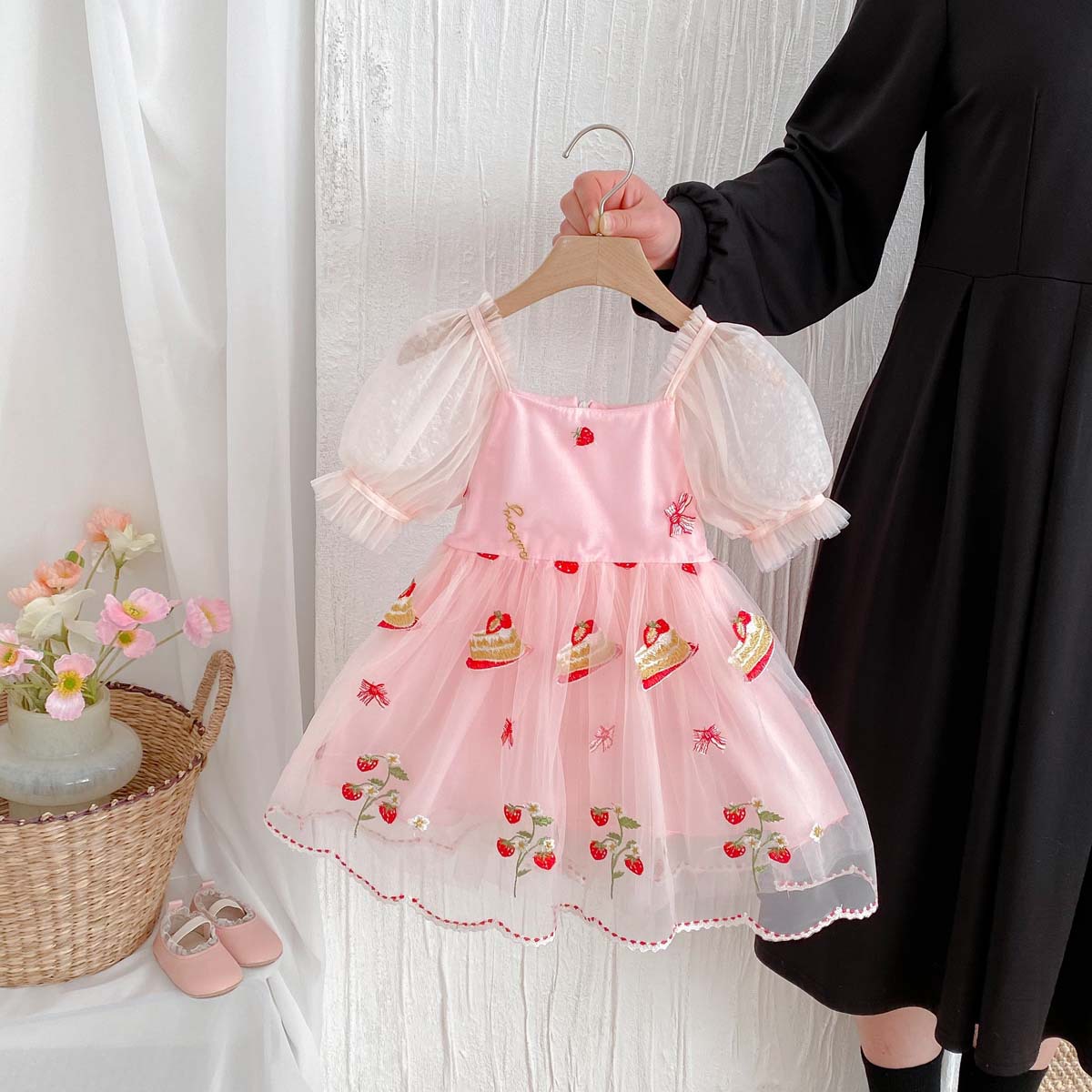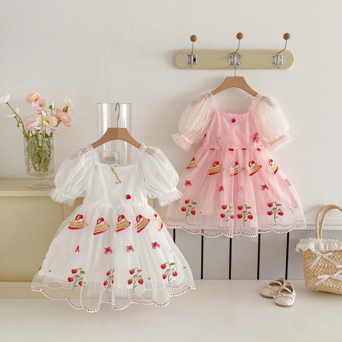 소녀 봄과 여름 짧은 소매 퍼프 소매 원피스 자수 꽃 달콤한 메쉬 공주 원피스