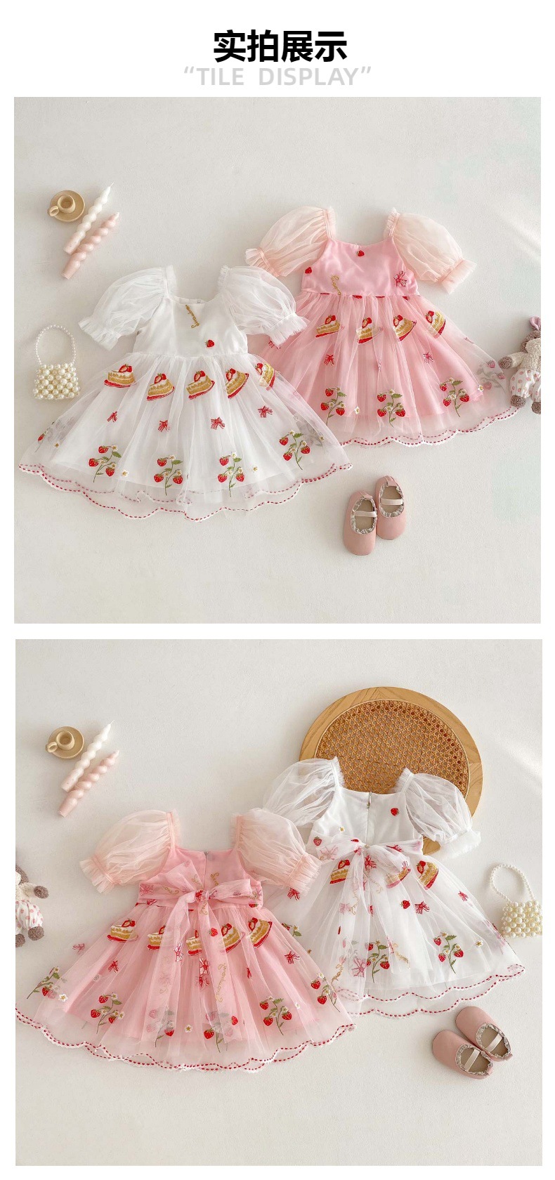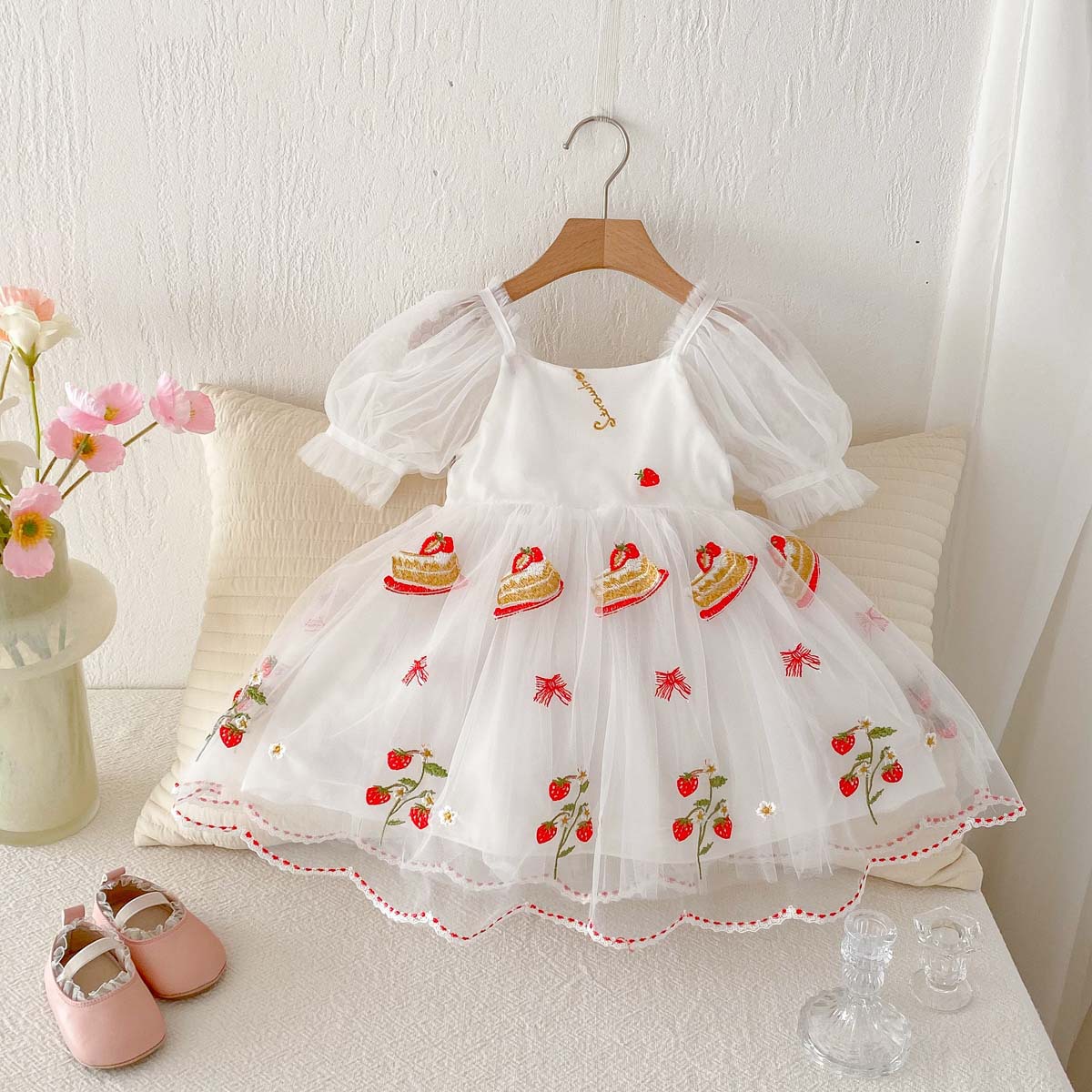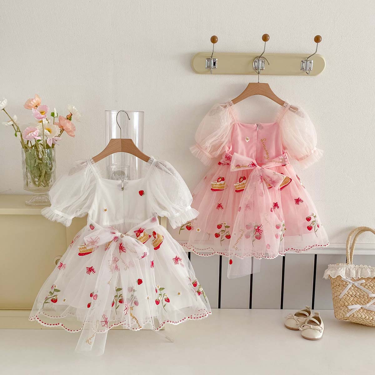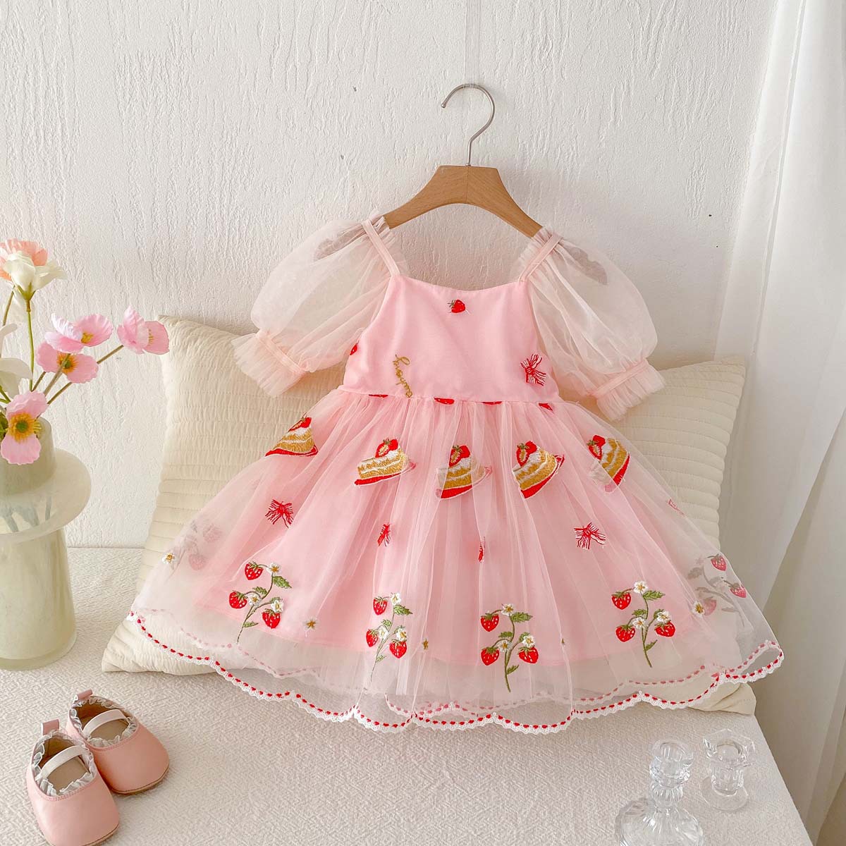 소녀 봄과 여름 짧은 소매 퍼프 소매 원피스 자수 꽃 달콤한 메쉬 공주 원피스