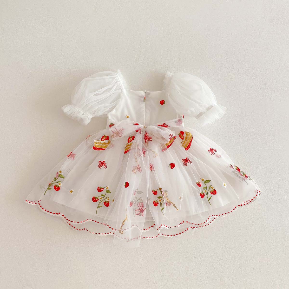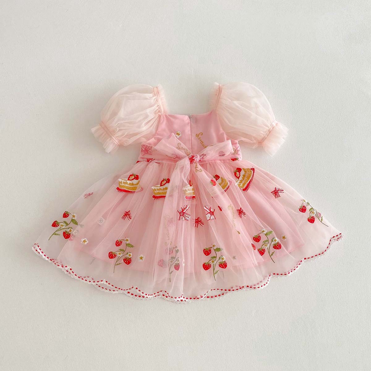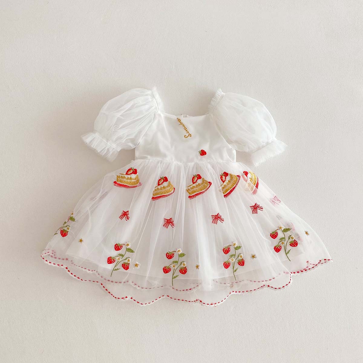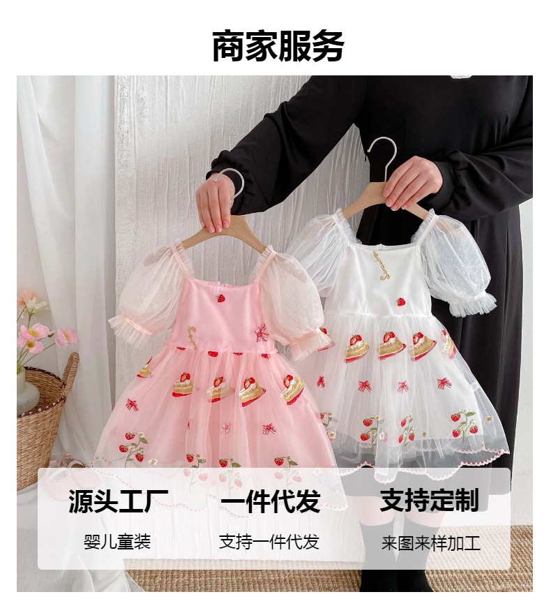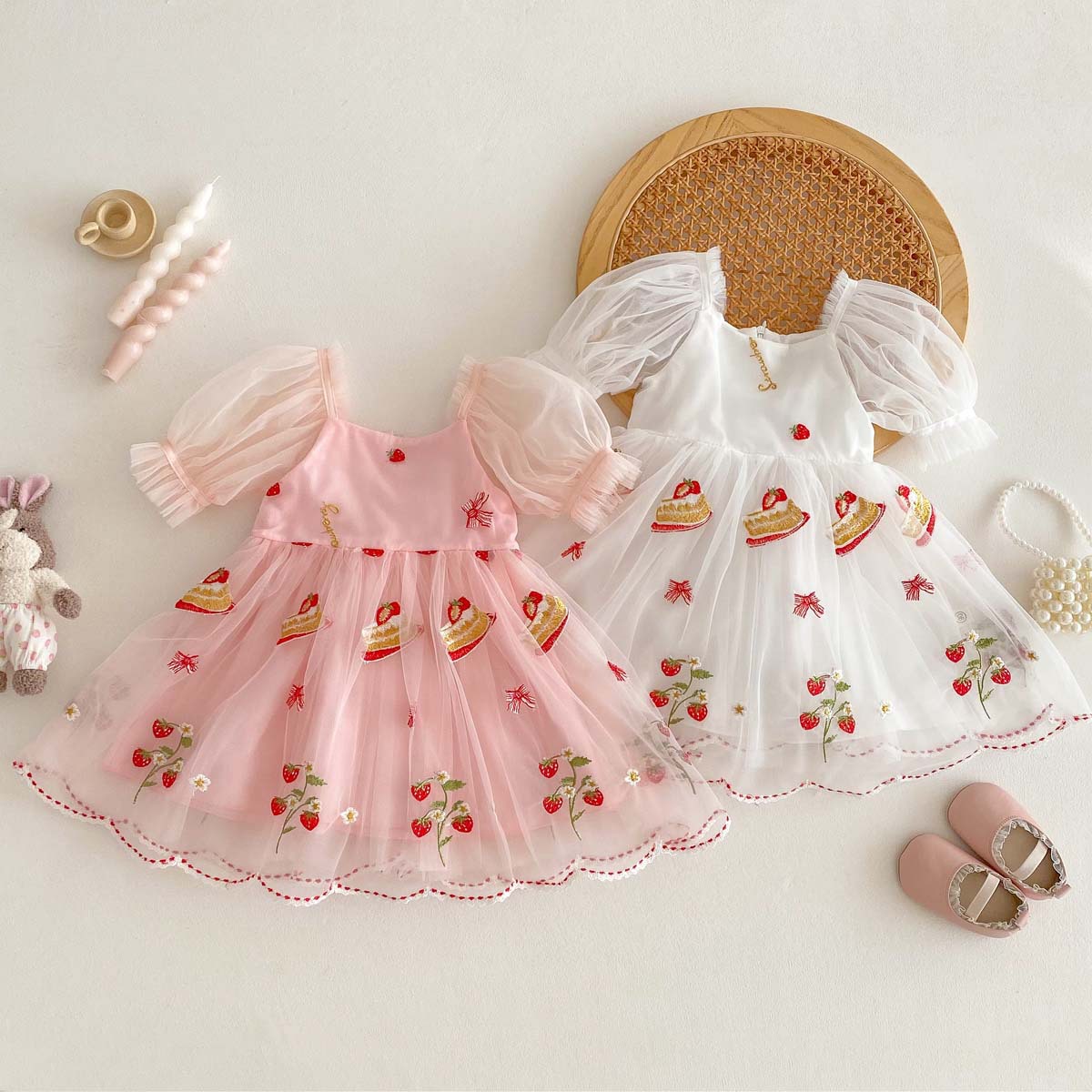 소녀 봄과 여름 짧은 소매 퍼프 소매 원피스 자수 꽃 달콤한 메쉬 공주 원피스