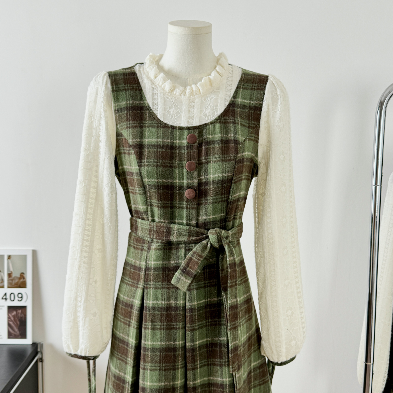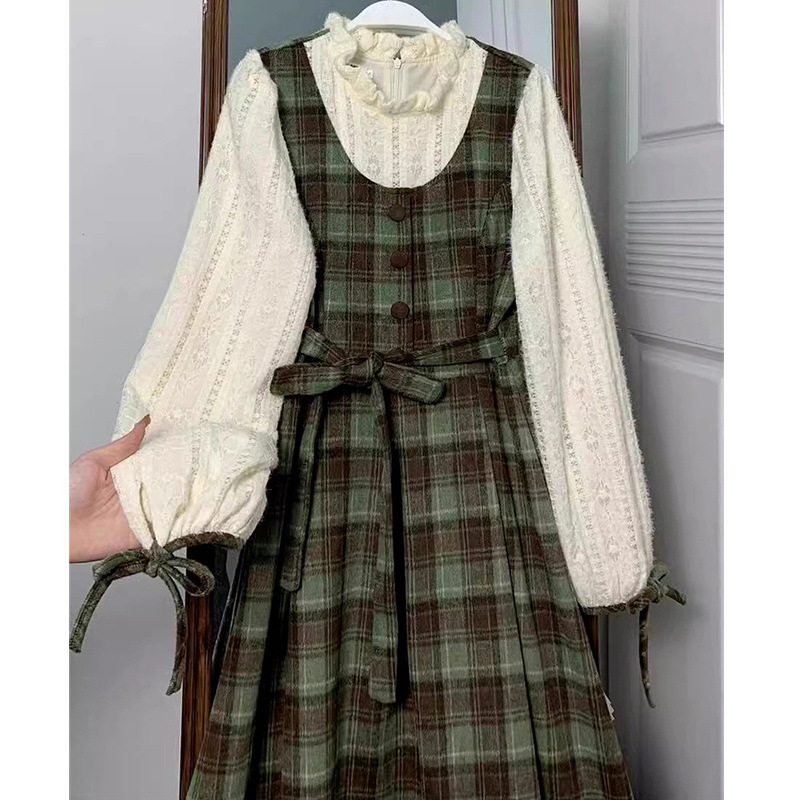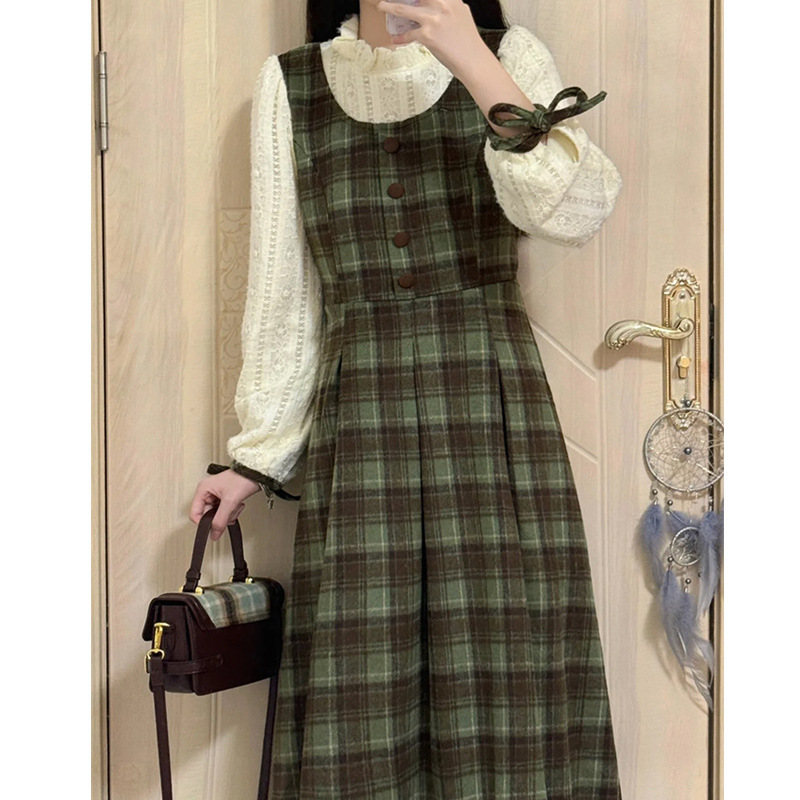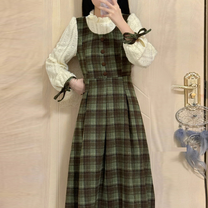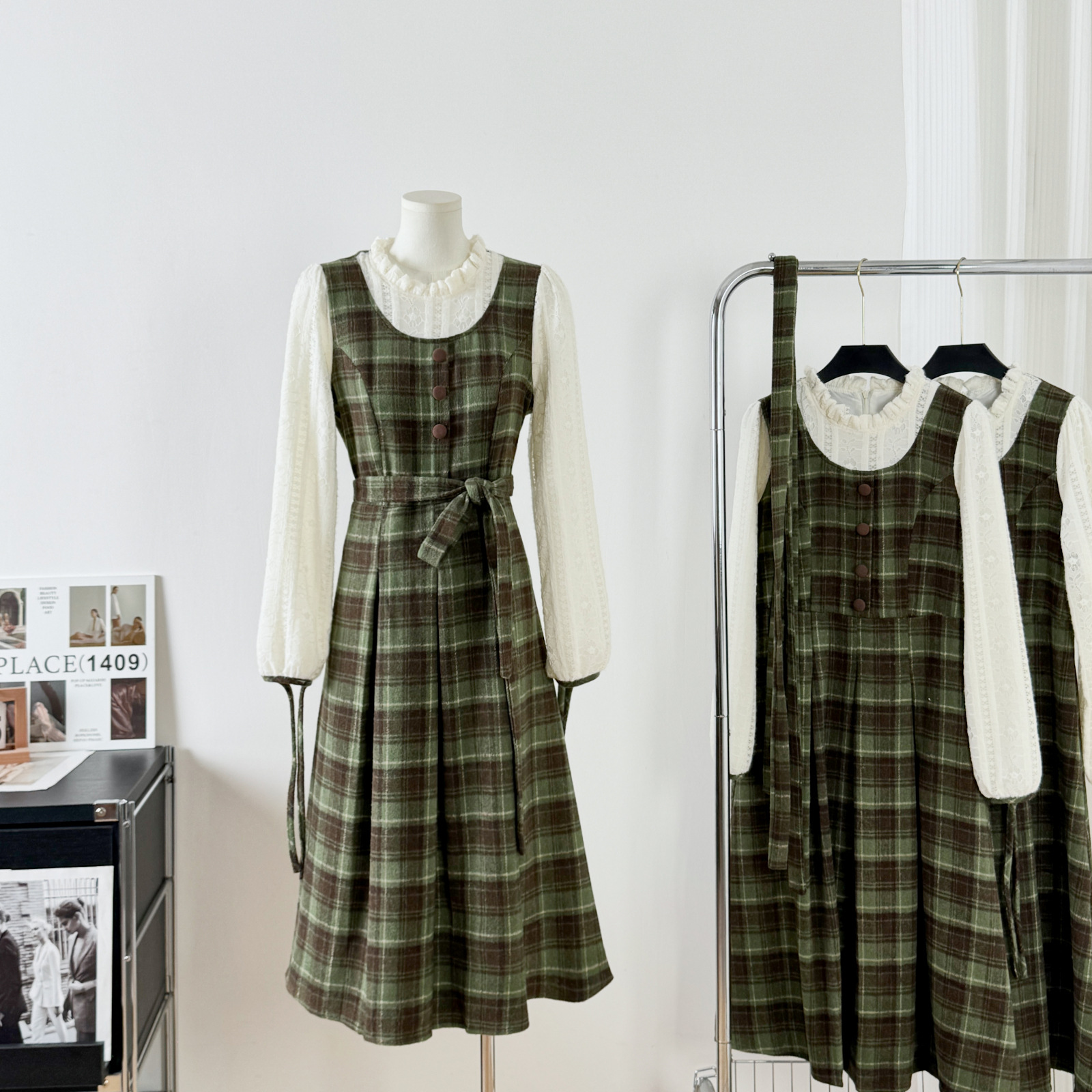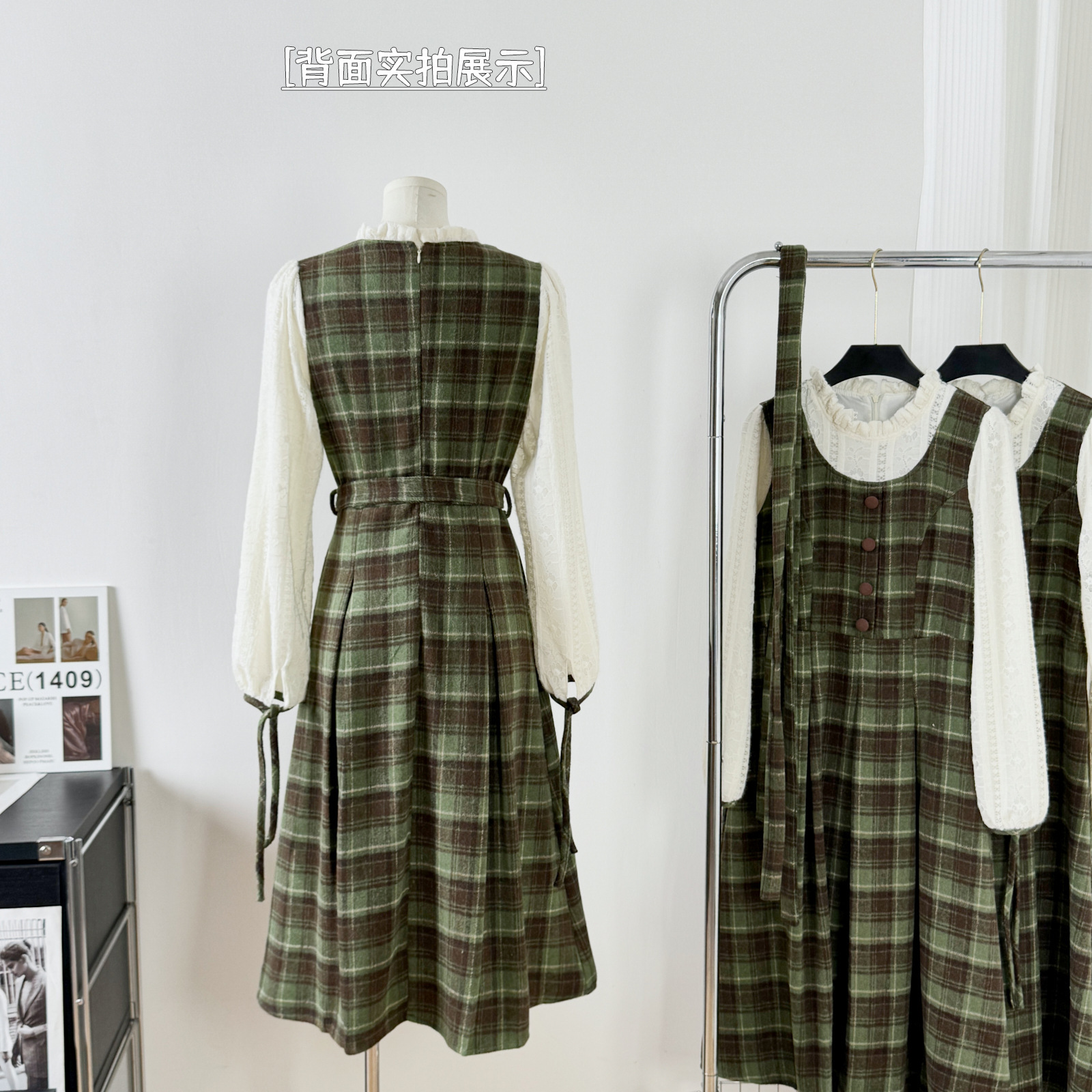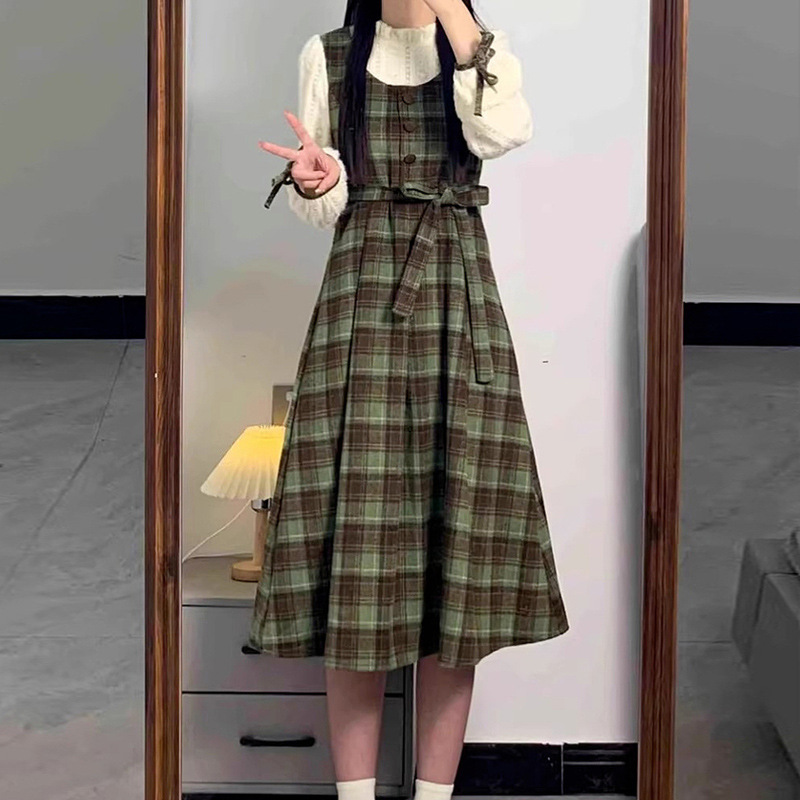 대학 스타일 가짜 투피스 녹색 격자 무늬 드레스 가을 2025 작은 사람들을 위한 새로운 스타일의 긴 드레스, 다재다능하고 슬림함스토어 가기