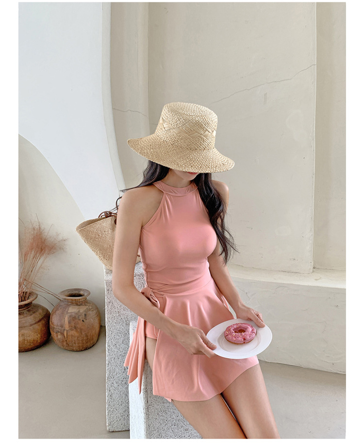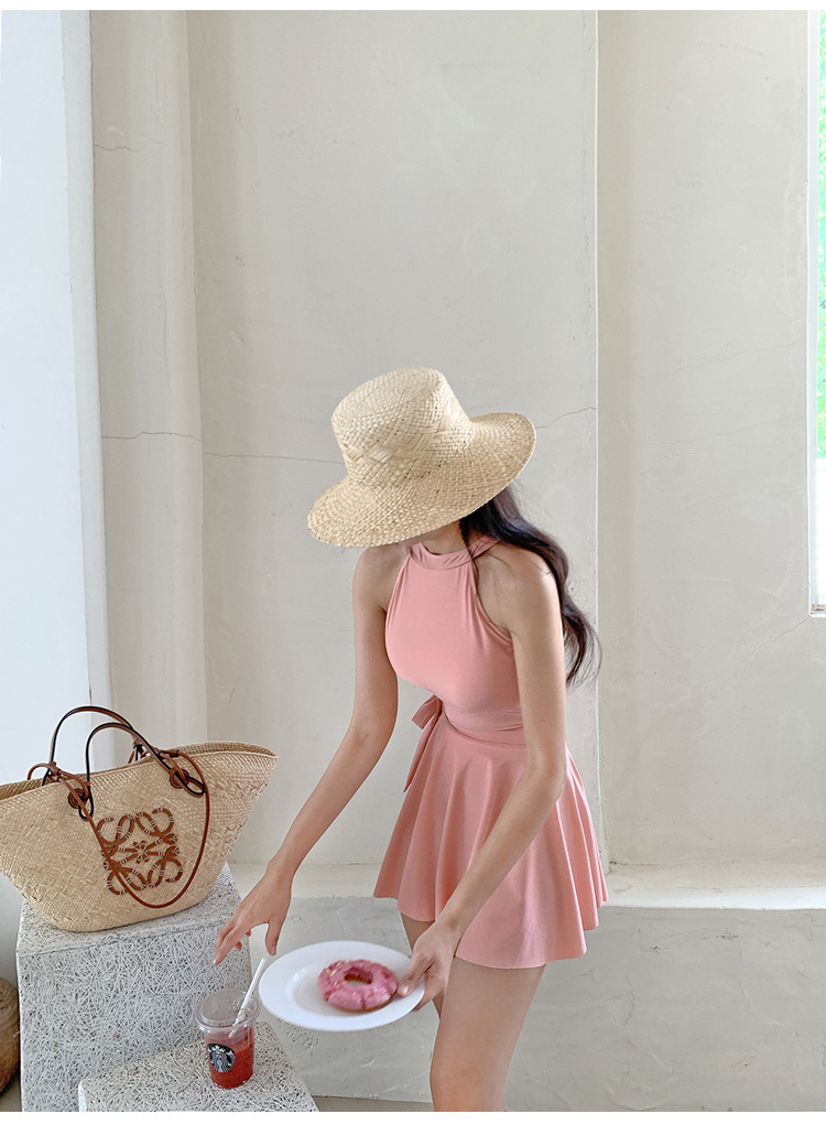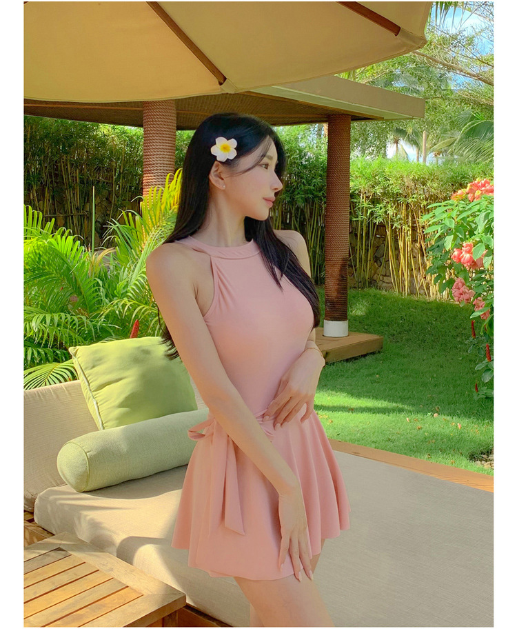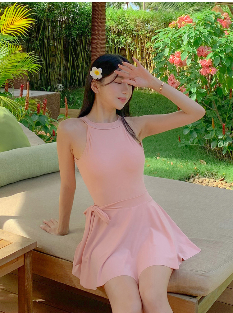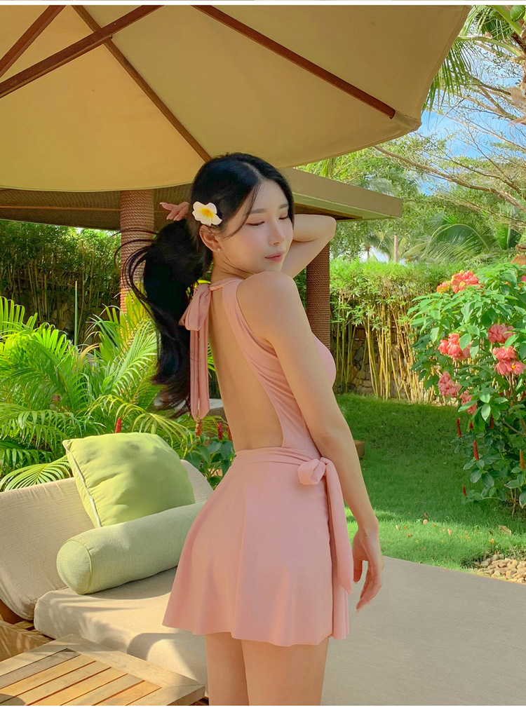 여성 원피스 수영복 단색 둥근 목 보수적 인 스커트 투피스 수영복 아름다운 등 일본 및 한국 온천 수영복