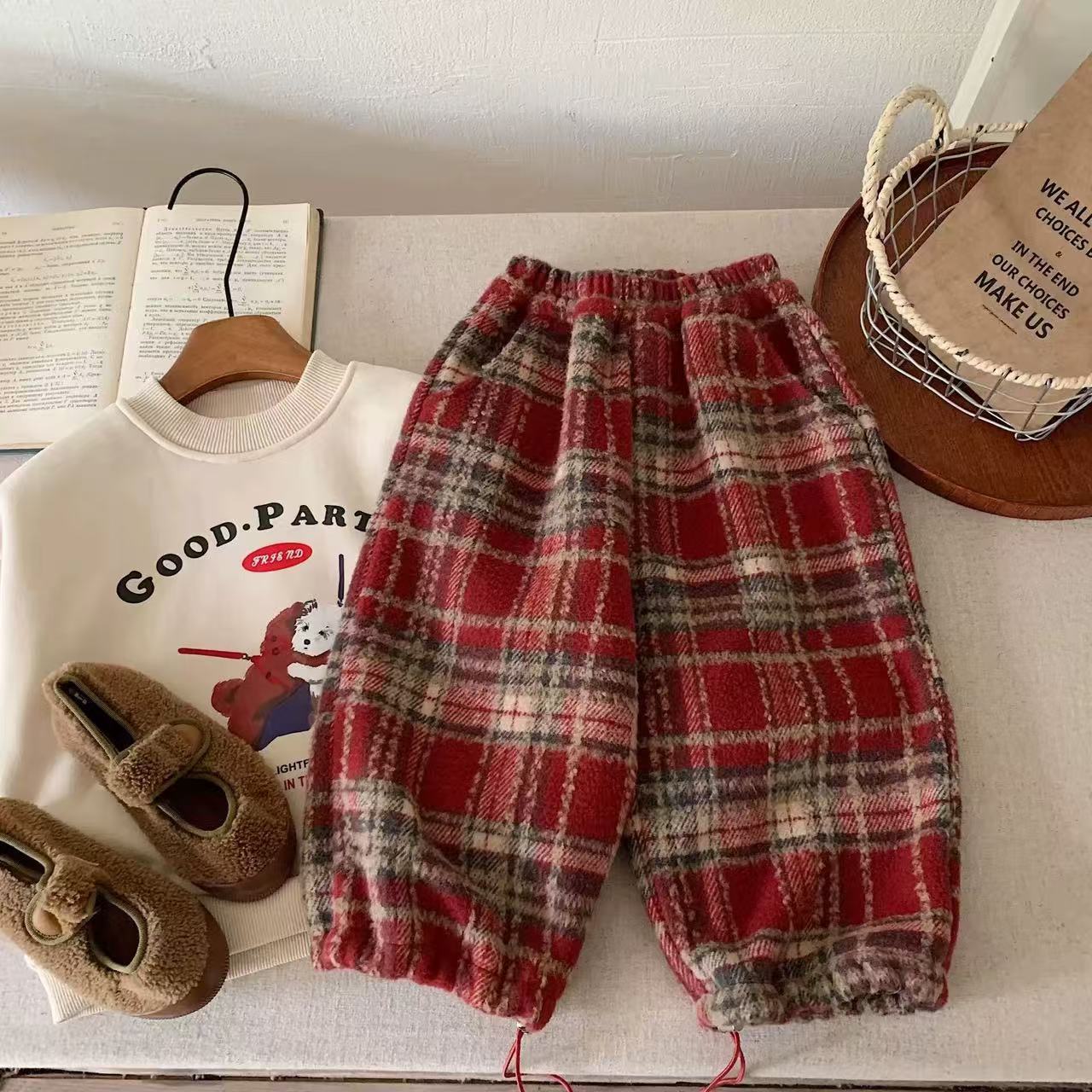 • 빨간색 체크 무늬 바지(벨벳 및 두꺼워짐)