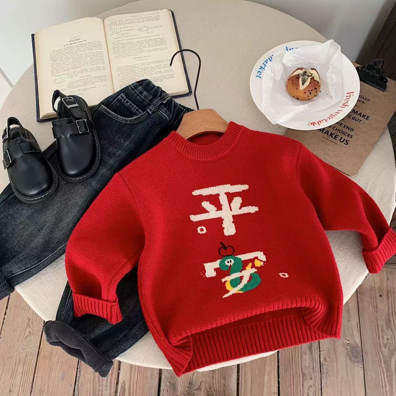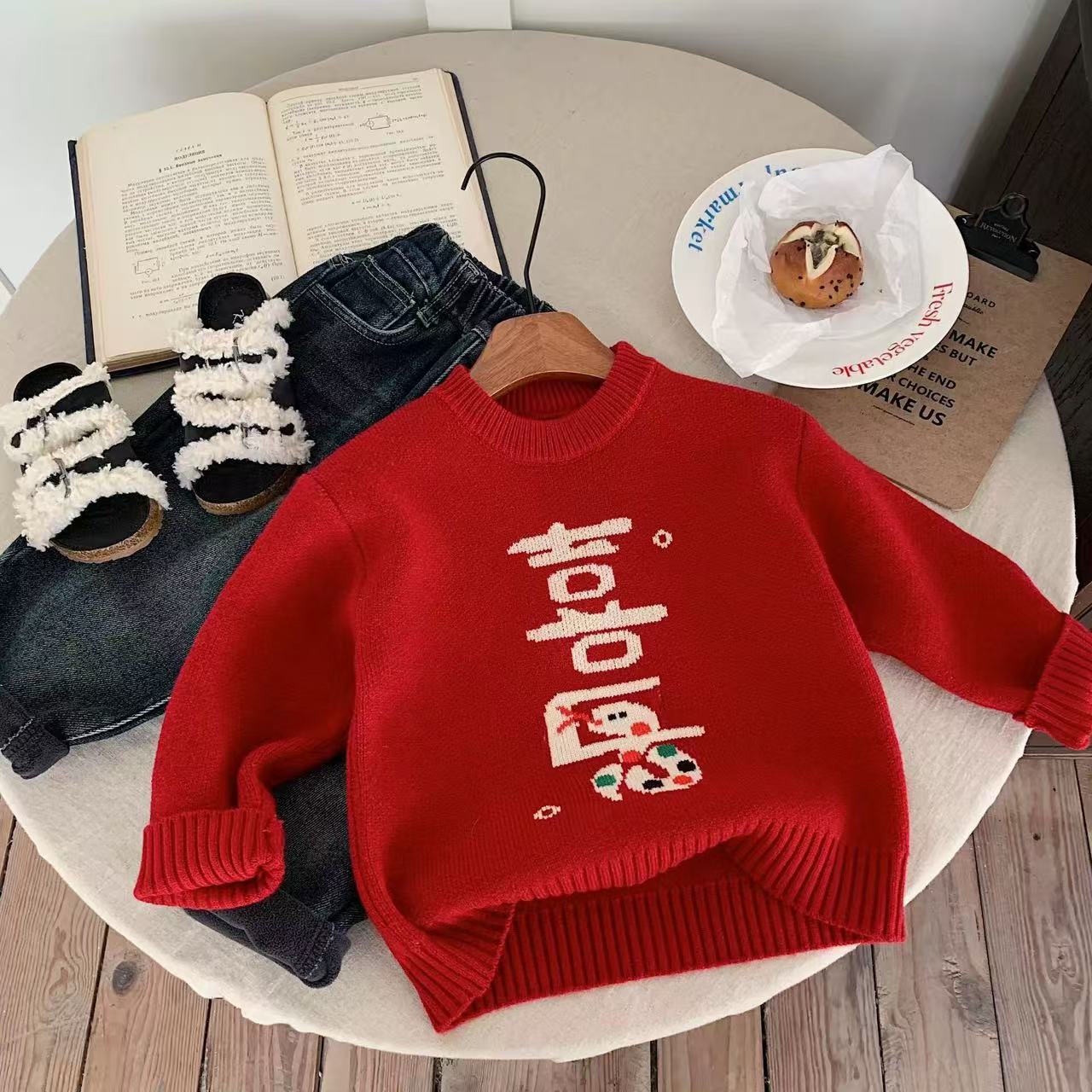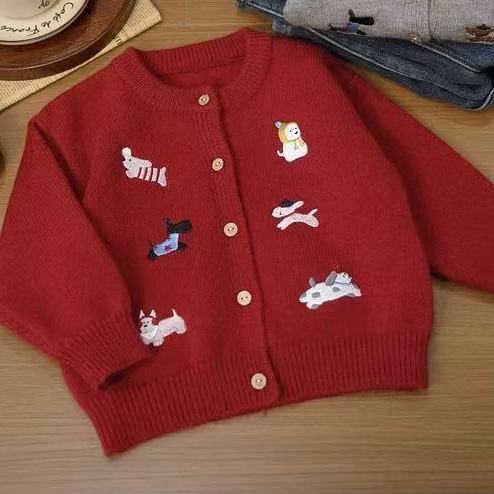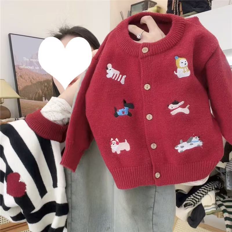 어린이 해 스웨터 2024 새로운 니트 카디건 자수 강아지 축제 최고 소년의 겨울 신년 옷