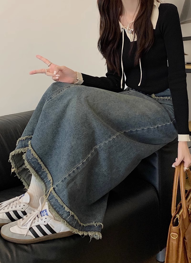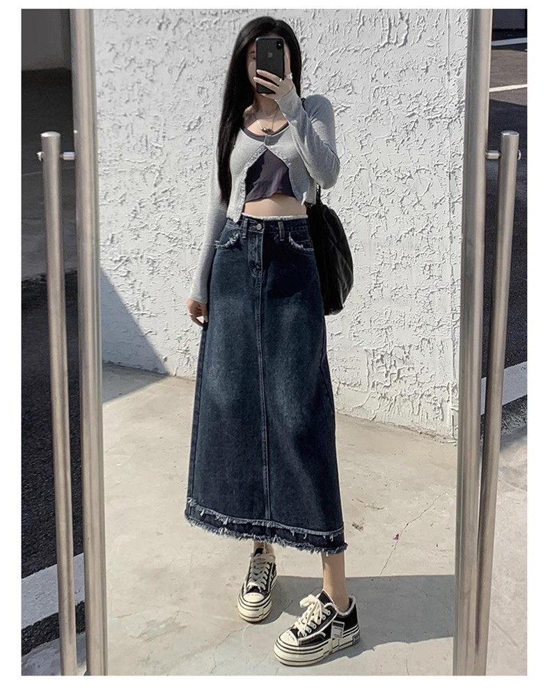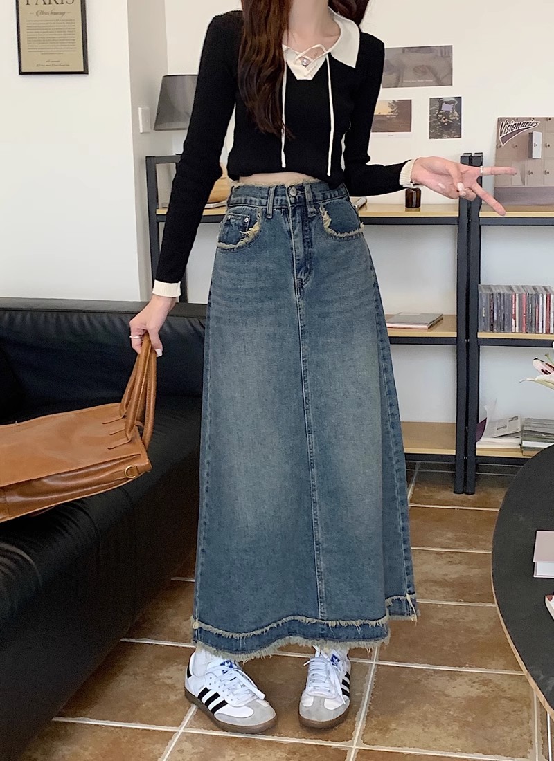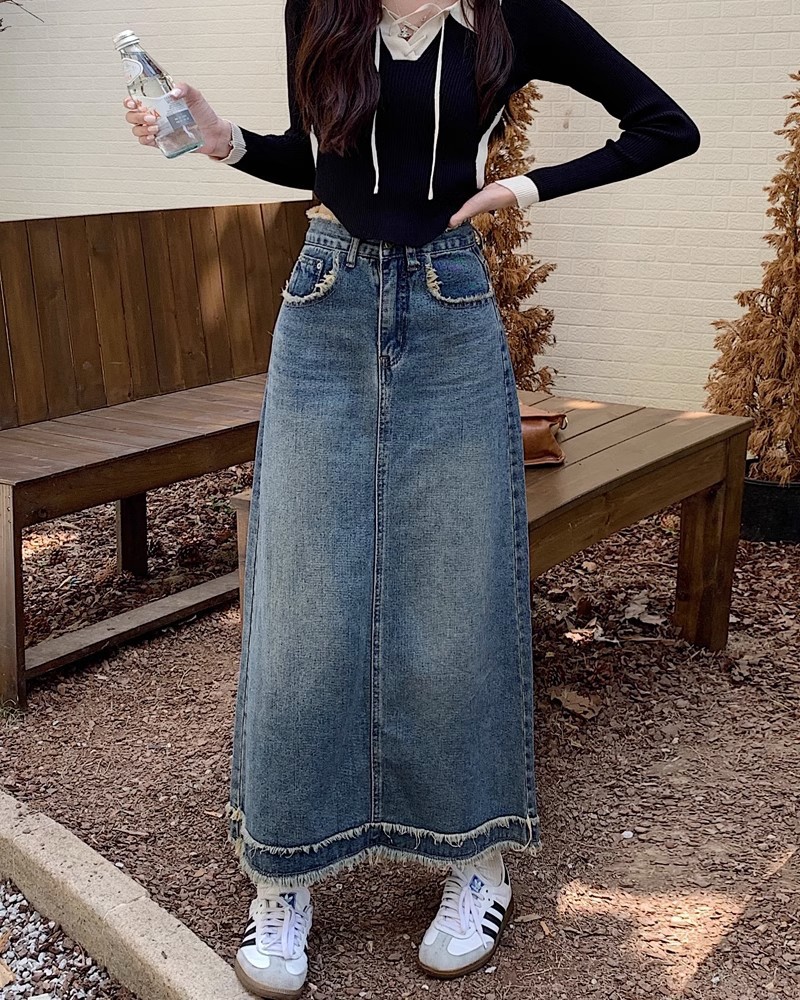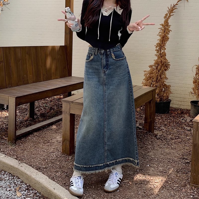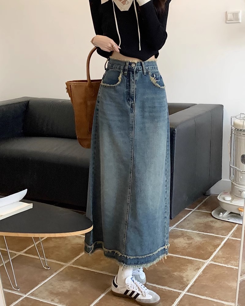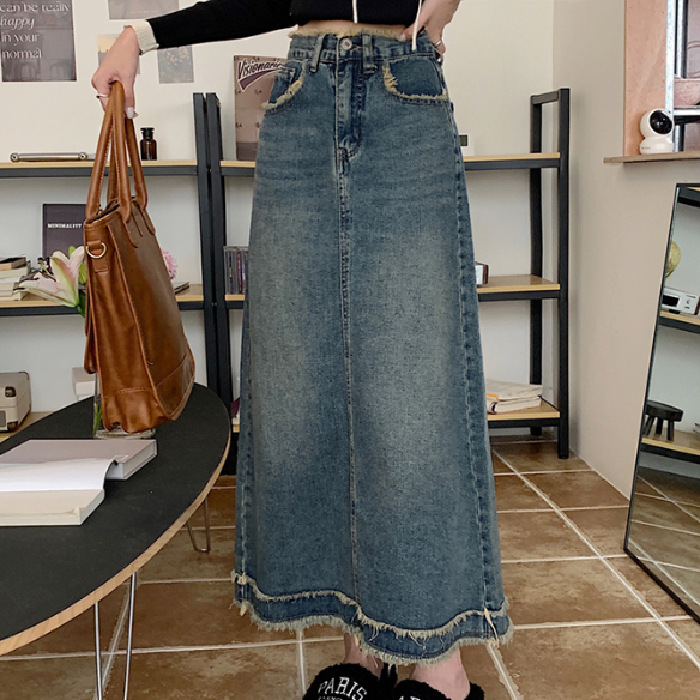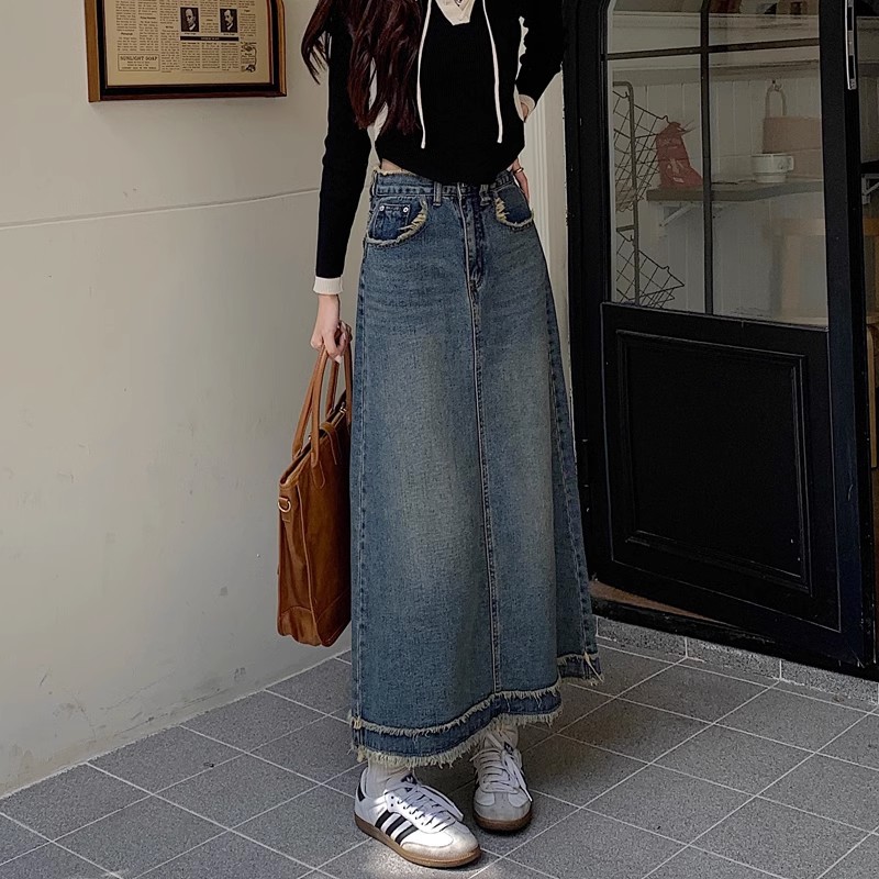 빈티지 모피 엣지 중간 길이의 데님 스커트 여성 가을 새로운 높은 허리 슬림 슈라우드 엉덩이 커버 A 라인 긴 스커트