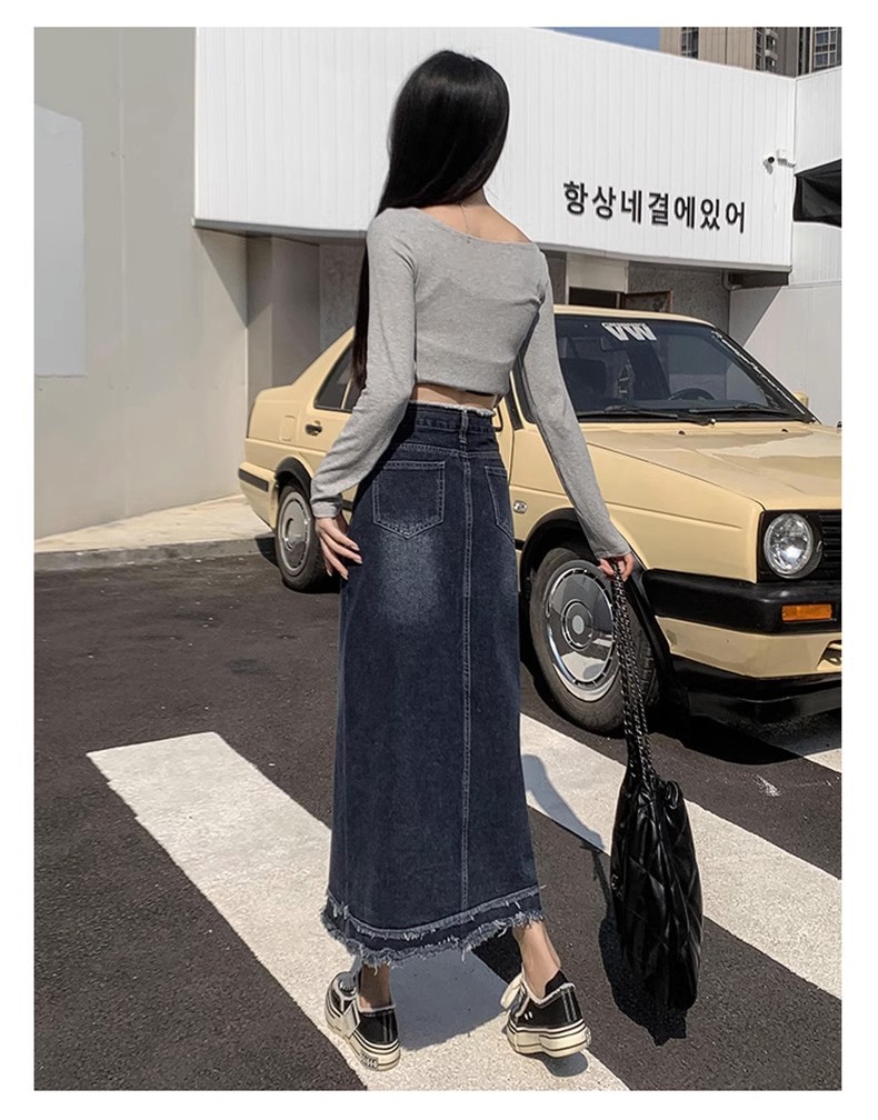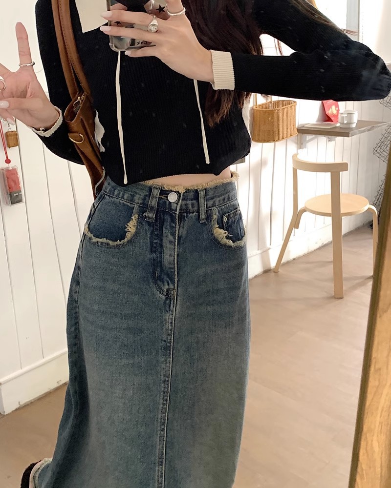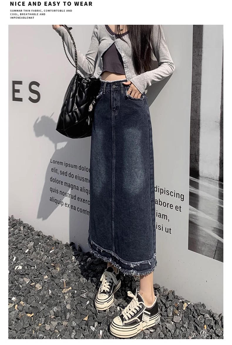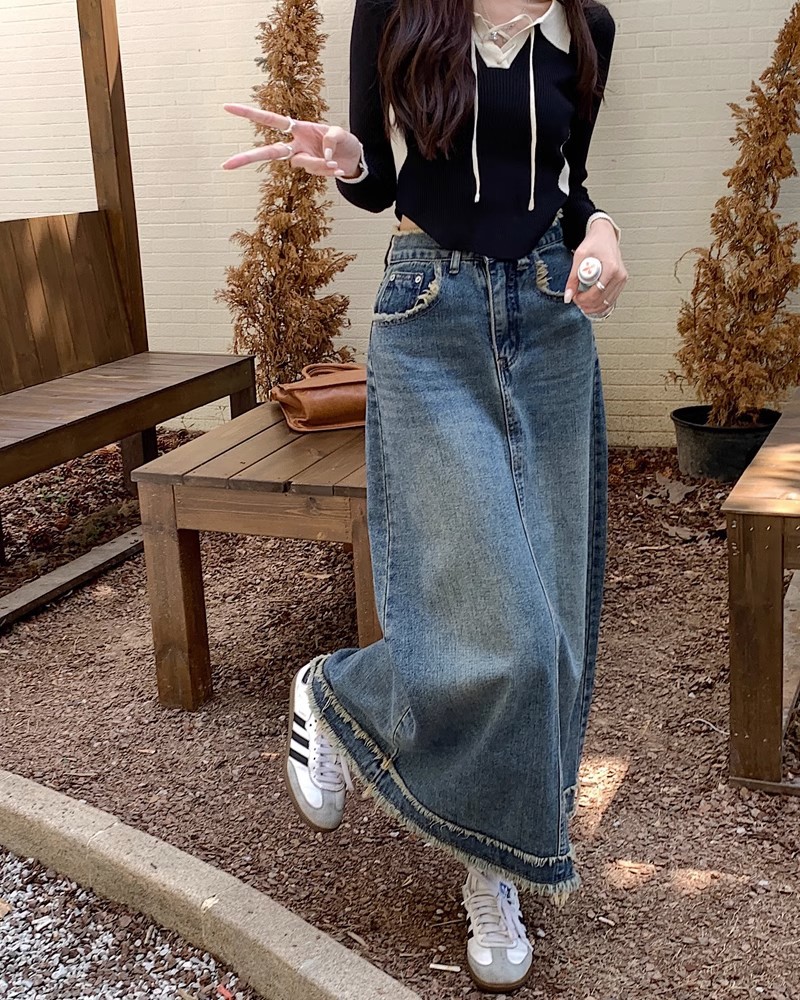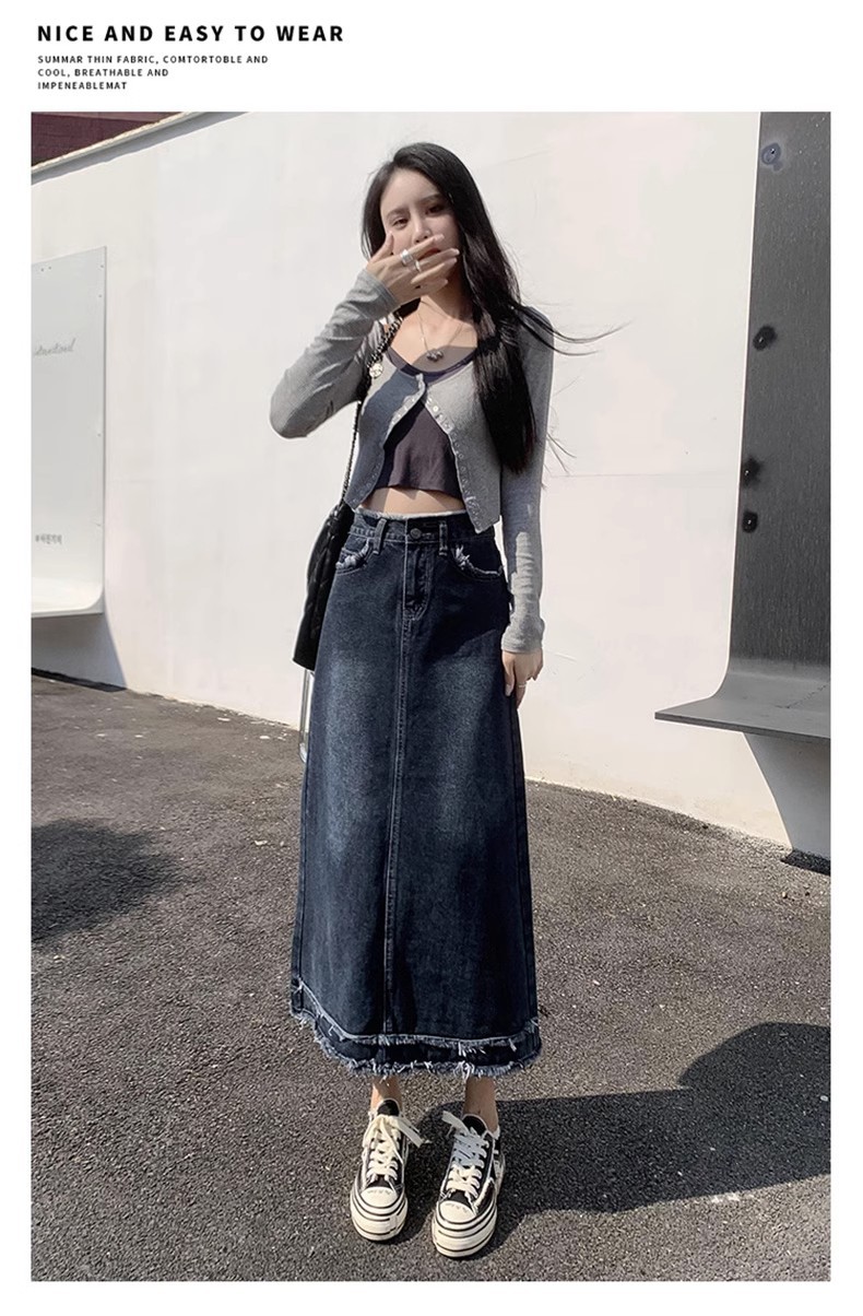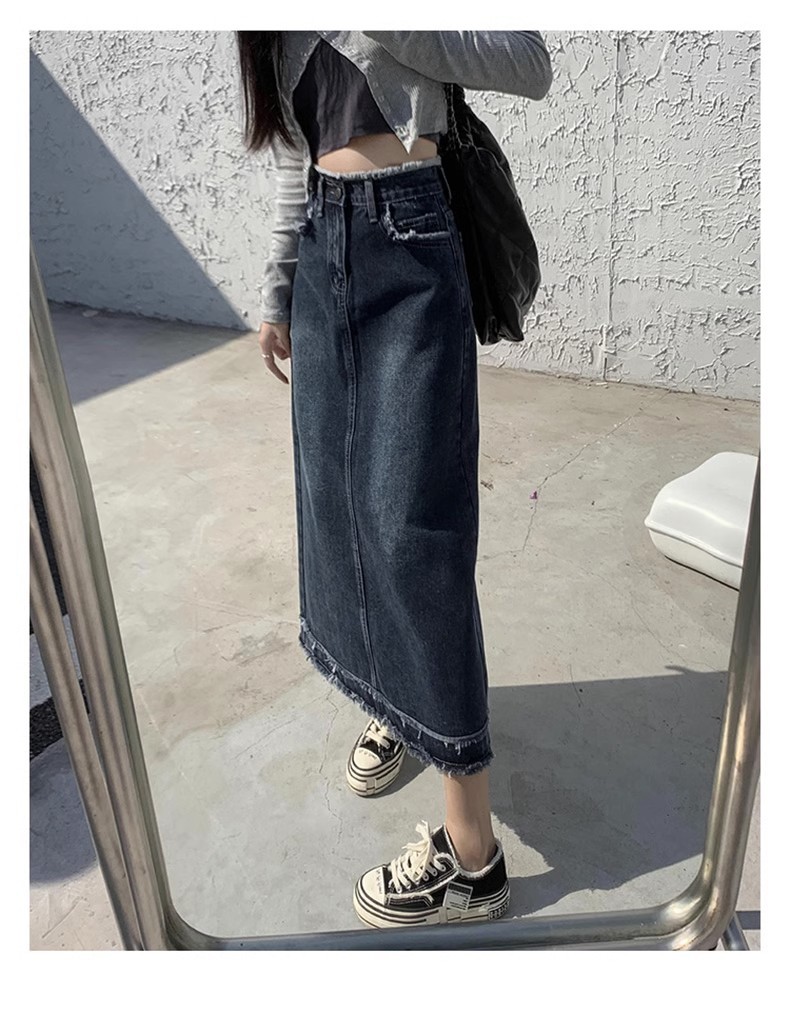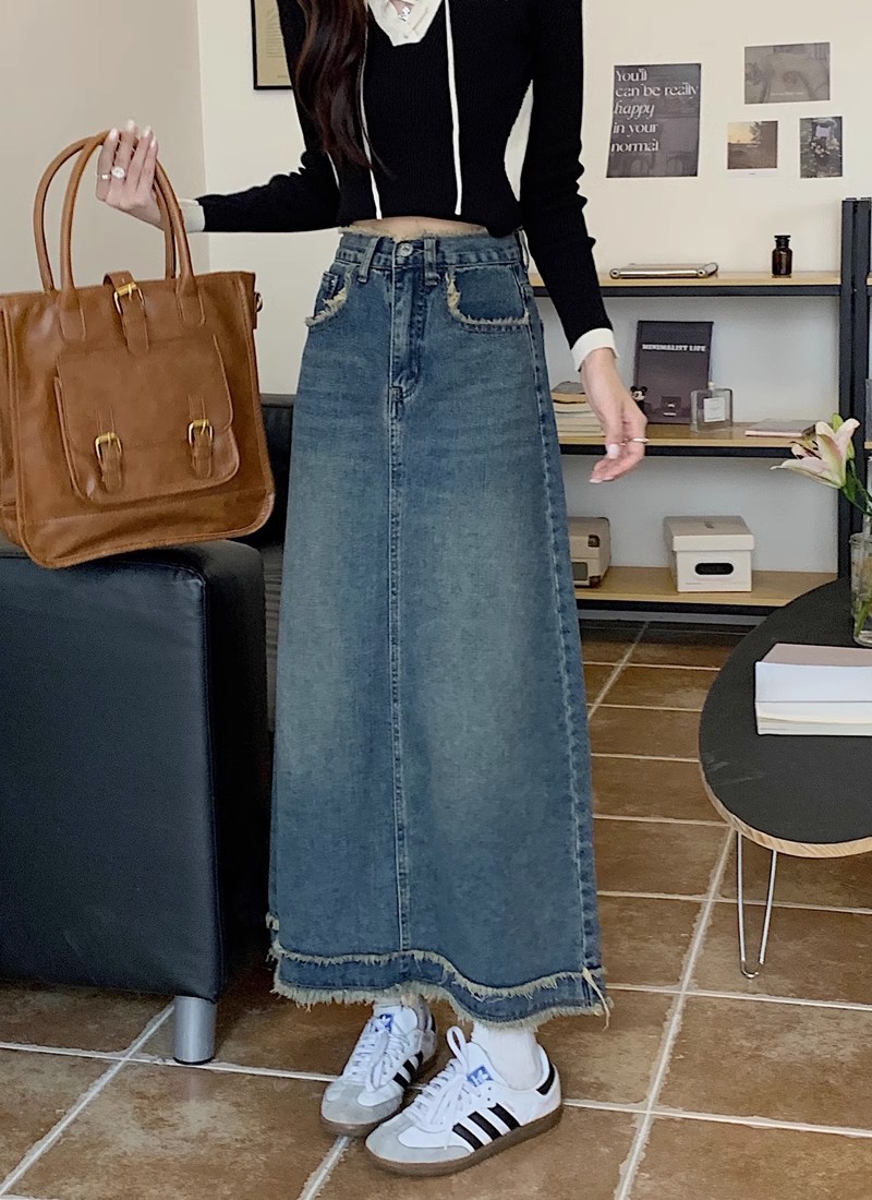 빈티지 모피 엣지 중간 길이의 데님 스커트 여성 가을 새로운 높은 허리 슬림 슈라우드 엉덩이 커버 A 라인 긴 스커트