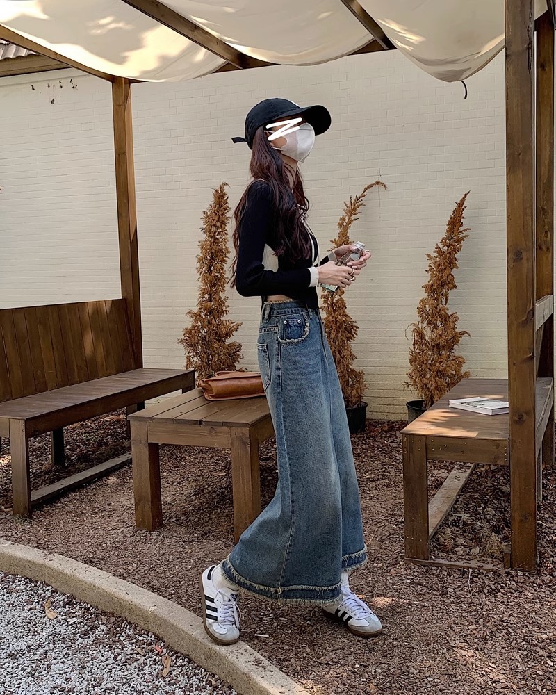 빈티지 모피 엣지 중간 길이의 데님 스커트 여성 가을 새로운 높은 허리 슬림 슈라우드 엉덩이 커버 A 라인 긴 스커트스토어 가기