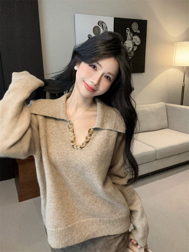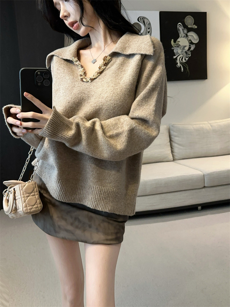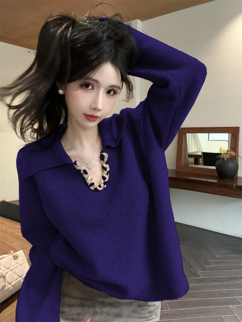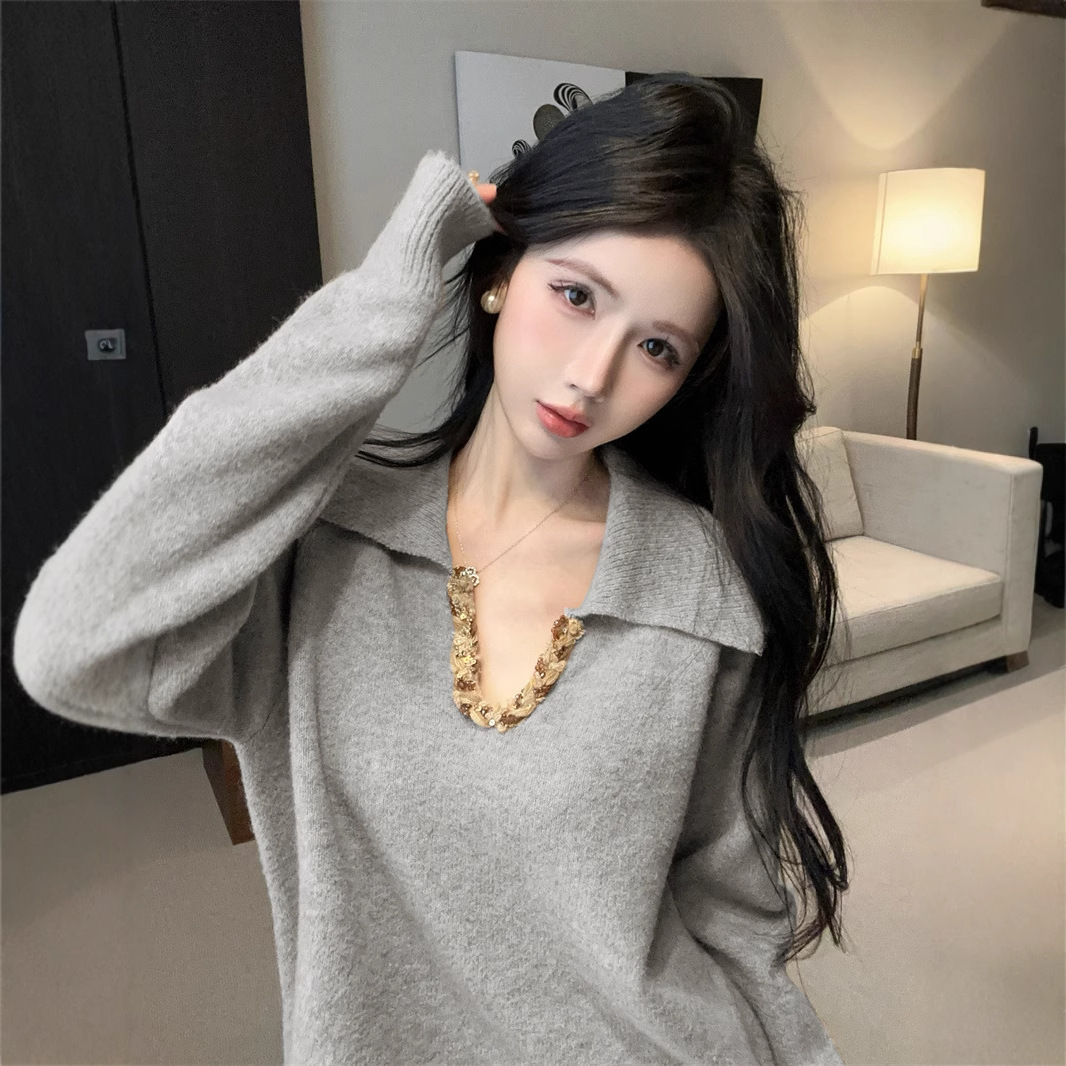 한국 스타일 디자인 센스 중공업 니트 옷깃 스웨터 여성의 2024 가을 겨울 새로운 따뜻한 탑 니트 스웨터스토어 가기