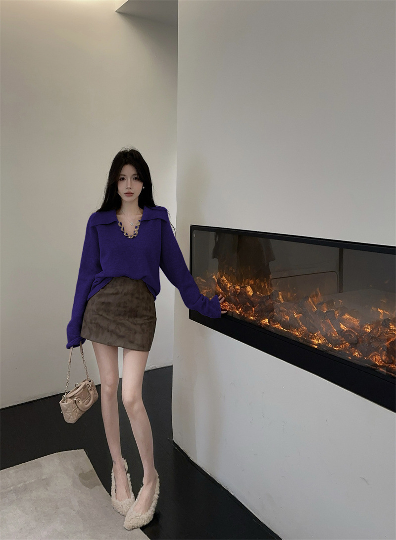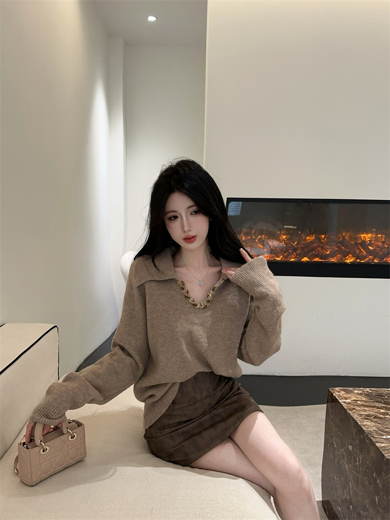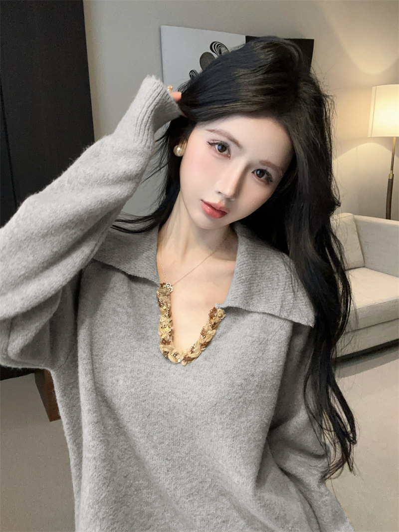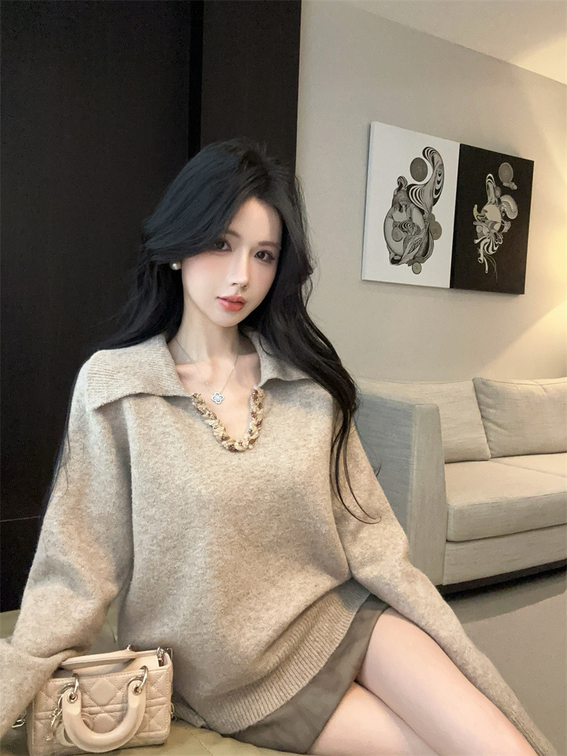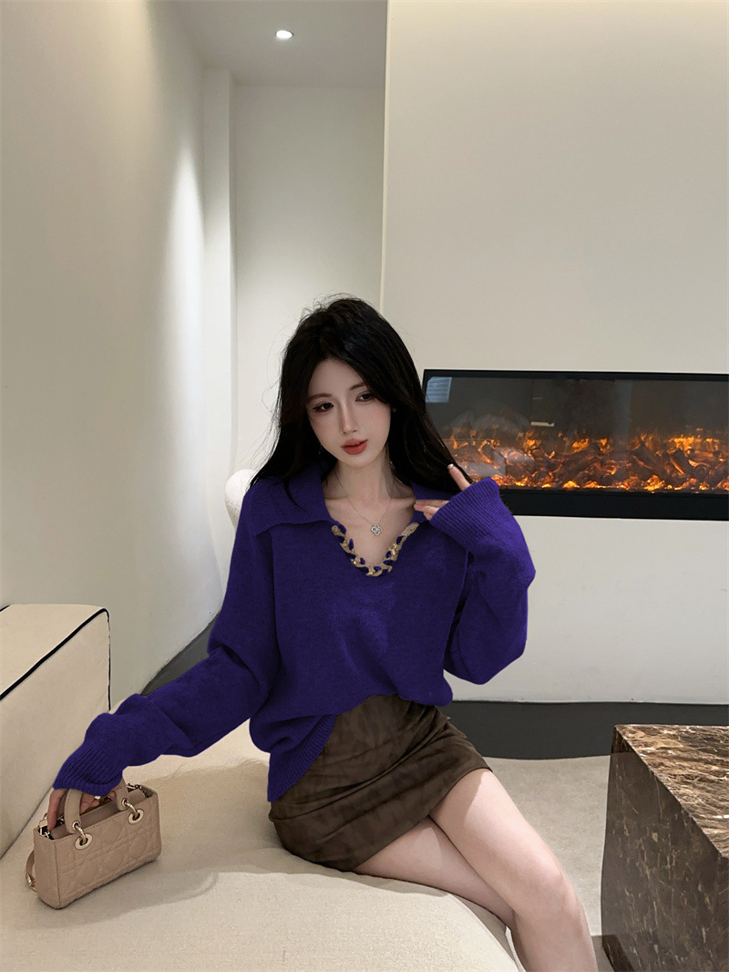 한국 스타일 디자인 센스 중공업 니트 옷깃 스웨터 여성의 2024 가을 겨울 새로운 따뜻한 탑 니트 스웨터스토어 가기