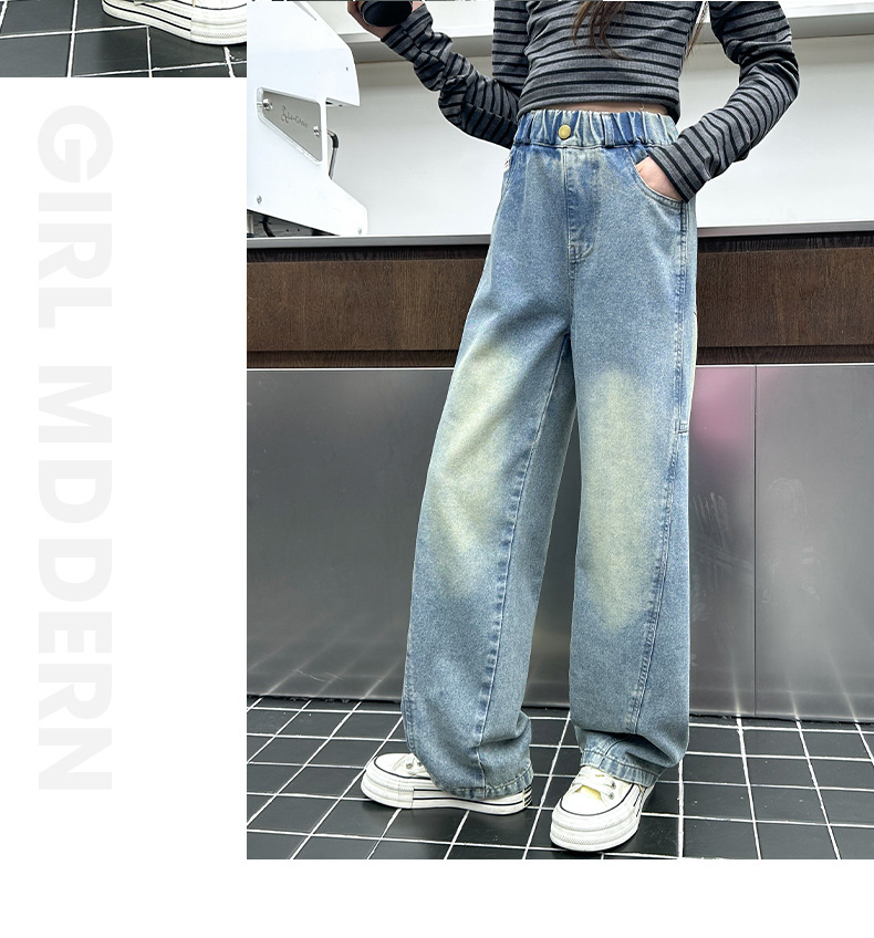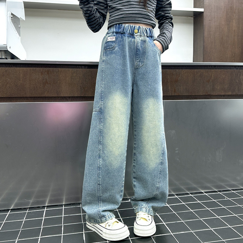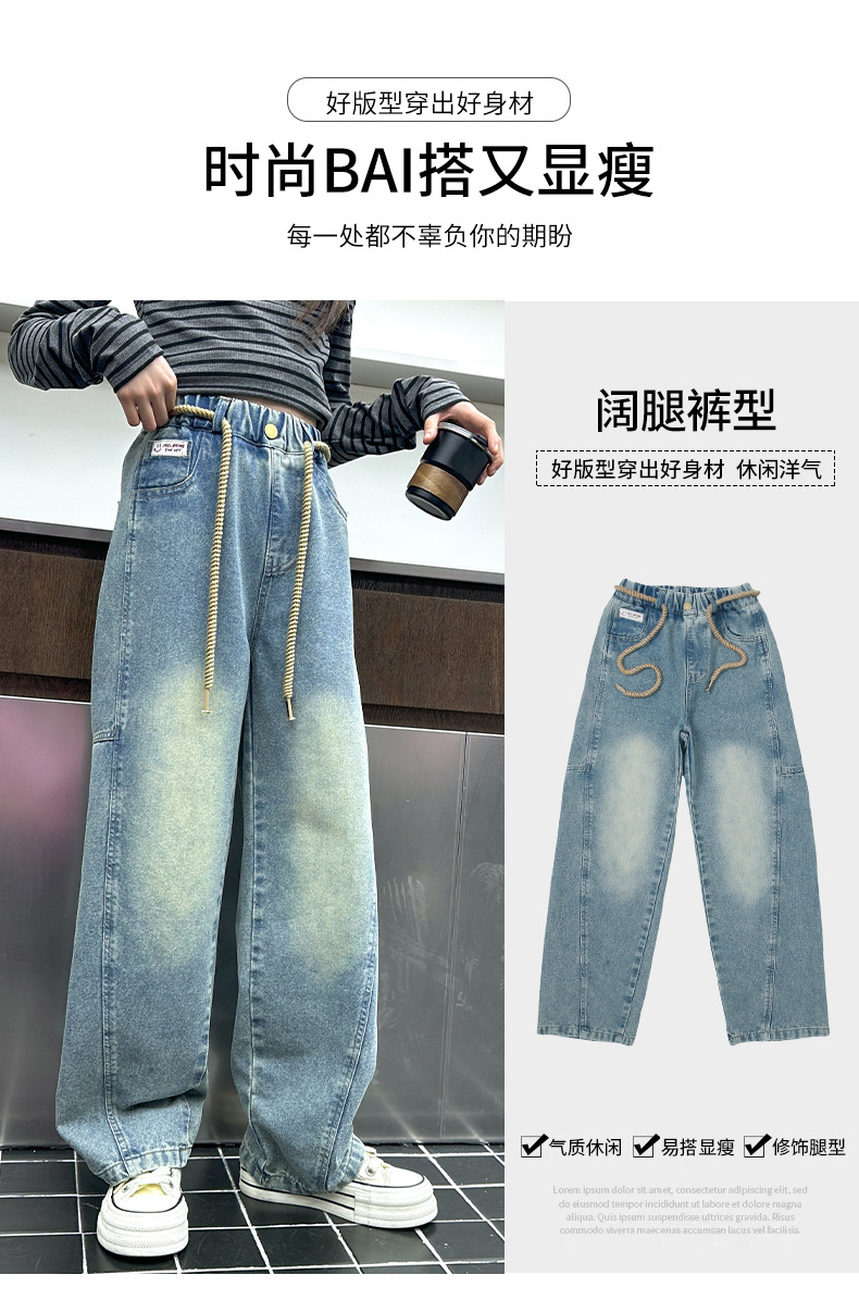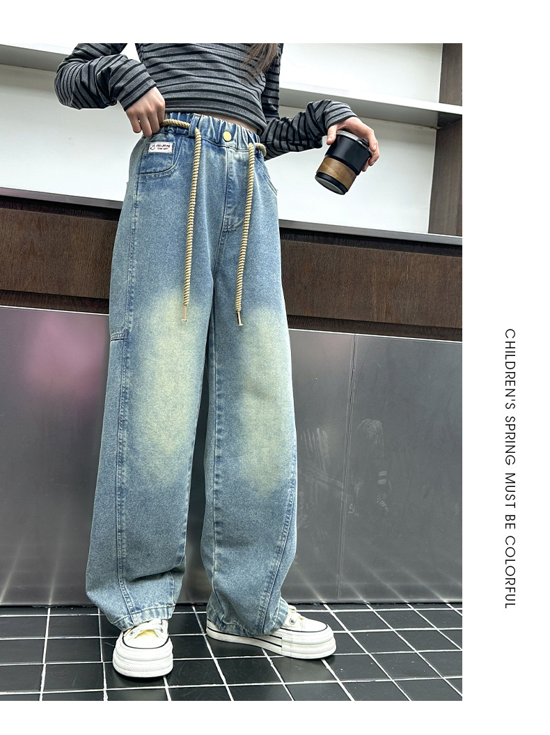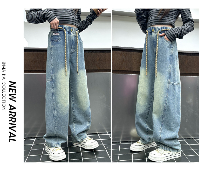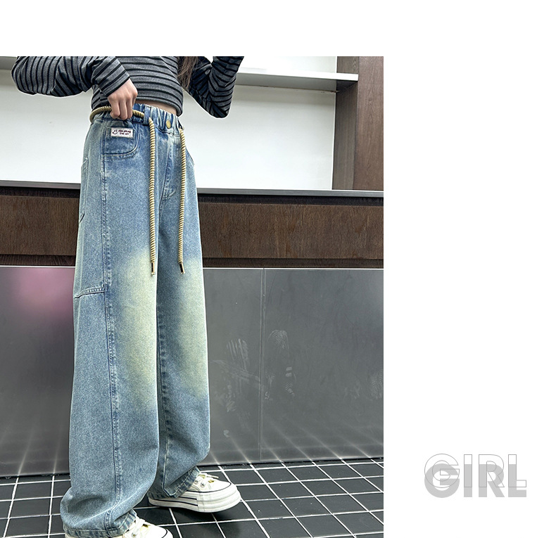여아용 드로우 스트링 캐주얼 청바지 유럽과 미국 아동복 걸스 스트레이트 와이드 레그 팬츠 대외 무역 아동용 루즈 트렌디 팬츠스토어 가기