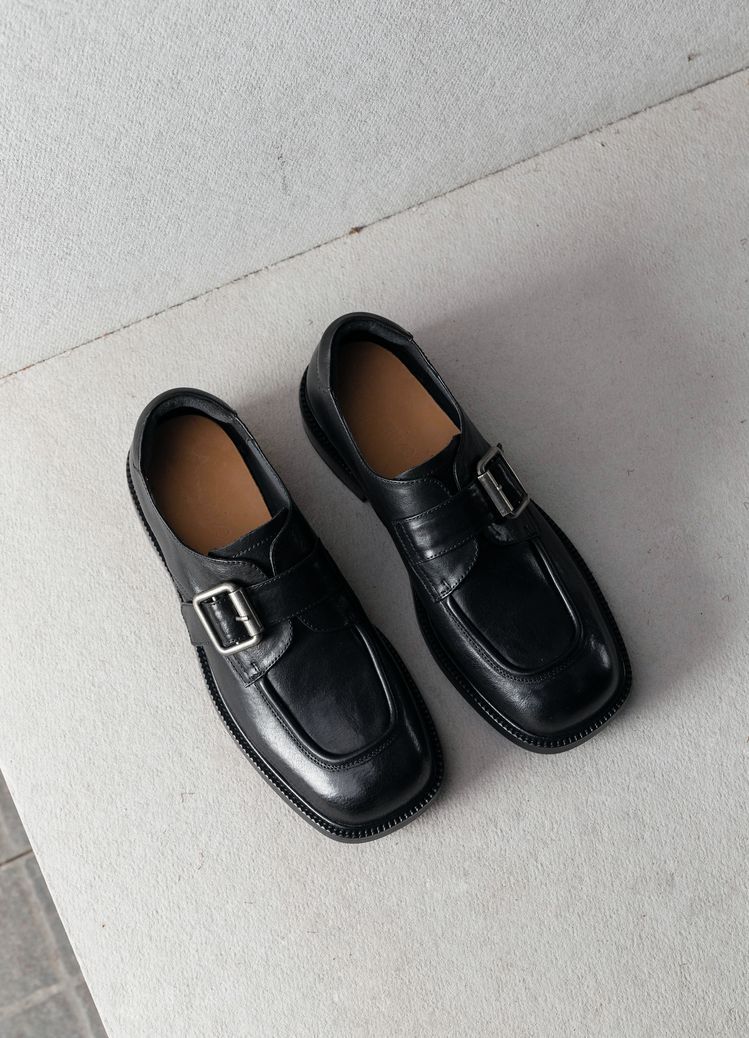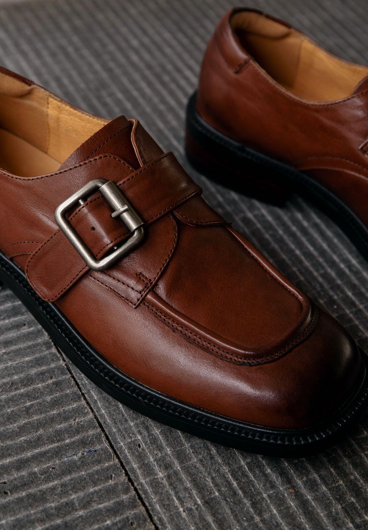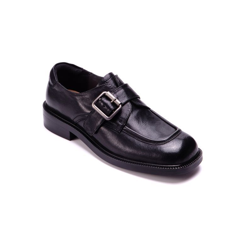 Cowhide 정품 가죽 두꺼운 바닥 다크 브라운 광장 발가락 작은 가죽 신발 여성 영국 스타일 빈티지 스퀘어 버클 두꺼운 힐 로퍼 여성 싱글 레이어 신발스토어 가기
