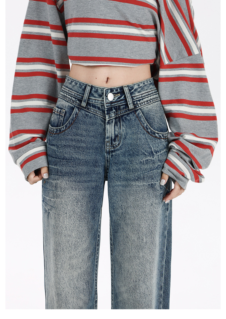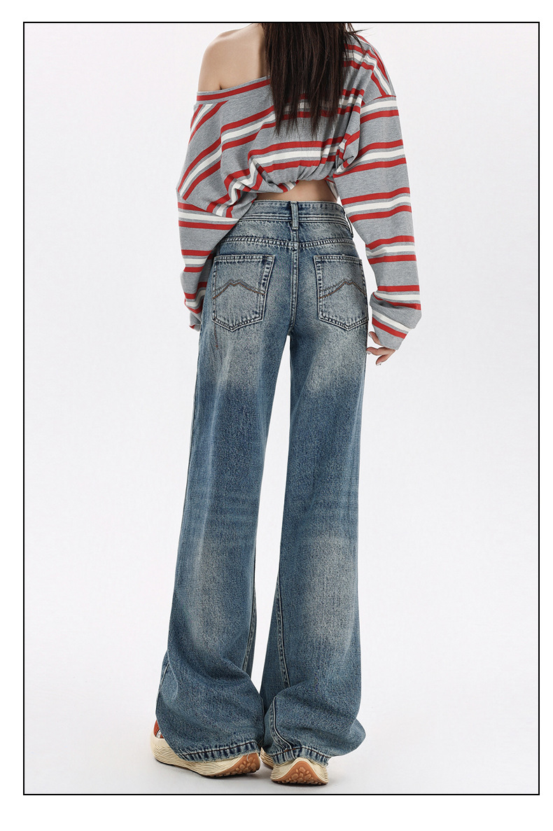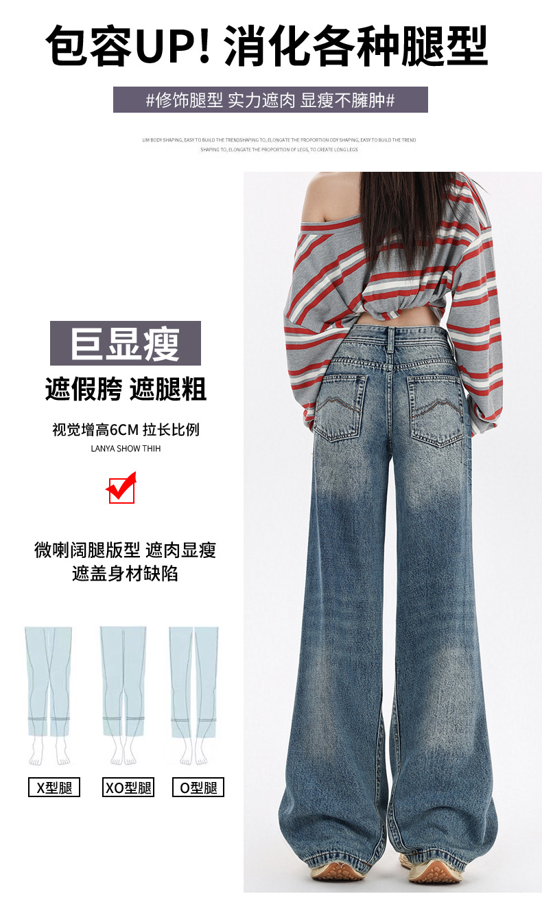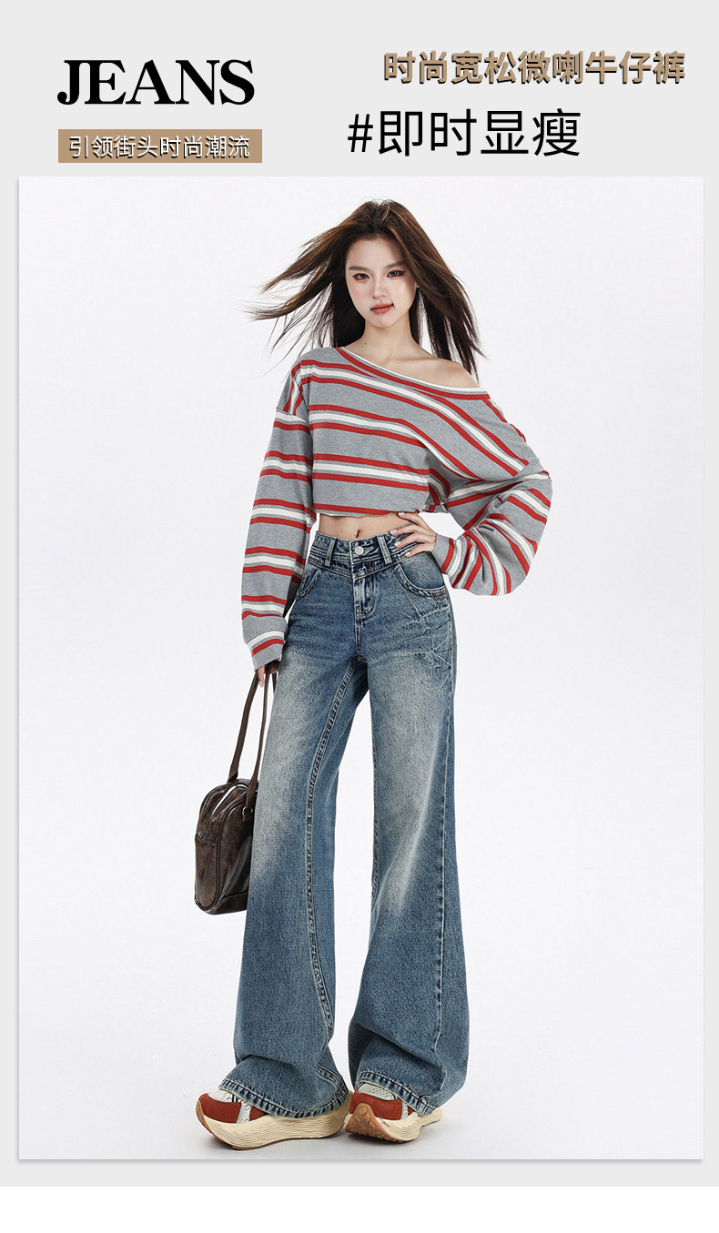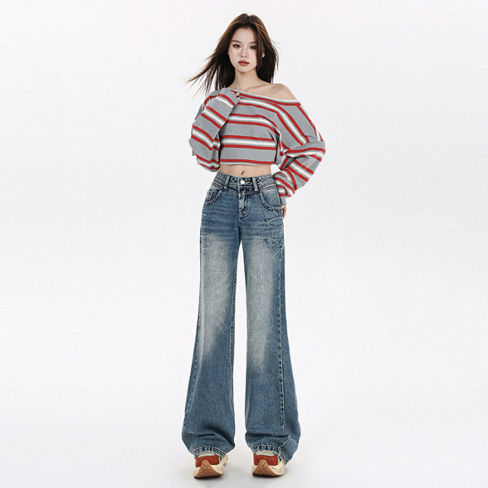 미국식 레트로 마이크로 라르 청바지 여성의 2025 년 봄 새로운 도착 균열 낮은 허리 느슨한 딥 스트레이트 플레어 바지