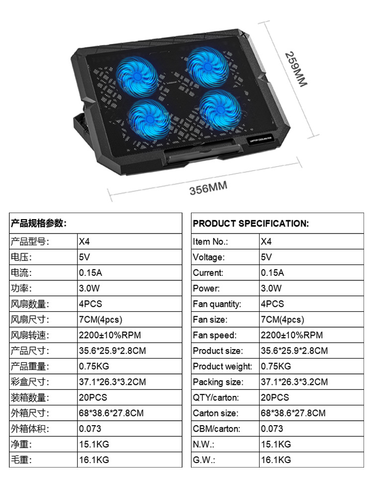 7档高低调节4风扇支架 调速无噪音底座笔记本电脑散热器 X4