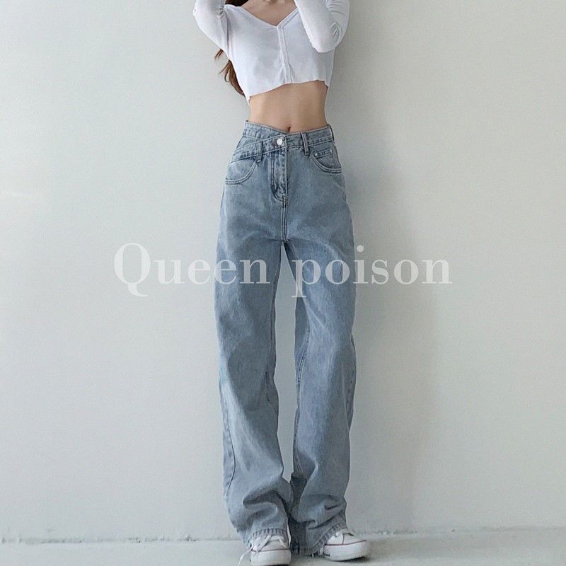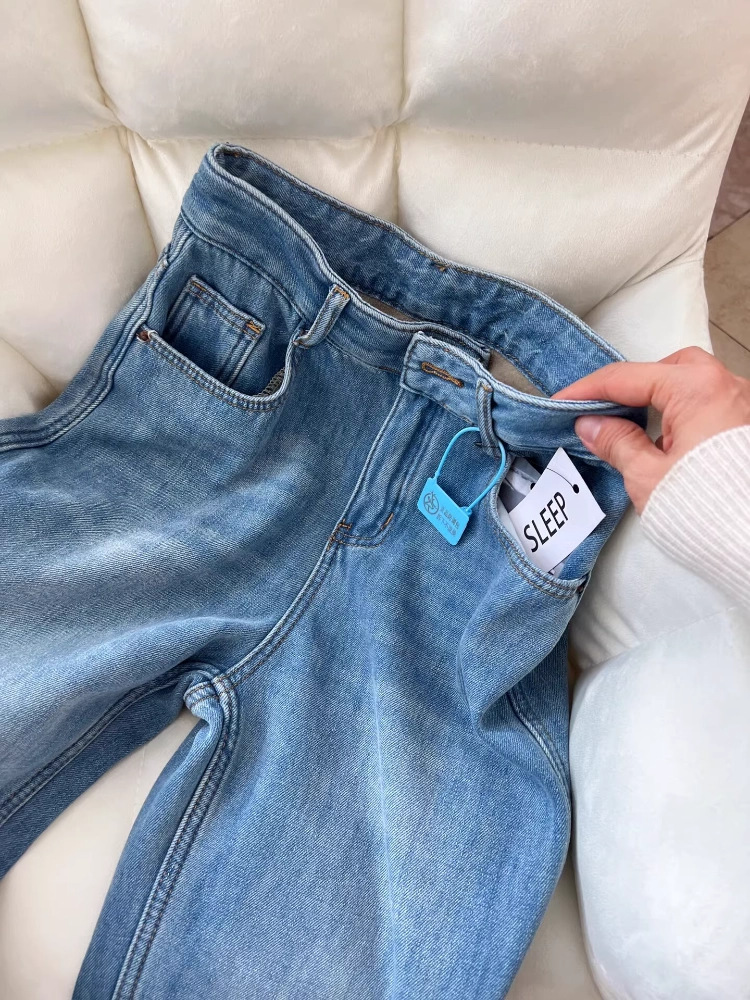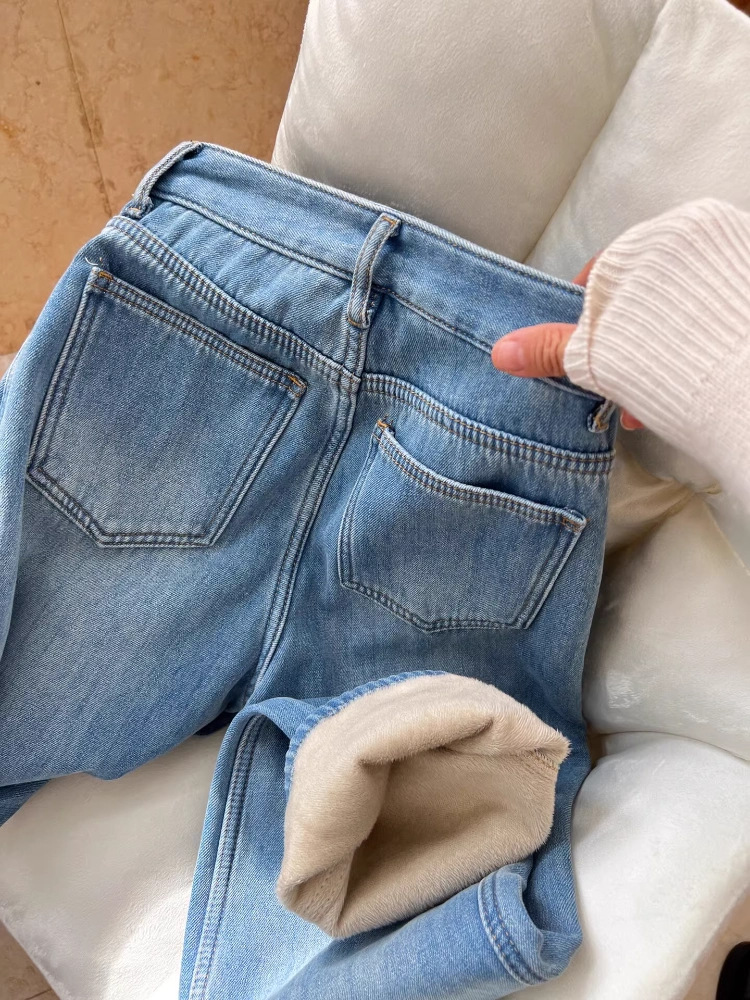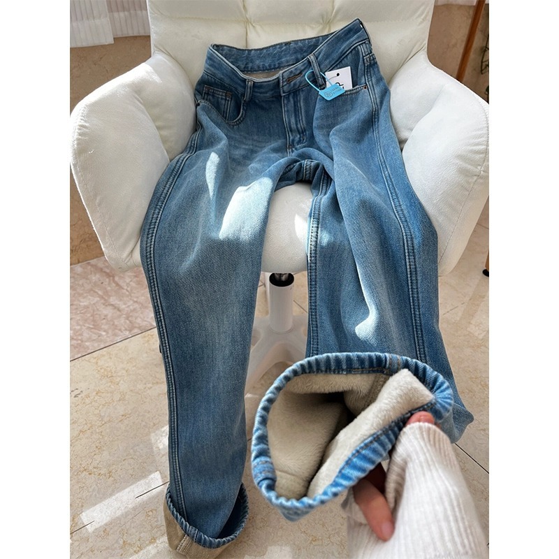 작은 기모 레트로 스트레이트 청바지 여성의 가을과 겨울 새로운 높은 허리 느슨한 넓은 다리 슬리밍 유행 유행 유행 바지스토어 가기