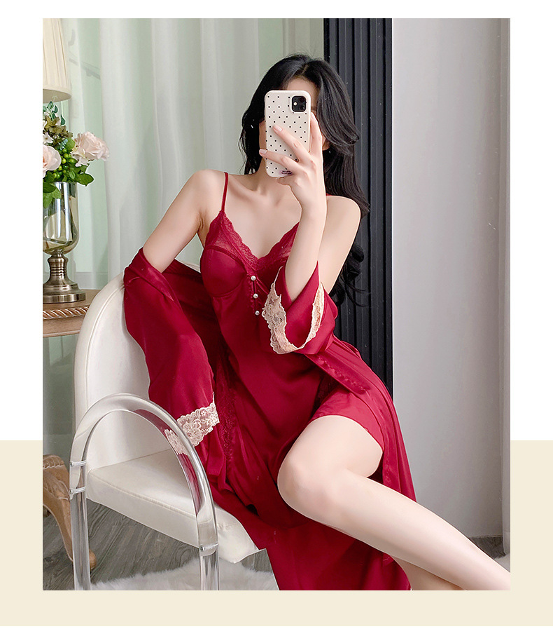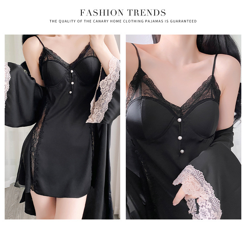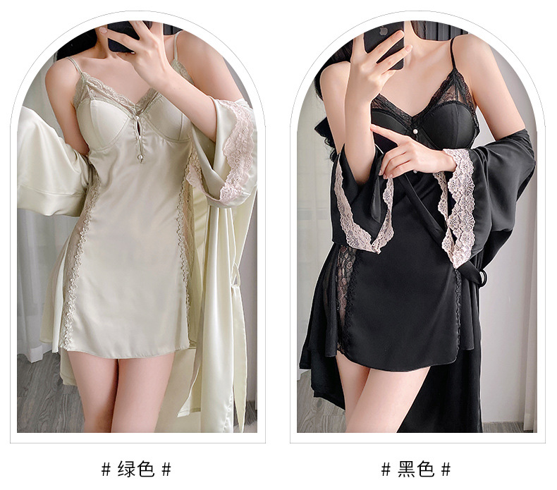 순수하고 섹시하며 귀여운 잠옷 세트, 아이스 실크 슬립 잠옷과 가운 투피스 세트, 여성용 부드러운 홈웨어