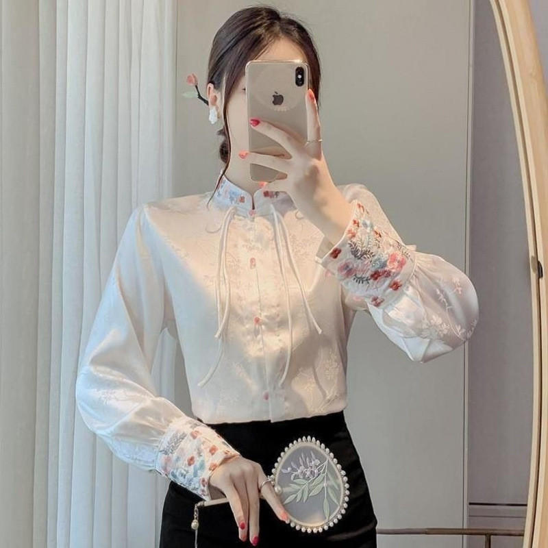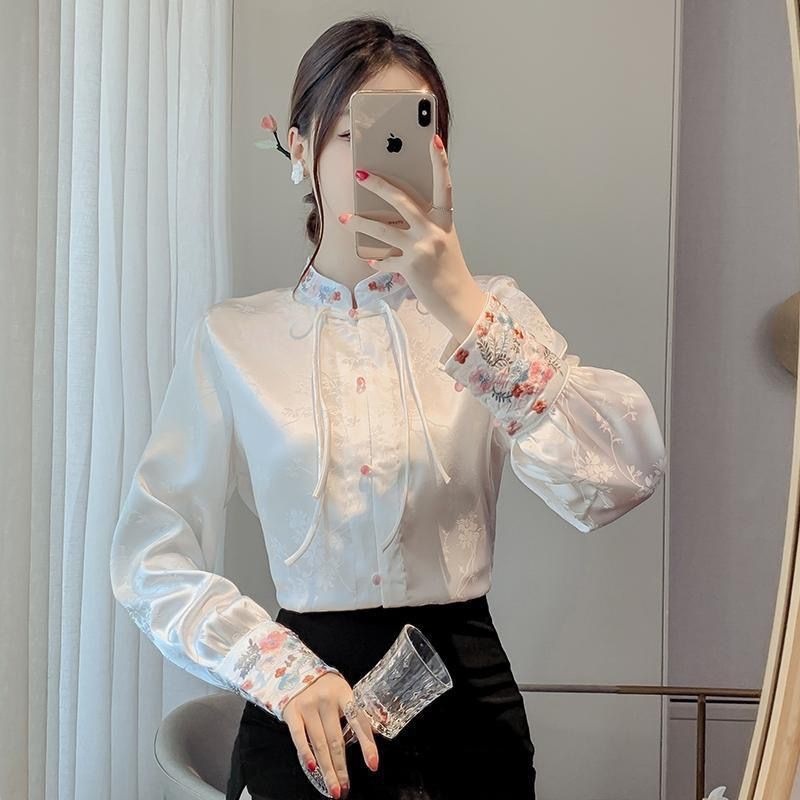 새로운 중국 스타일 수직 칼라 국가 스타일 셔츠 여성의 2025 기모 버클과 긴 소매 자수 셔츠스토어 가기