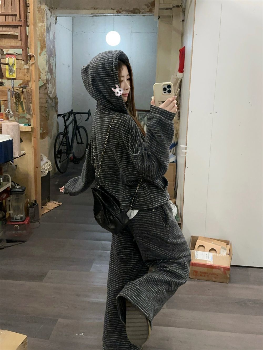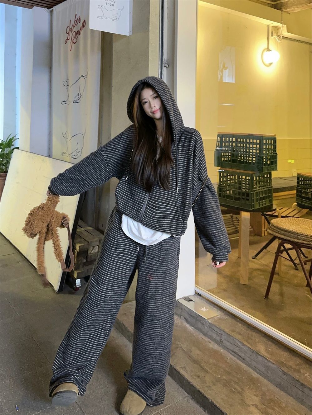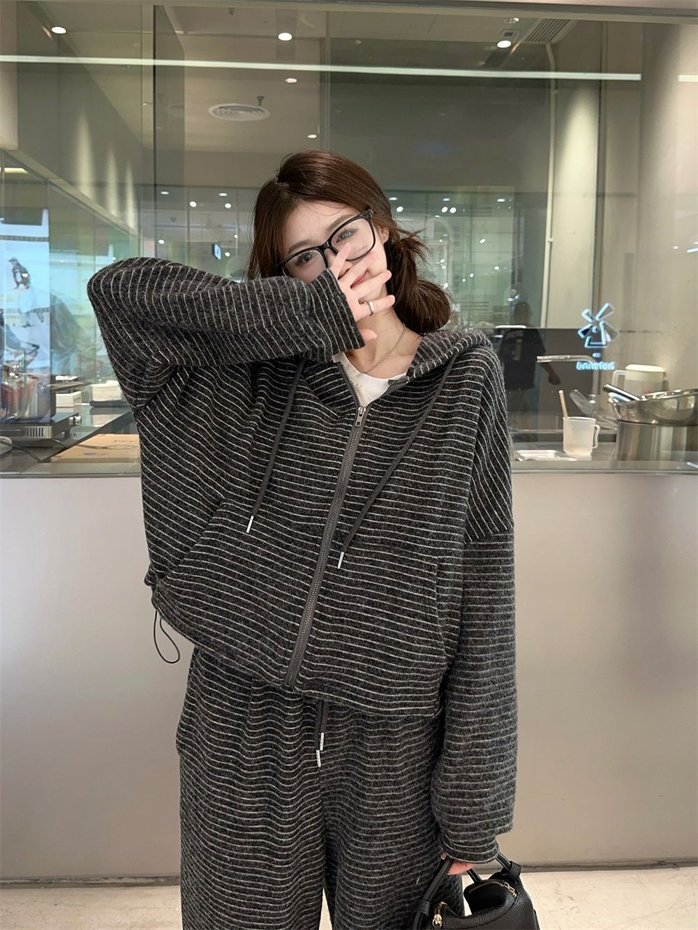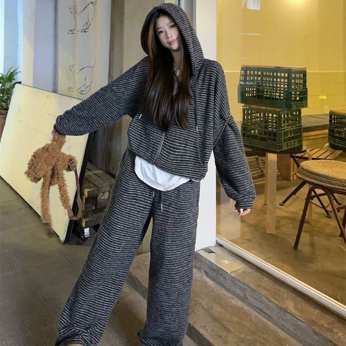 캐주얼 패션 봉제 줄무늬 세트 2024 새로운 여성의 가을 슬림 스포츠 스웨터 와이드 다리 바지 투피스 세트스토어 가기